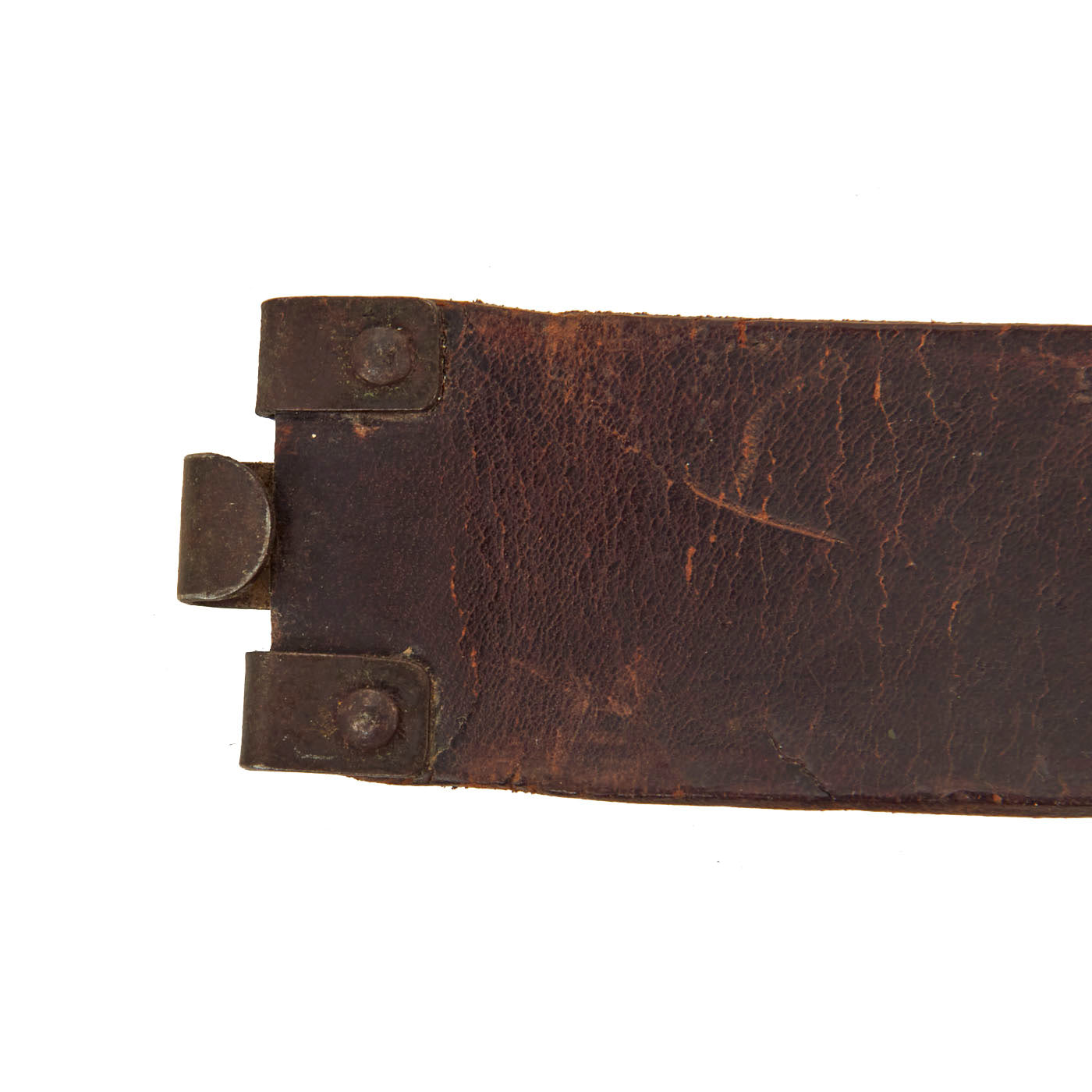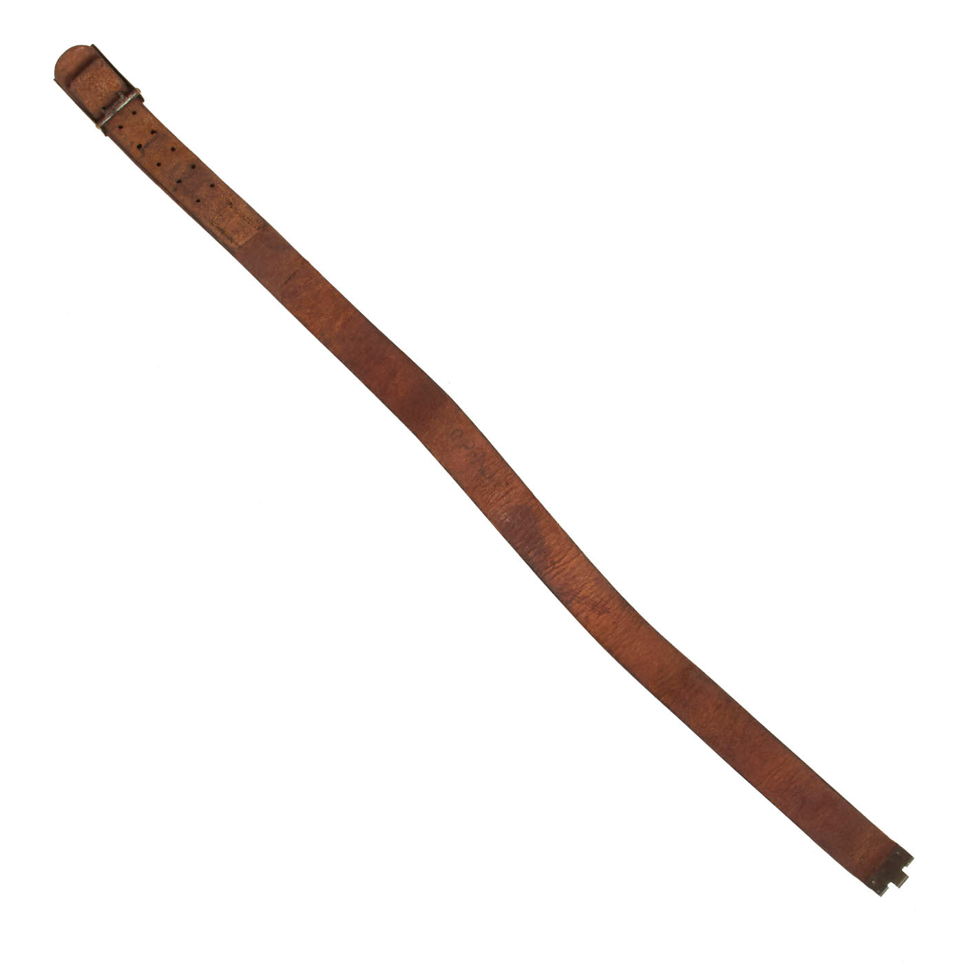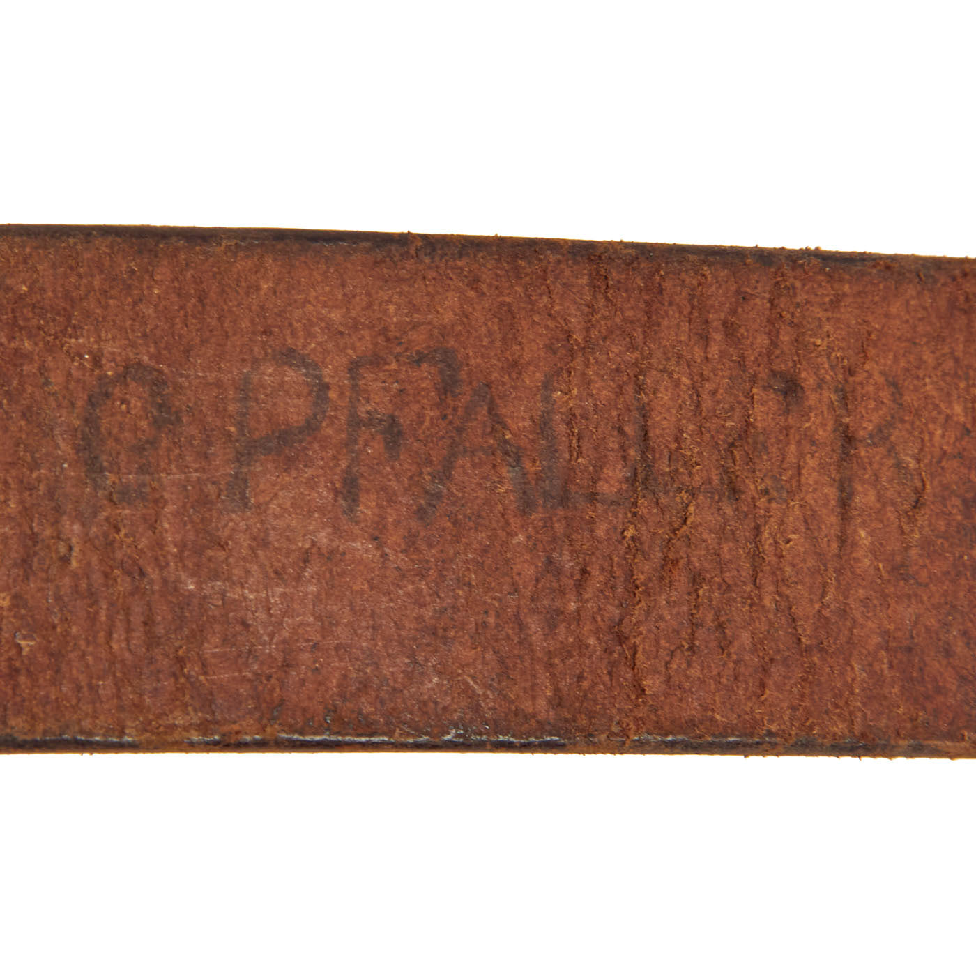 The belt itself measures about 31” when fully extended, and looks to have a name written on the inside, which we cannot make out. The leather is in very good condition, and has most of the brown finish on the outside of the belt. The interior is the correct unfinished brown leather. The leather is a bit stiff due to age, and there is cracking on the interior and exterior.