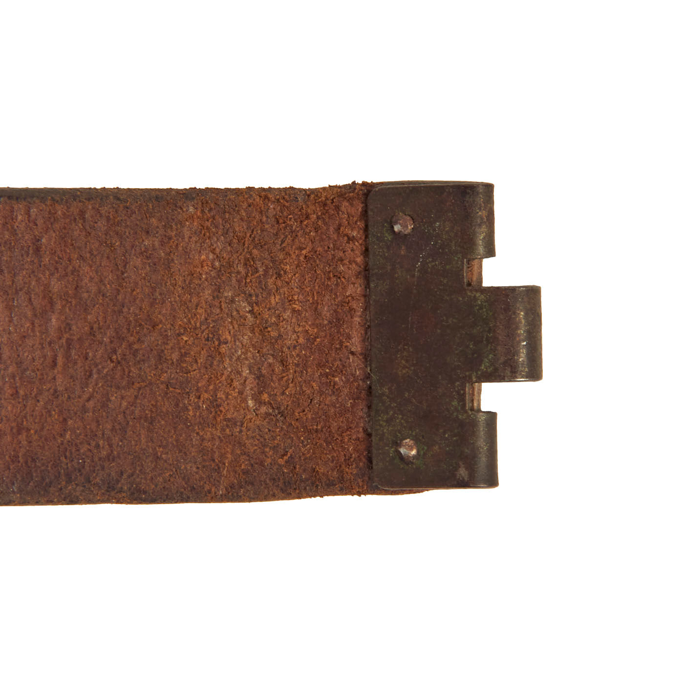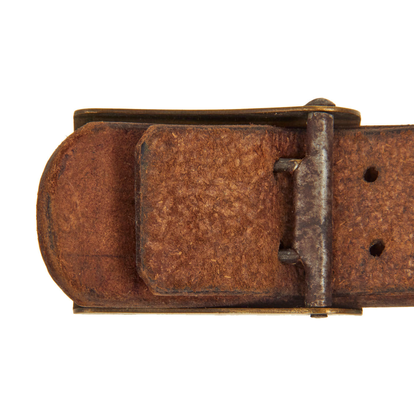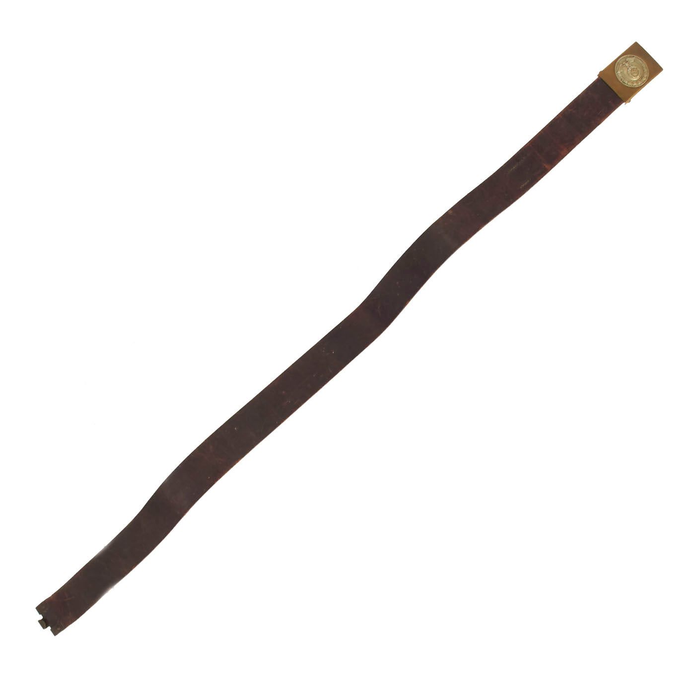 The belt itself measures about 31” when fully extended, and looks to have a name written on the inside, which we cannot make out. The leather is in very good condition, and has most of the brown finish on the outside of the belt. The interior is the correct unfinished brown leather. The leather is a bit stiff due to age, and there is cracking on the interior and exterior.