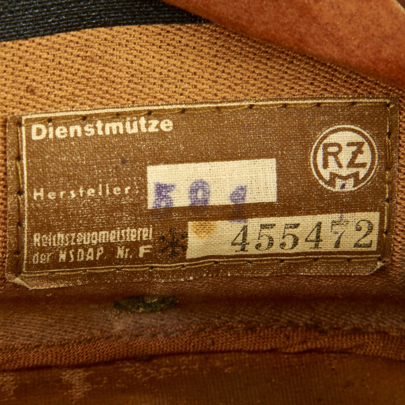 The inside of the cap under the sweatband still bears its original fabric RZM tag, which is also in great shape. The tag identifies the cap as a Dienstmütze (Service Cap) features the RZM logo as well as the ink stamped numerical designation of the Hersteller (manufacturer) 591 over lot No. 455472.