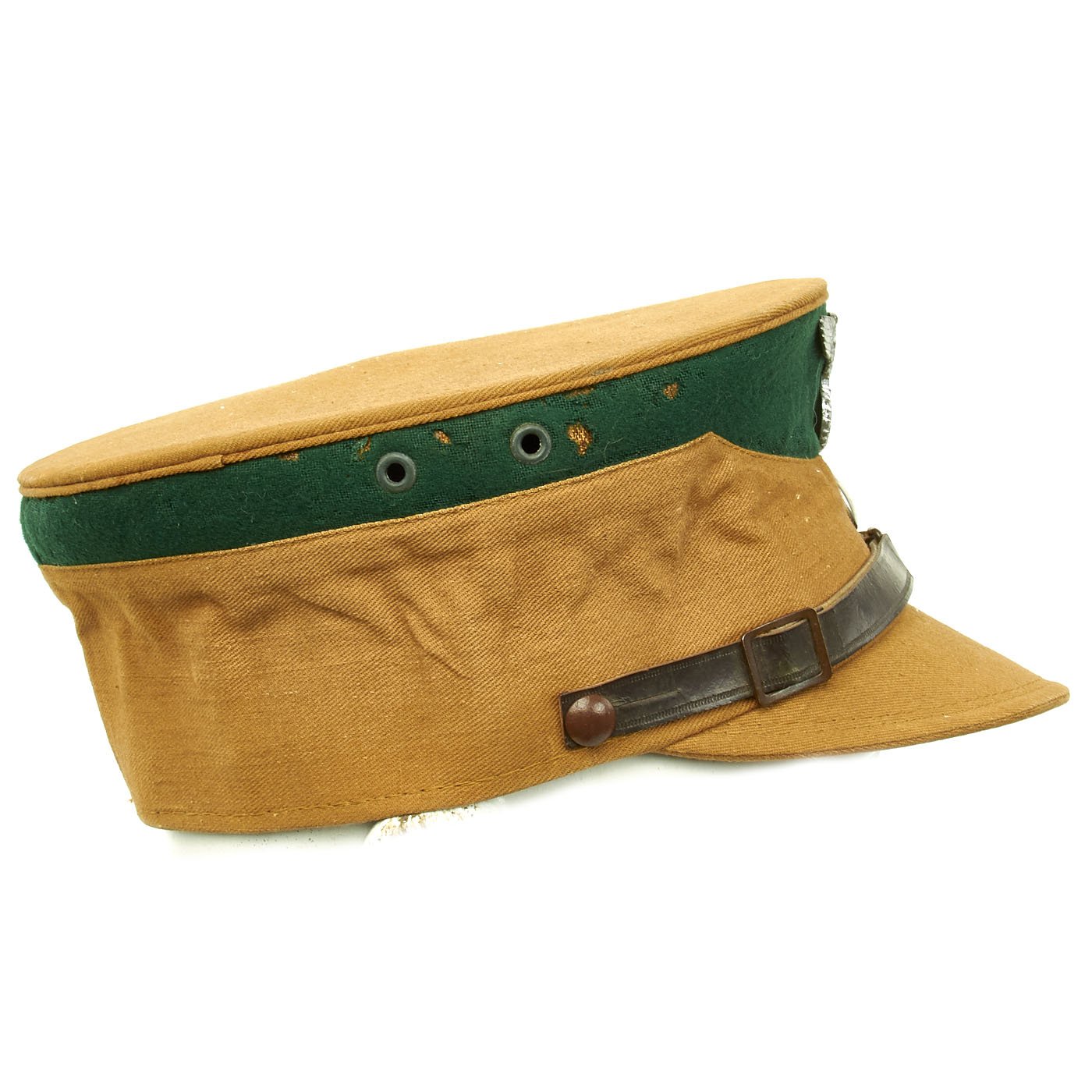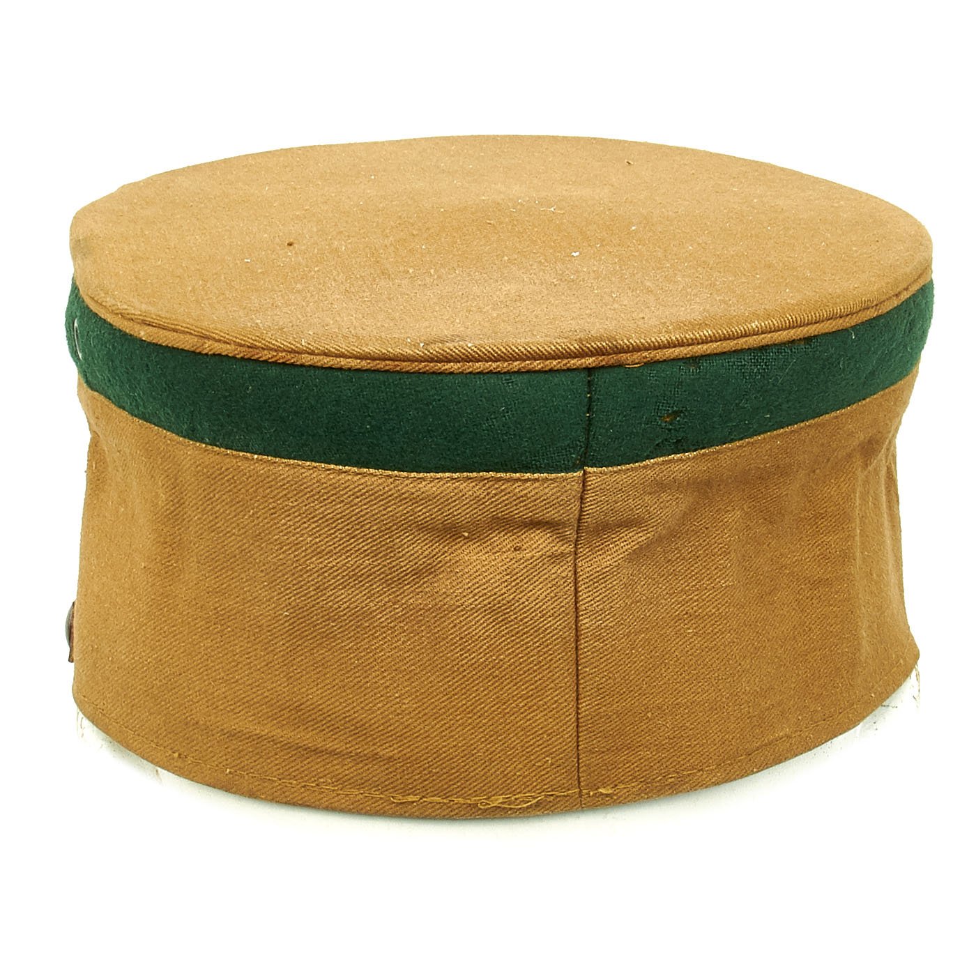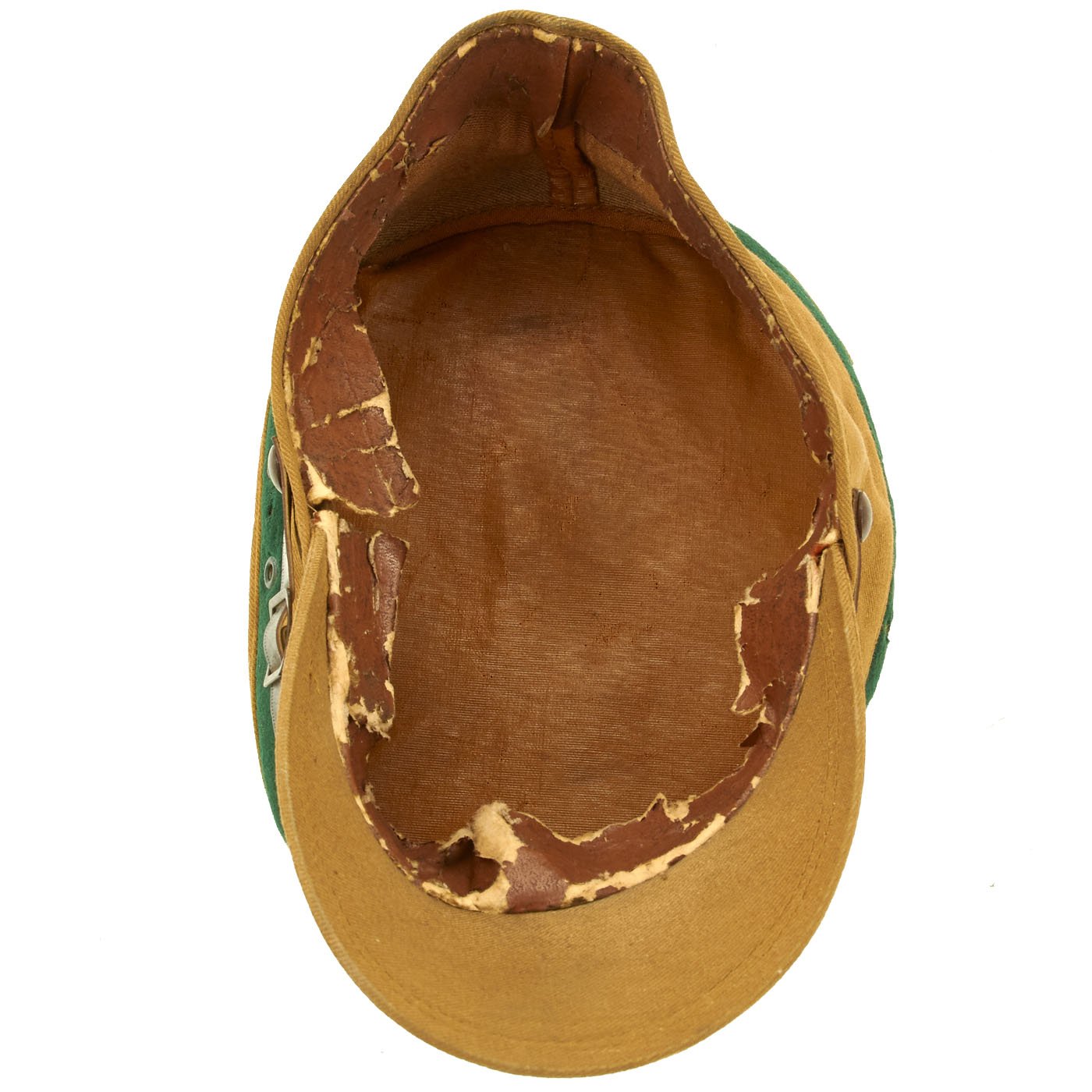 Condition of the kepi is good though it does show quite a bit of wear to the inside liner, which being pressed paper, did not hold up well over the years. The exterior has some light moth damage to the emerald green felt, however the canvas is really in great shape, with minimal staining and wear. The oil cloth crown is still fully intact, and the brim does not have any cracks or folds. These are rare in any condition, and this is definitely a very good example.