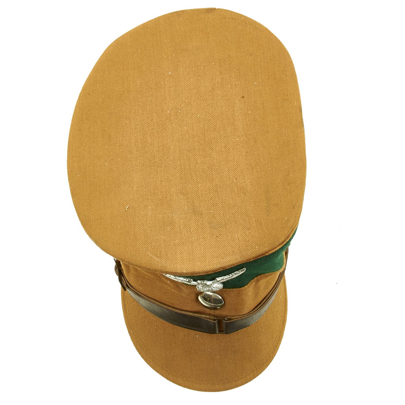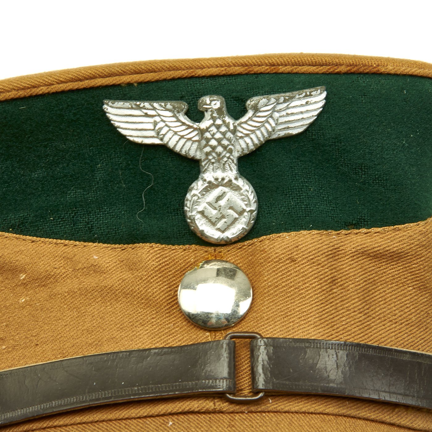 Original Item: Only One available. This is a very nice German WWII SA "Stormtrooper" Kepi (Dienstmütze), often called a "Coffee Can Hat." It is made of tan cotton fabric, with an emerald green felt top and silver "pip" button on the front. This indicates use by the SA Gruppe Sachsen (Saxony), which was formed from the State (previously Kingdom) of Saxony. The major cities are Dresden and Leipzig, and this is an area of Germany with a long history.
