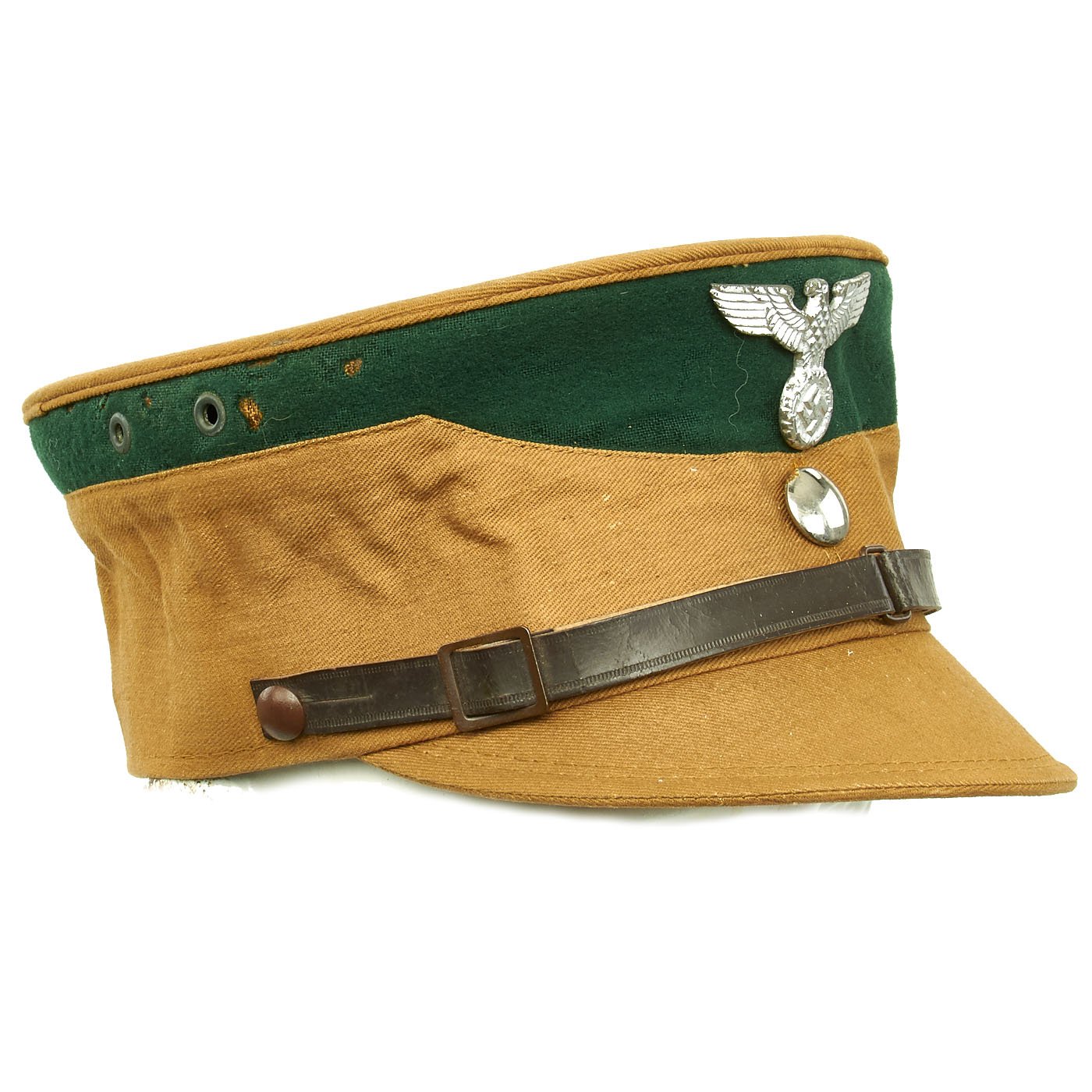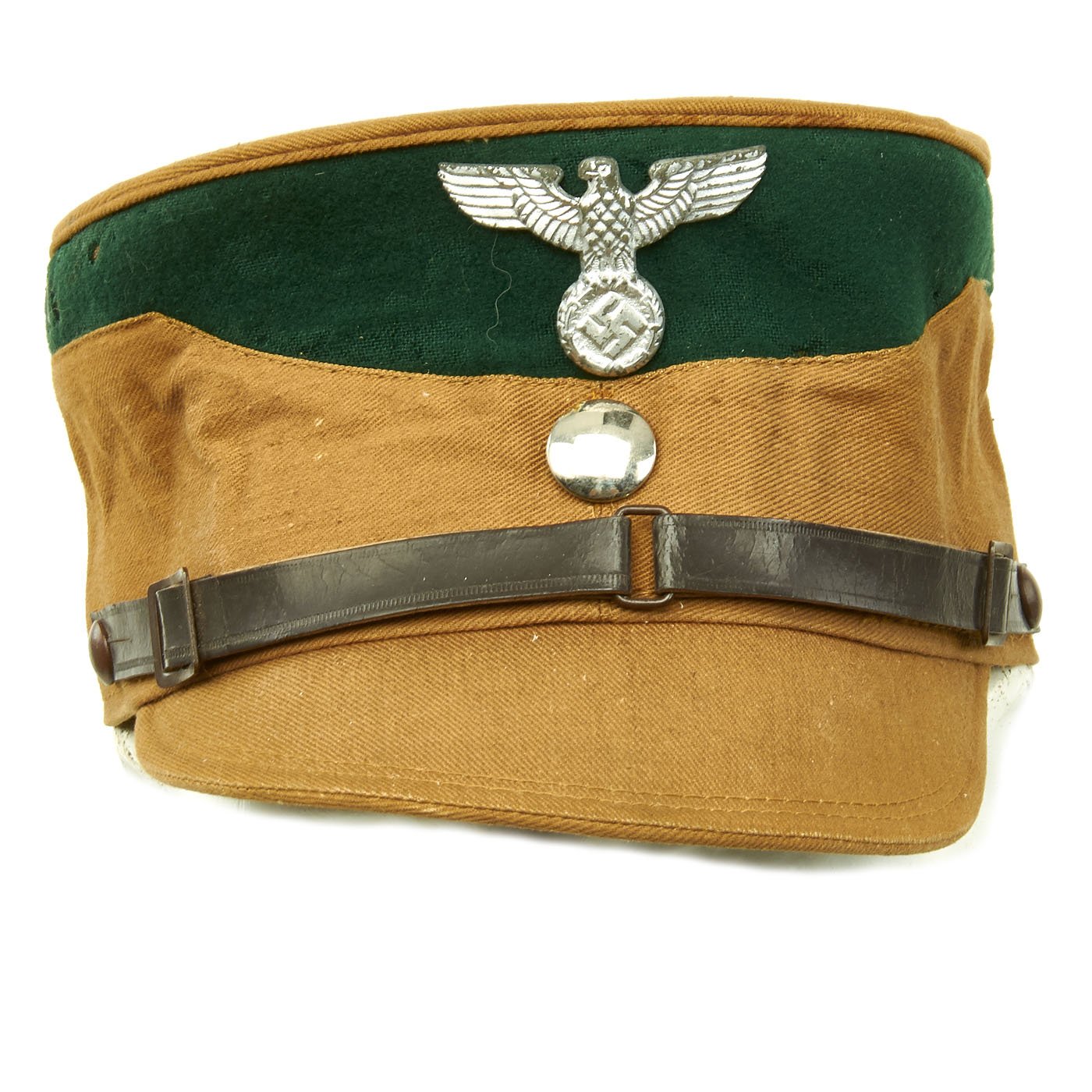 These caps were worn by SA personnel, especially the "Stormtrooper" groups. It is made from heavy tan canvas, with an aluminum Reichsadler (National Eagle) on the front top. There is a nice dark brown leather chinstrap, held in place by the correct chocolate brown buttons. The interior has an oil cloth crown lining, with a pressed paper faux leather liner.