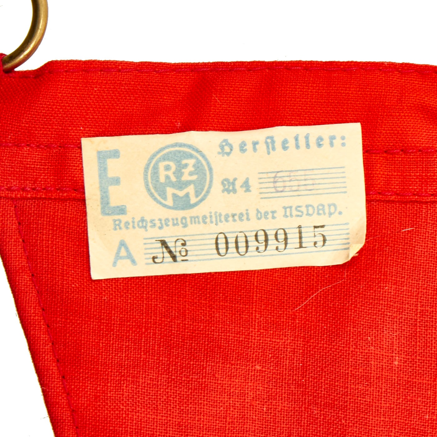 The pennant shows minor age toning, but was definitely never issued. It remains crisp and pristine. The rear still features the original RZM tag which is also very nice, with age toning and a bit of folding on the edge. The tag has a correct “E” tax code and features the RZM logo as well as the ink stamped numerical designation of the hersteller (manufacturer) A4/655 over lot No. 009915. This SA vehicle pennant is an outstanding example that would be nearly impossible to upgrade.