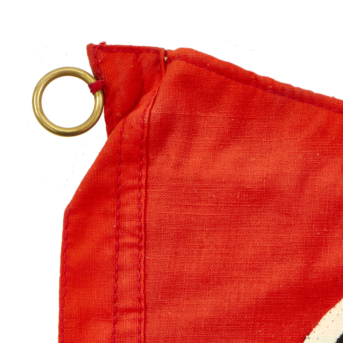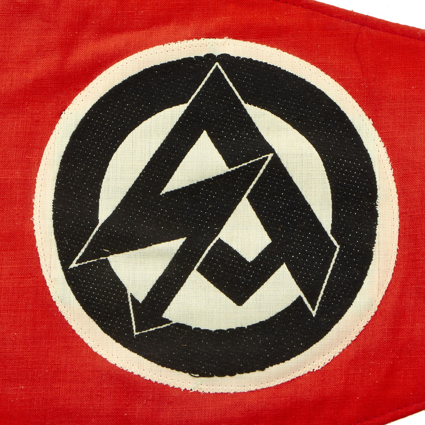 The overall condition of this extremely attractive SA vehicle pennant is excellent, with no signs of being used. Constructed of cotton, this flag is in unissued condition, with almost no signs of age. The red backing remains bright and vibrant. Its double sided, with each side bearing a machine woven, round Bevo style representation of an SA organizational emblem, black on a white background. Pennant measures 14 ½” long by 9 ½” tall. There are 3 brass hanging rings attached to the header at the top and bottom.