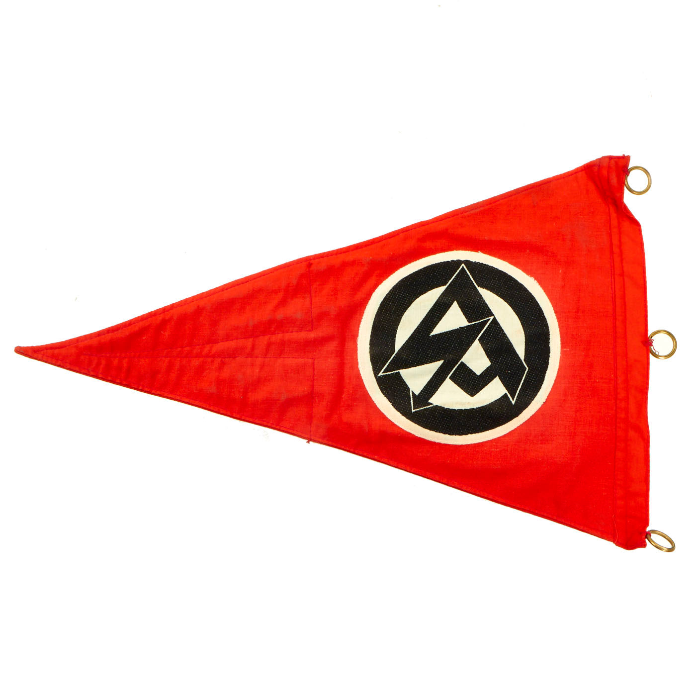 Original Item: Only One Available. This is a beautiful example of a desirable SA Vehicle Wimpel (Pennant), which would be flown on a small staff attached to the fender of the automobile or other vehicle it was attached to. The Sturmabteilung (Storm Detachment), often known as the "Brownshirts", were NSDAP Party's original paramilitary organization, and played a significant role in Adolf AH's rise to power in the 1920s and 1930s.