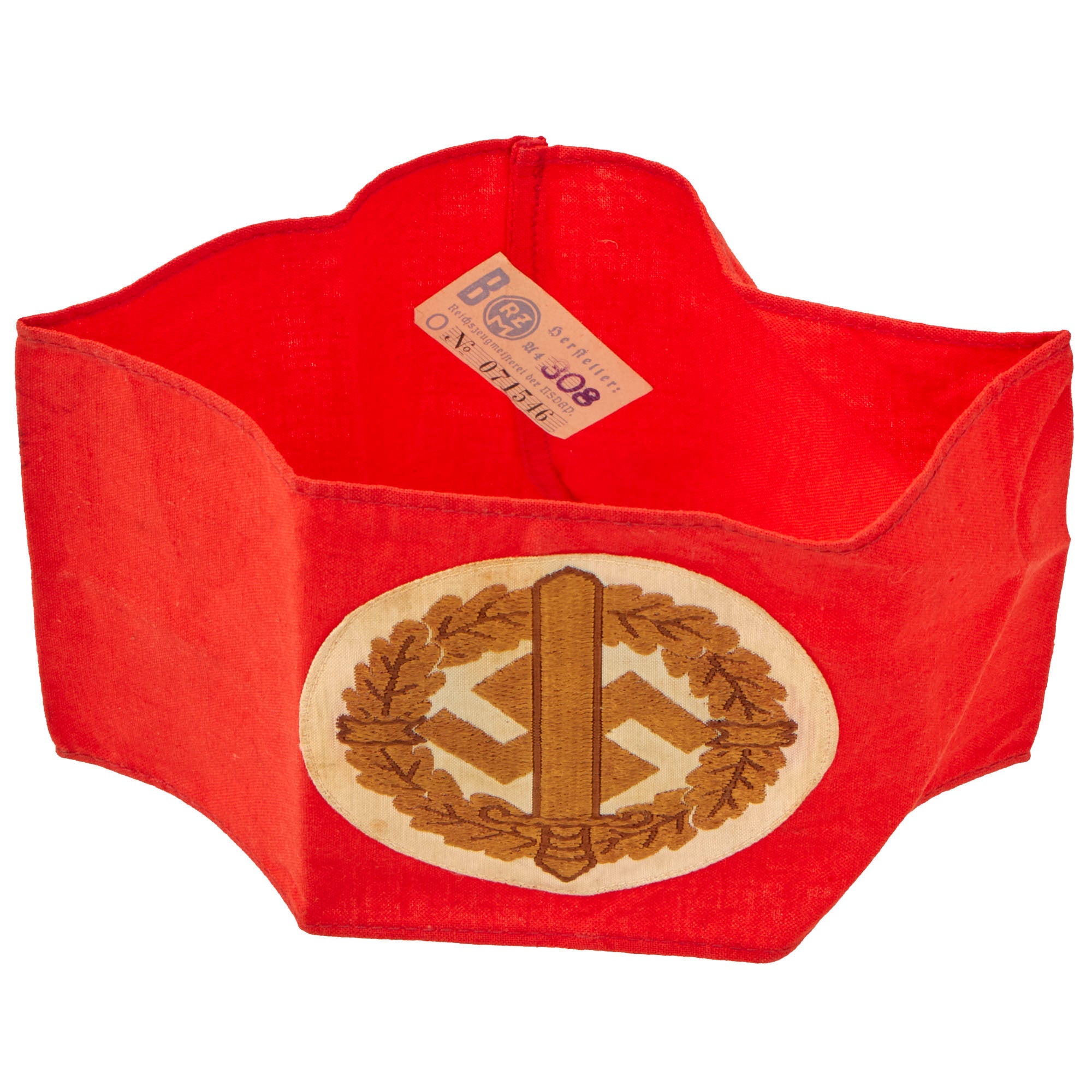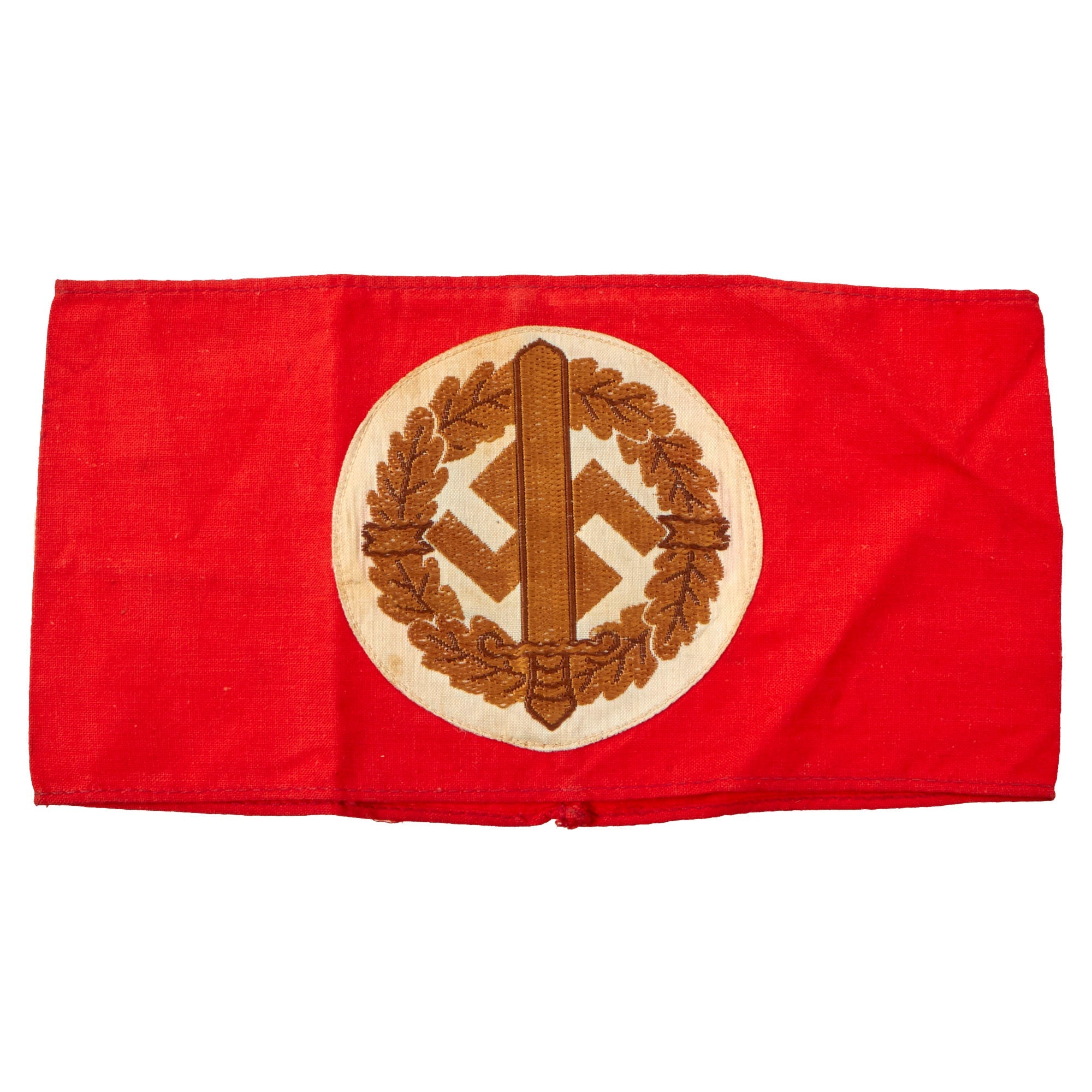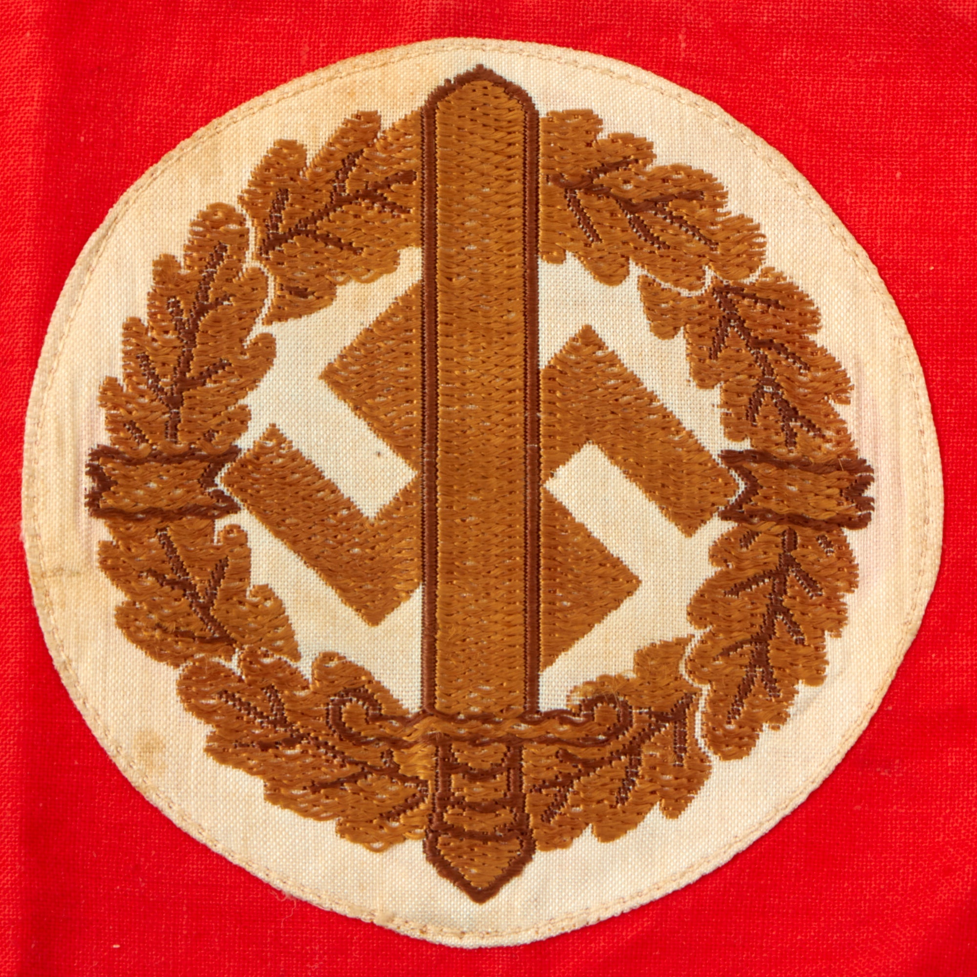 This example of the SA Wehrmannschaft armband is a one-look textbook original. It features a machine woven, Bevo style representation of an SA sports badge, in brown and gold thread on a white backing, machine stitched to a band made of a lightweight cotton material. The armband is in great shape with the color of the circle still fully retained, and there is a bit of folding and/or crumpling to the red band from storage. It measures approximately 17 1/2" x 4 1/4" and is sewn together in the back.