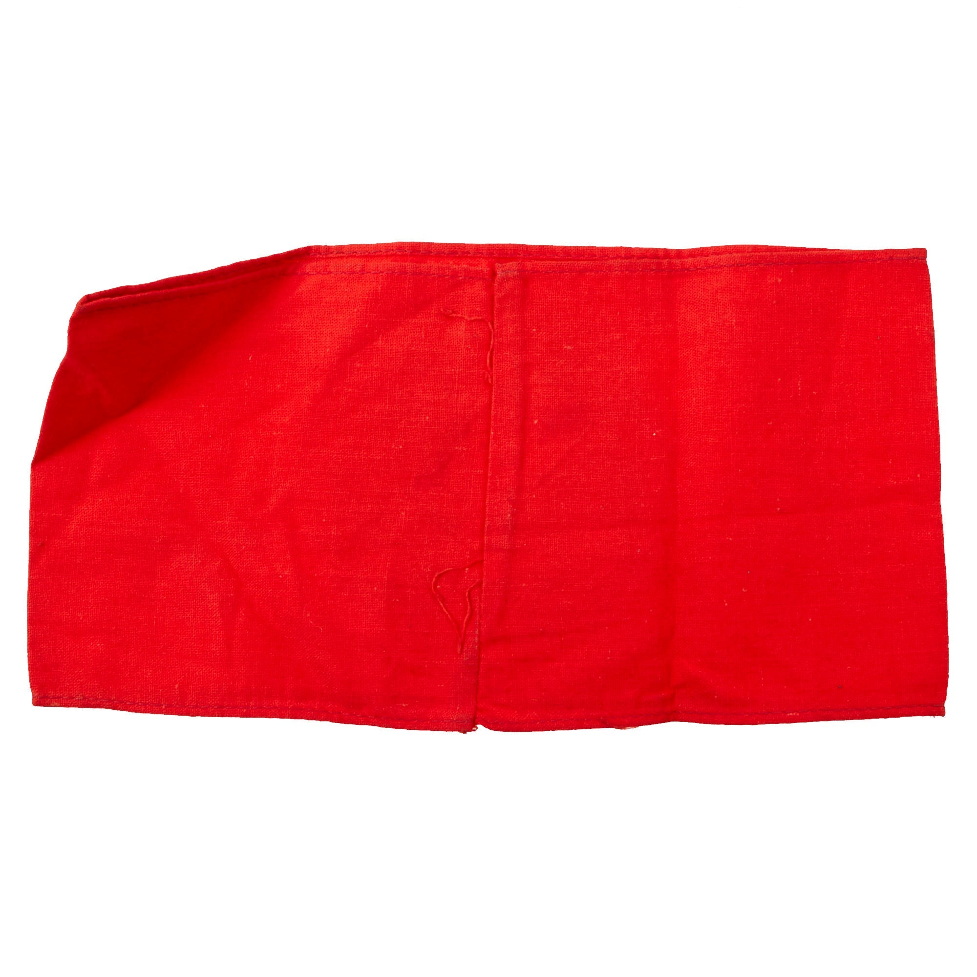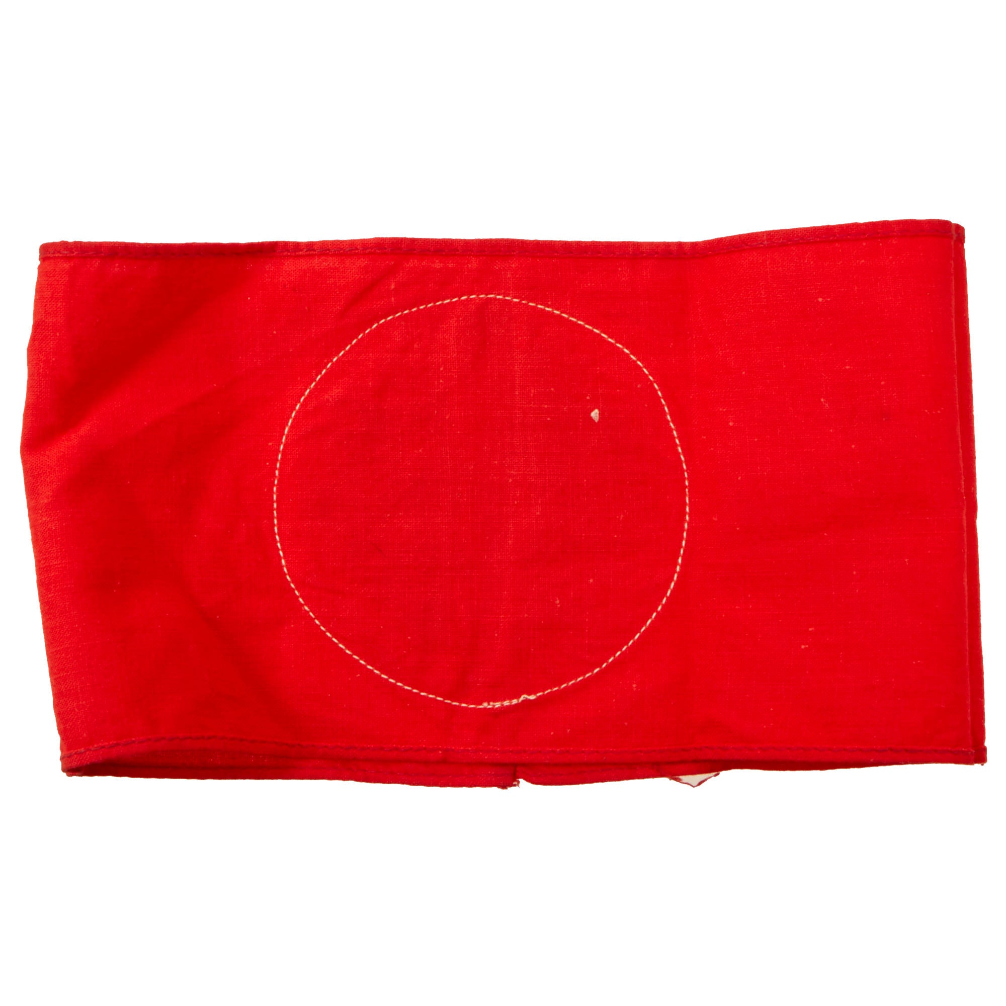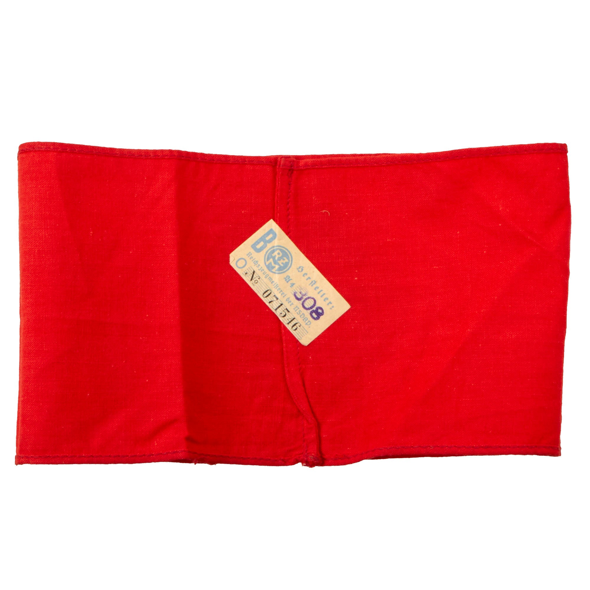 This example of the SA Wehrmannschaft armband is a one-look textbook original. It features a machine woven, Bevo style representation of an SA sports badge, in brown and gold thread on a white backing, machine stitched to a band made of a lightweight cotton material. The armband is in great shape with the color of the circle still fully retained, and there is a bit of folding and/or crumpling to the red band from storage. It measures approximately 17 1/2" x 4 1/4" and is sewn together in the back.