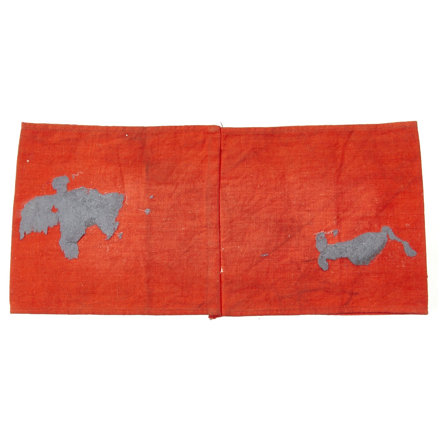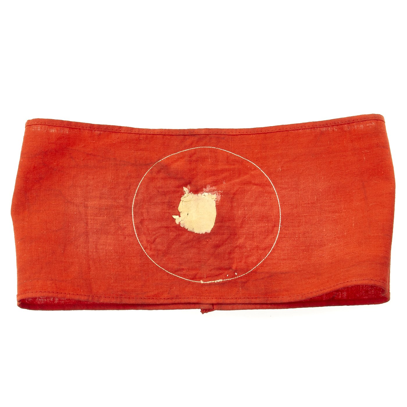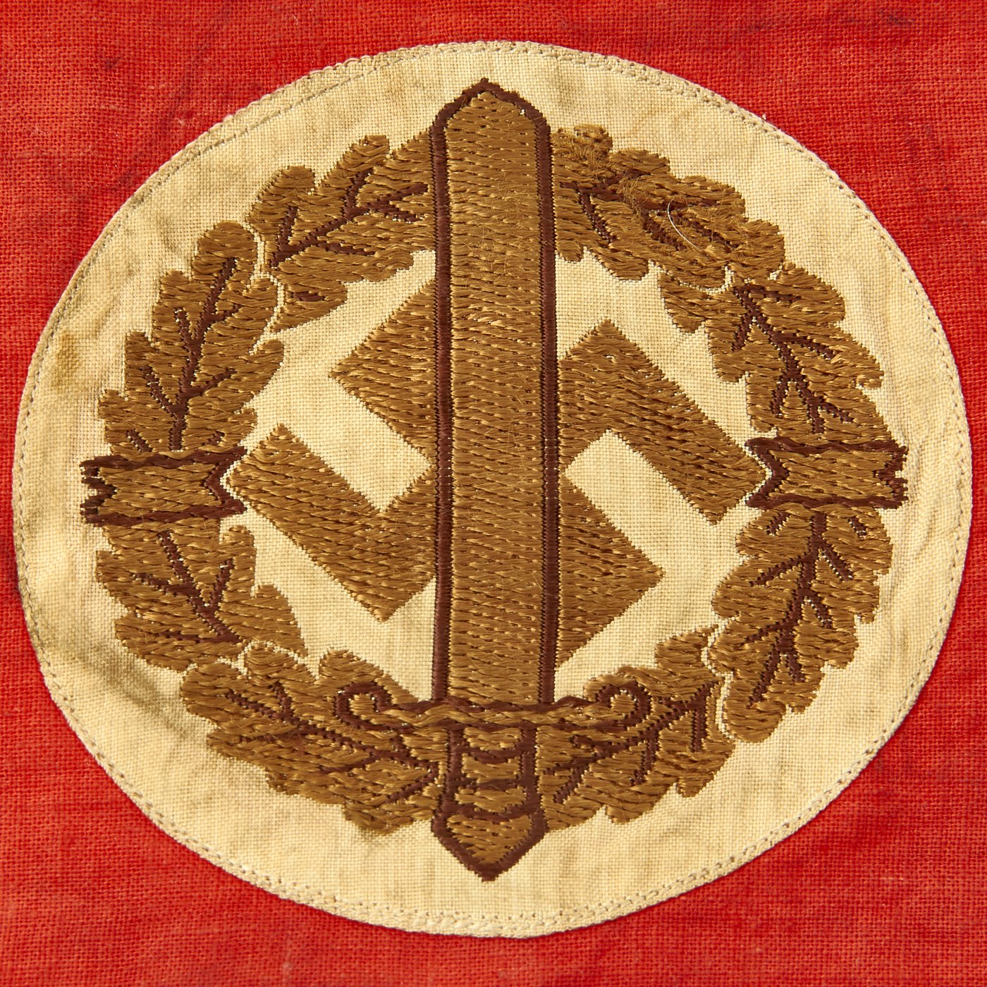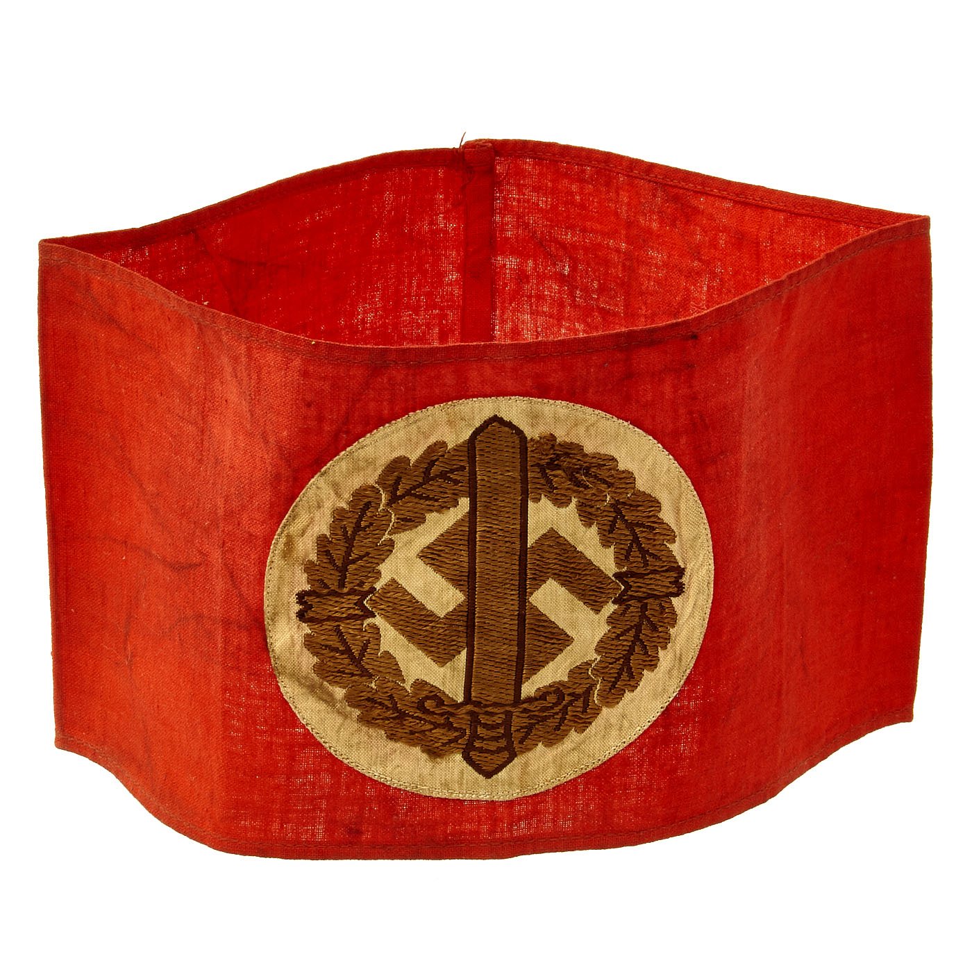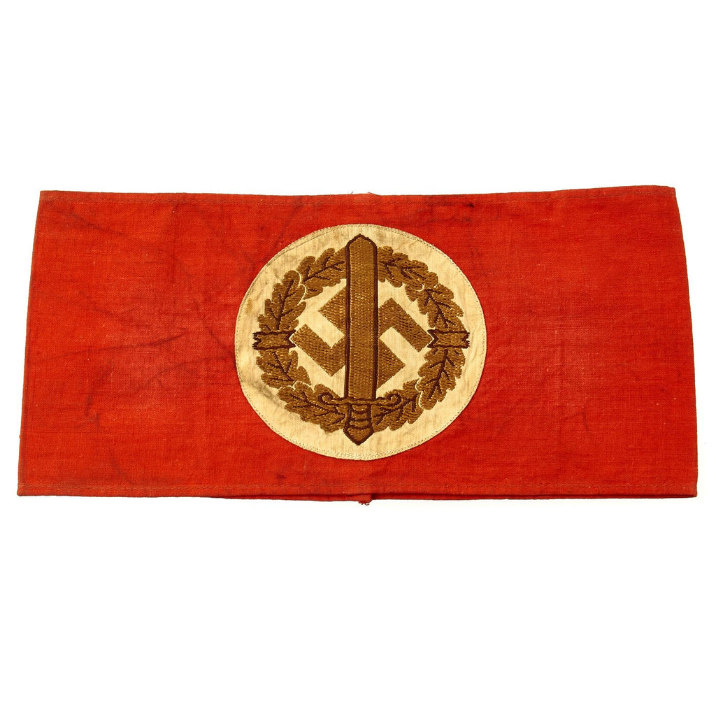 The Sturmabteilung-Wehrmannschaft (Storm Division Military Team) was the military training defense group of the SA and was formed in 1939. The purpose of this organization was to provide military training to SA members before and after their military service. By May, 1944, over 3 million Germans had participated in this program. This example of the SA Wehrmannschaft armband is a one-look textbook original. It features a machine woven, Bevo style representation of an SA sports badge, in brown and gold thread on a white backing, machine stitched to a band made of a thin red cotton material.