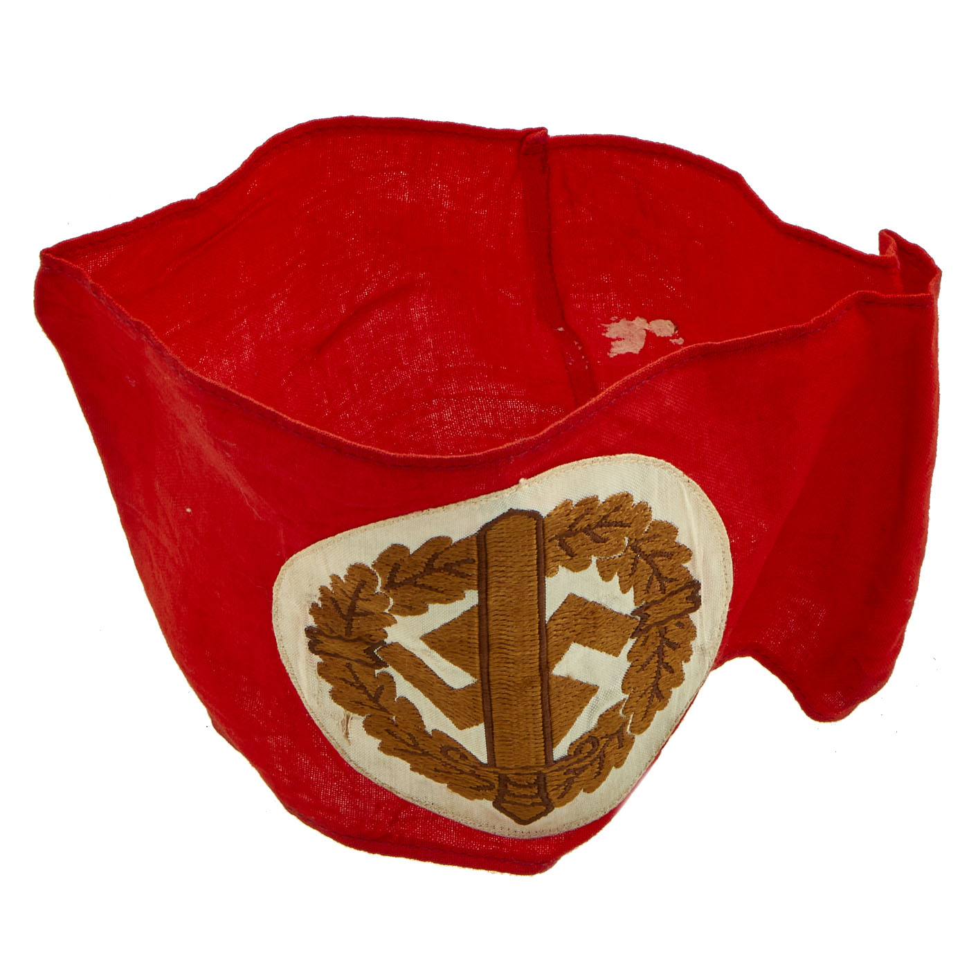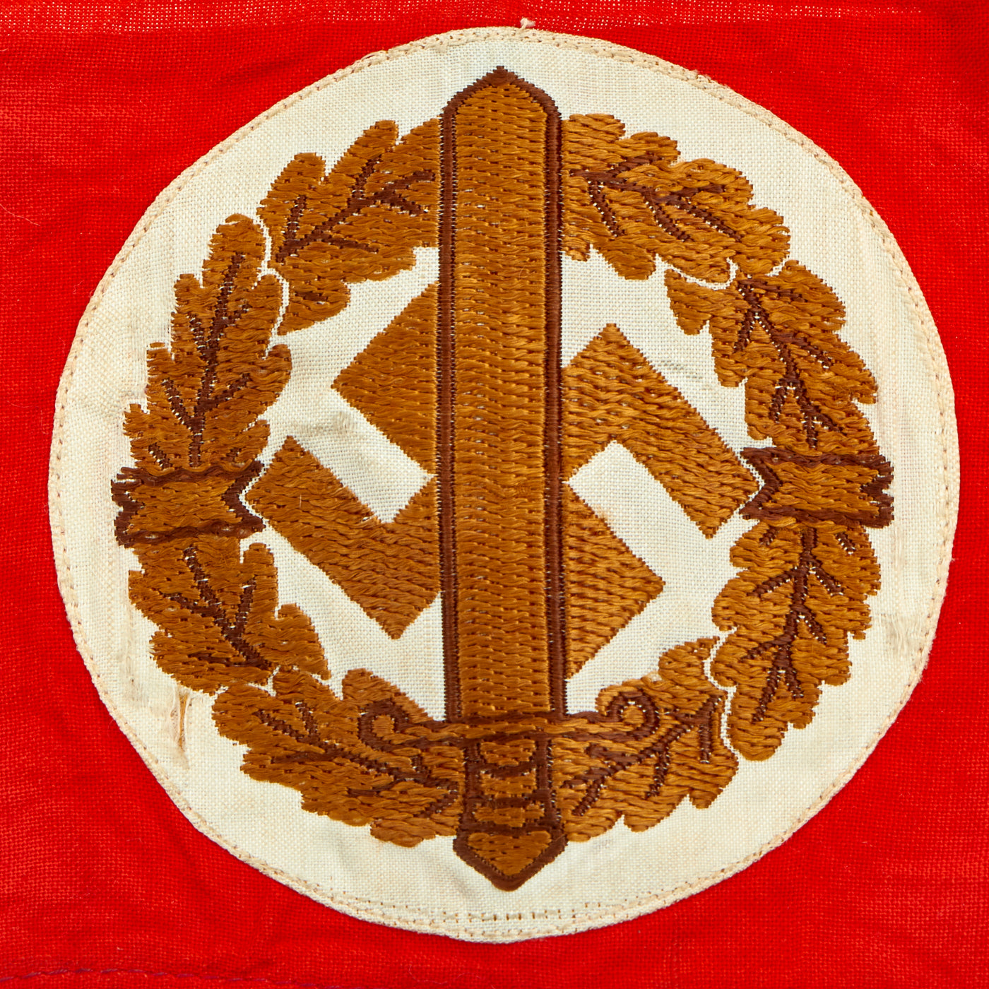 This example of the SA Wehrmannschaft armband is a one-look textbook original. It features a machine woven, Bevo style representation of an SA sports badge, in brown and gold thread on a white backing, machine stitched to a band made of a thin red cotton material. The armband shows minor age toning but no other trace of age or wear. It remains crisp and pristine.