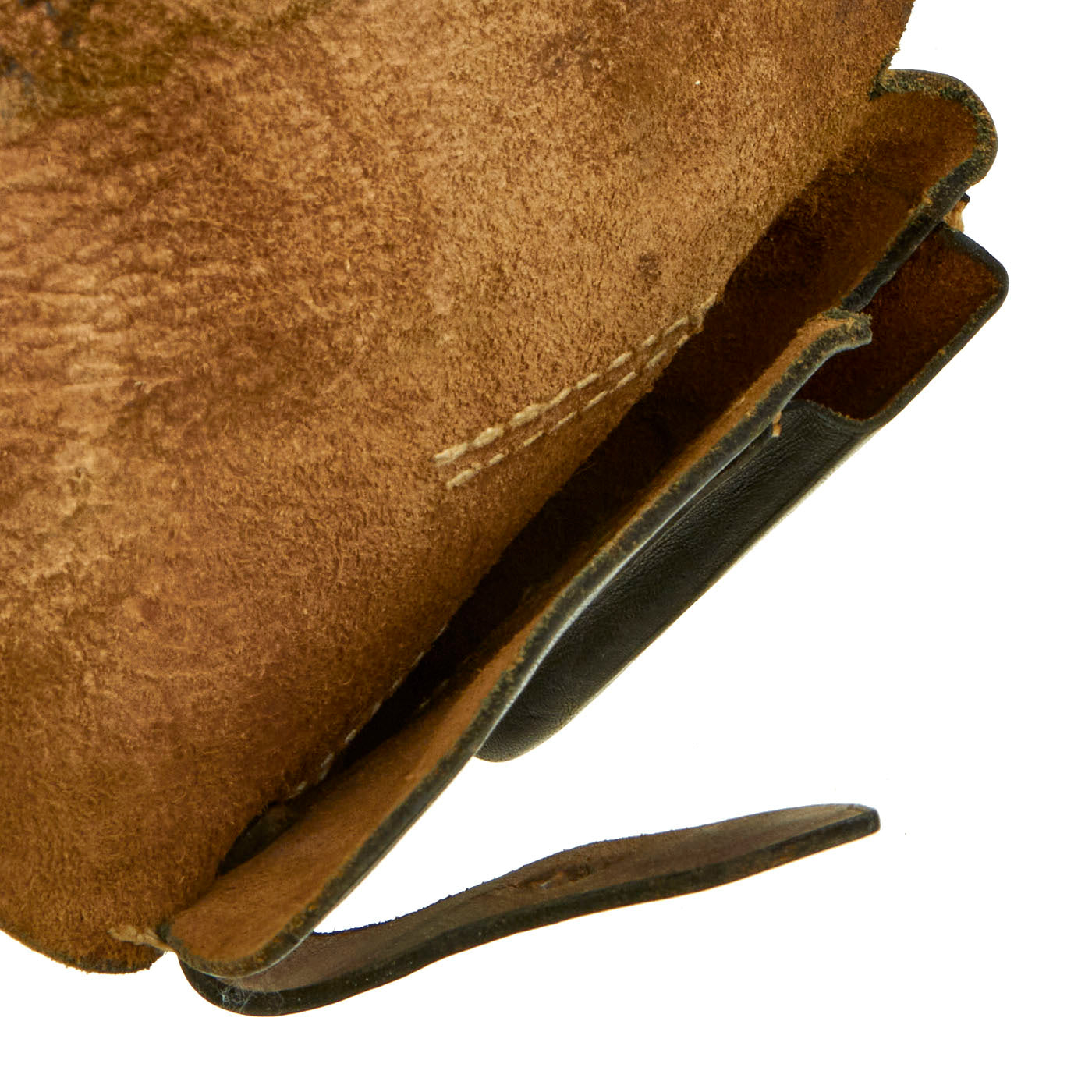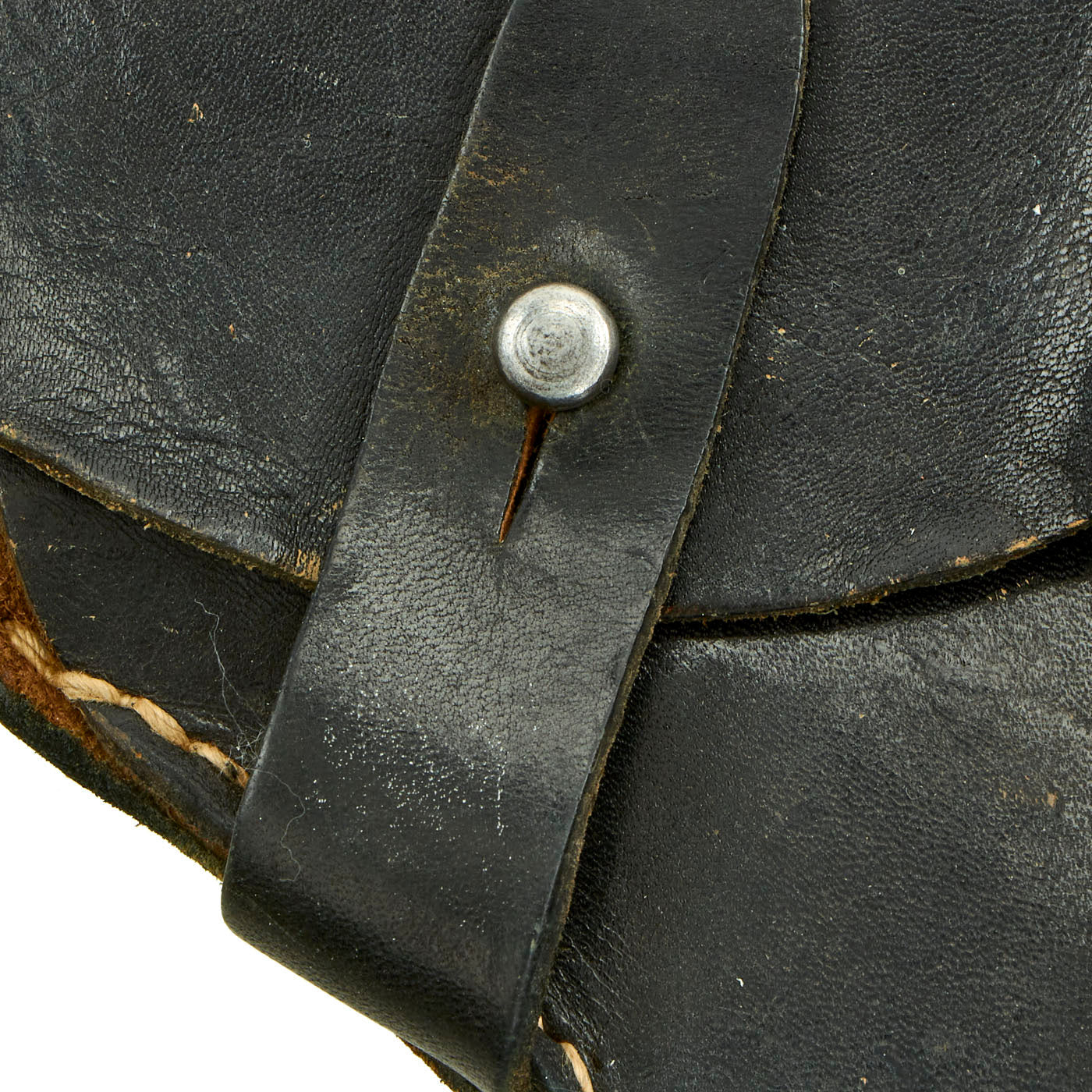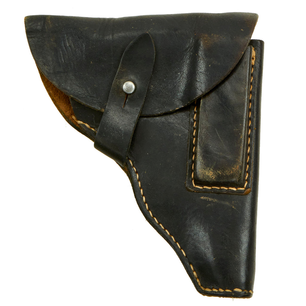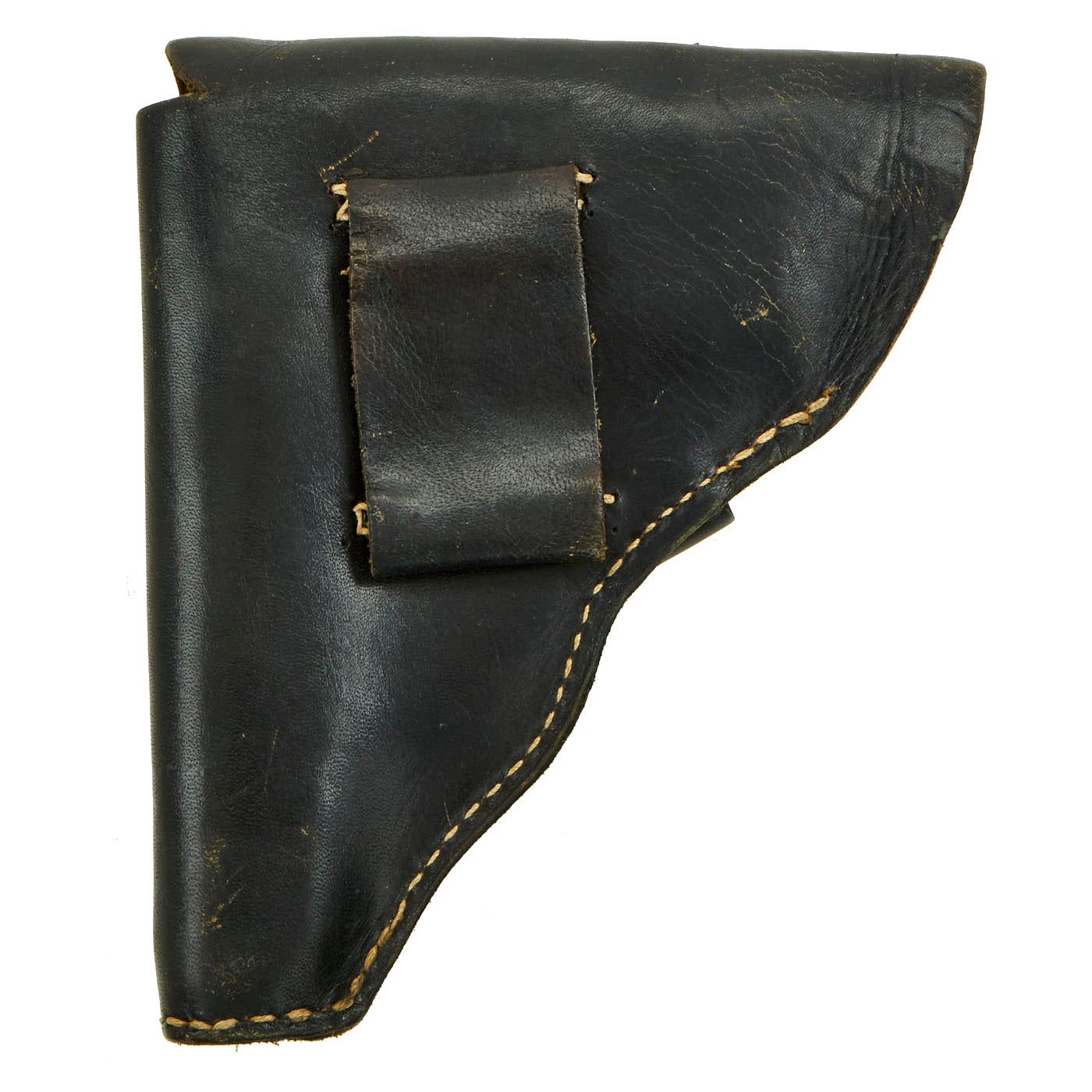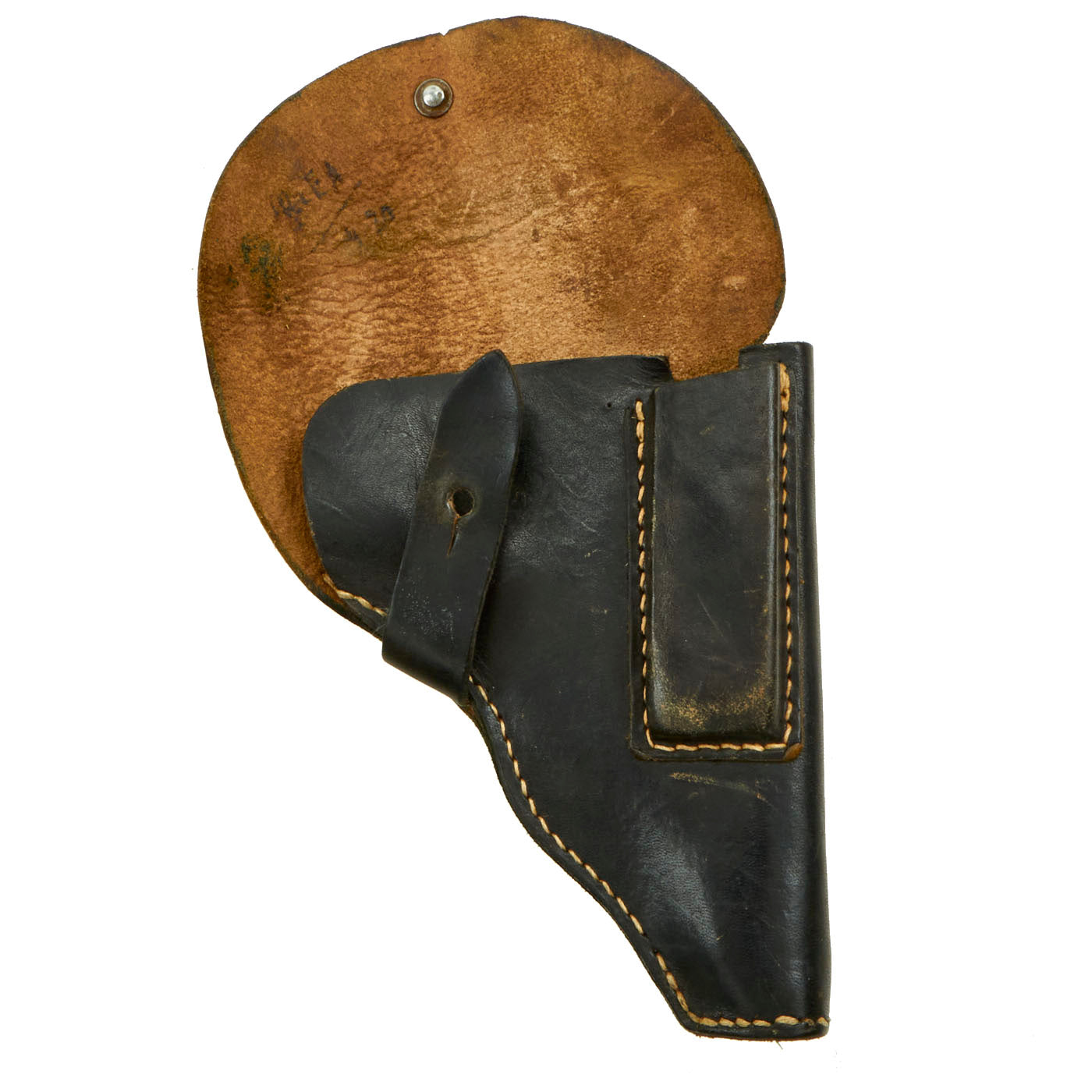 This black leather holster is in excellent condition but does not have any marking that we can find on it. The holster is a black top flap holster for the Sauer 38H Pistol, made of relatively thin leather with a simple snap closure. The holster is shaped to conform closely to the pistol. All stitching is intact and the holster shows signs of relative use to it with no damage present.