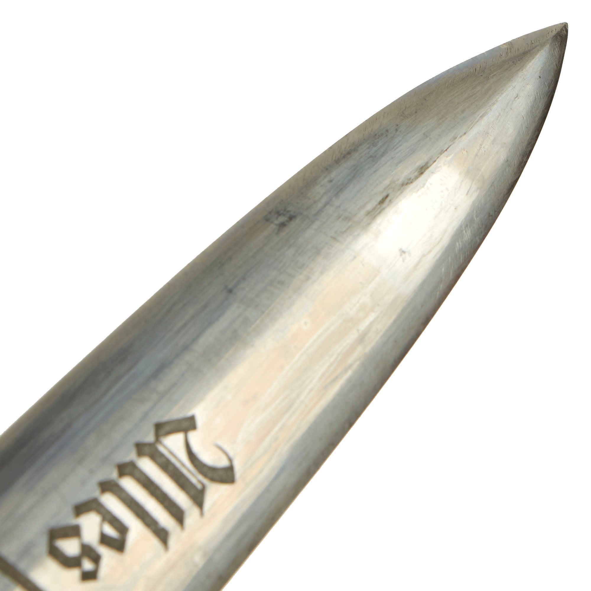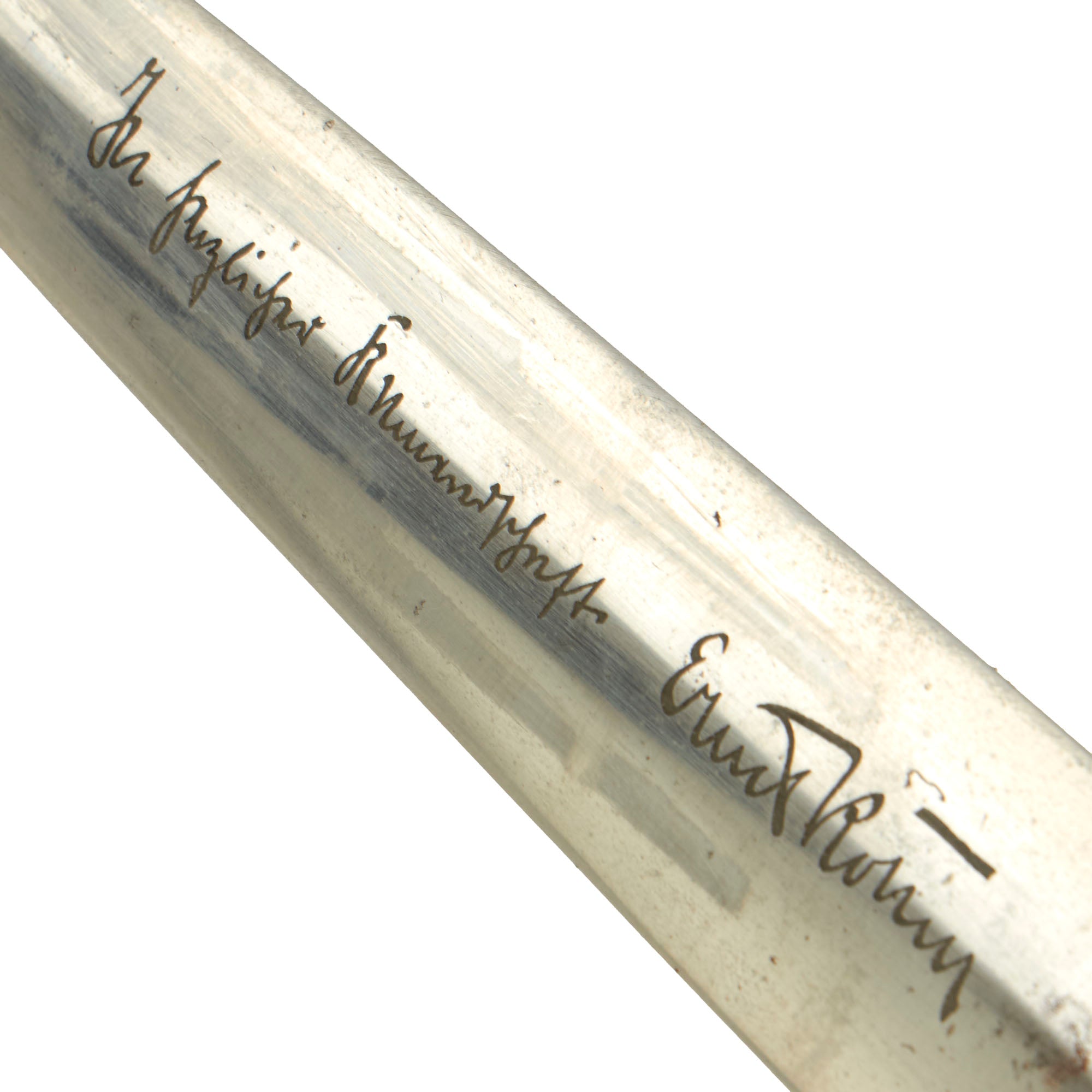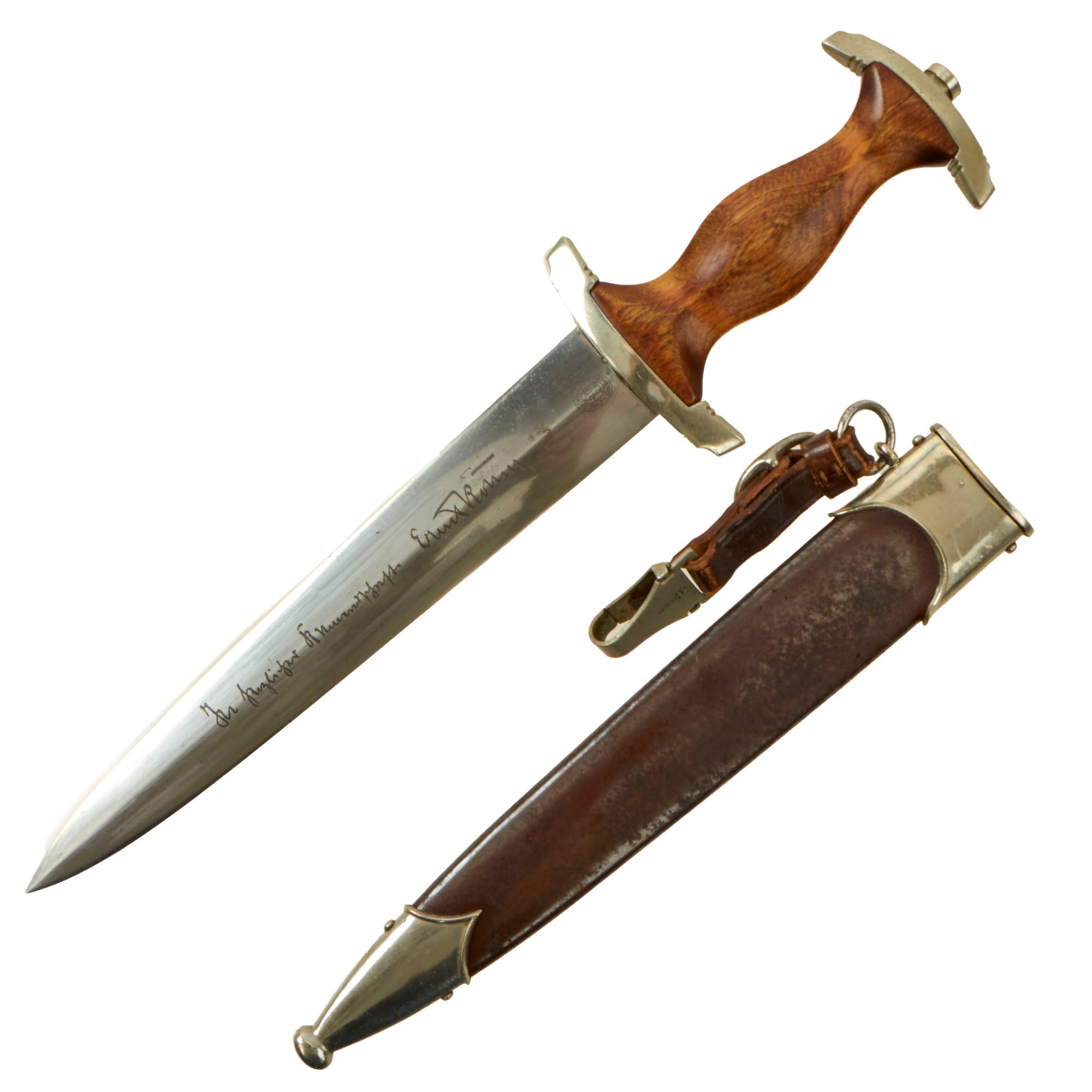 Original Item: Only One Available. Prior to his "unmasking" as a traitor, Ernst Röhm was the leader of the SA. In 1934, he distributed approximately 100,000 SA daggers with his personal inscription on the reverse blade. These daggers were to honor individuals who had served with the SA prior to December, 1931. Other than the inscription, these pieces were identical to the standard M1933 SA dagger. After the Röhm purge, the inscription was ordered to be removed. Many examples were returned to the factory for grinding. Others were simply ground in the field by whatever means were available. Examples will occasionally be encountered with remnants of the original inscription remaining on the blade, but mostly none will remain. Some blades exist with an intact inscription, exhibiting only the removal of the Röhm signature. Very, very rarely is an example seen with a full, untouched inscription, as the holder would have surely risked a charge of treason.