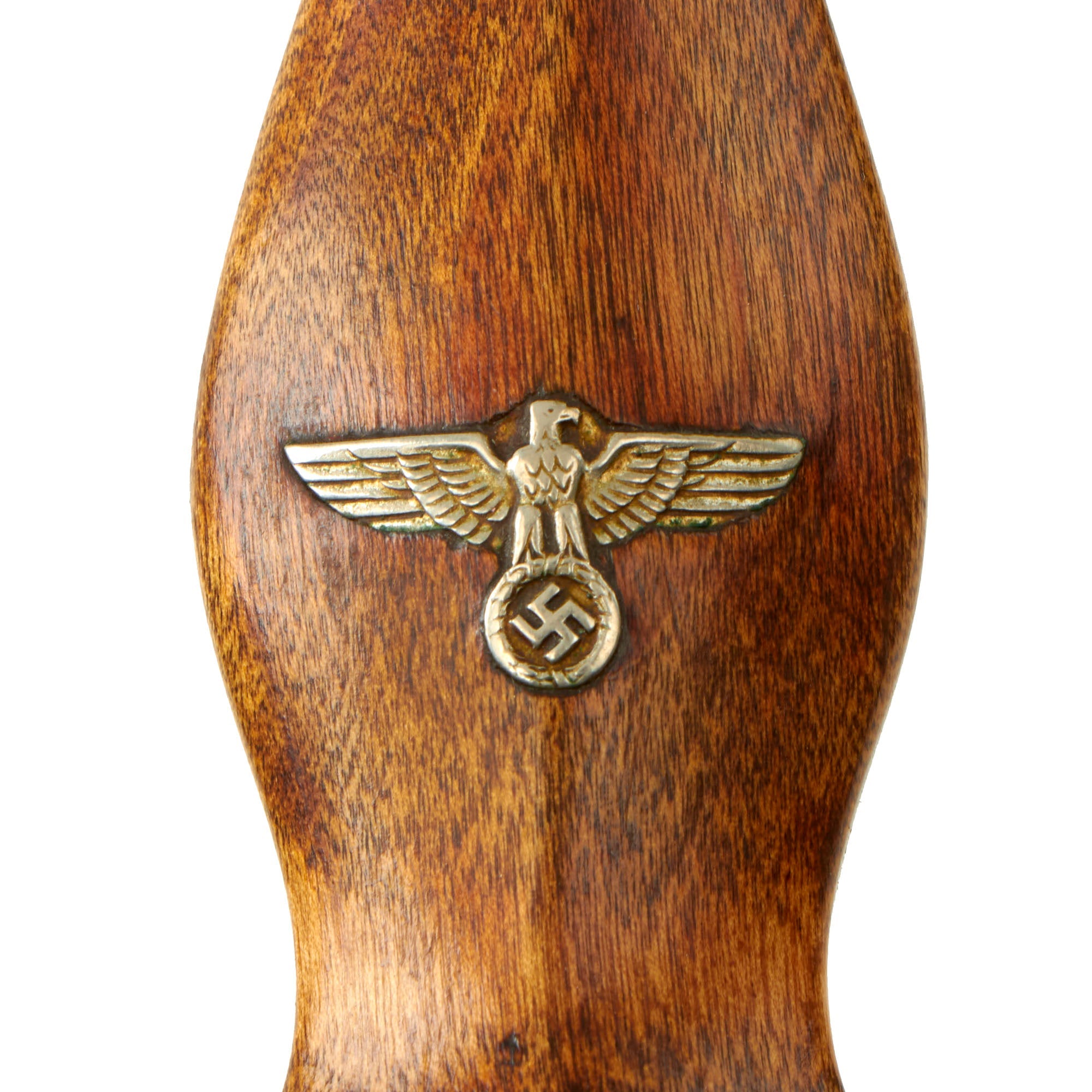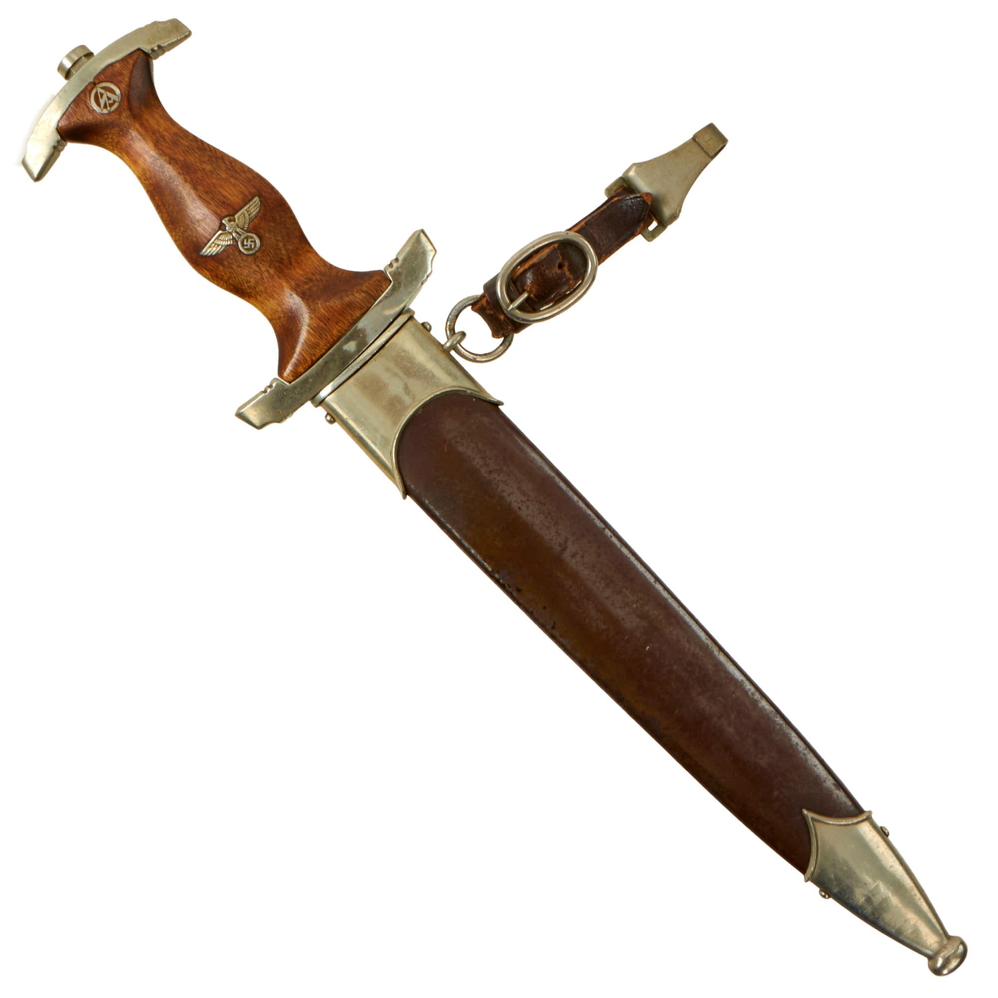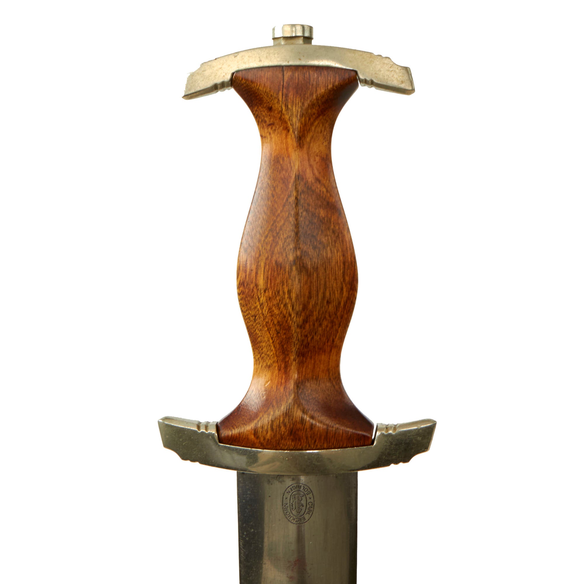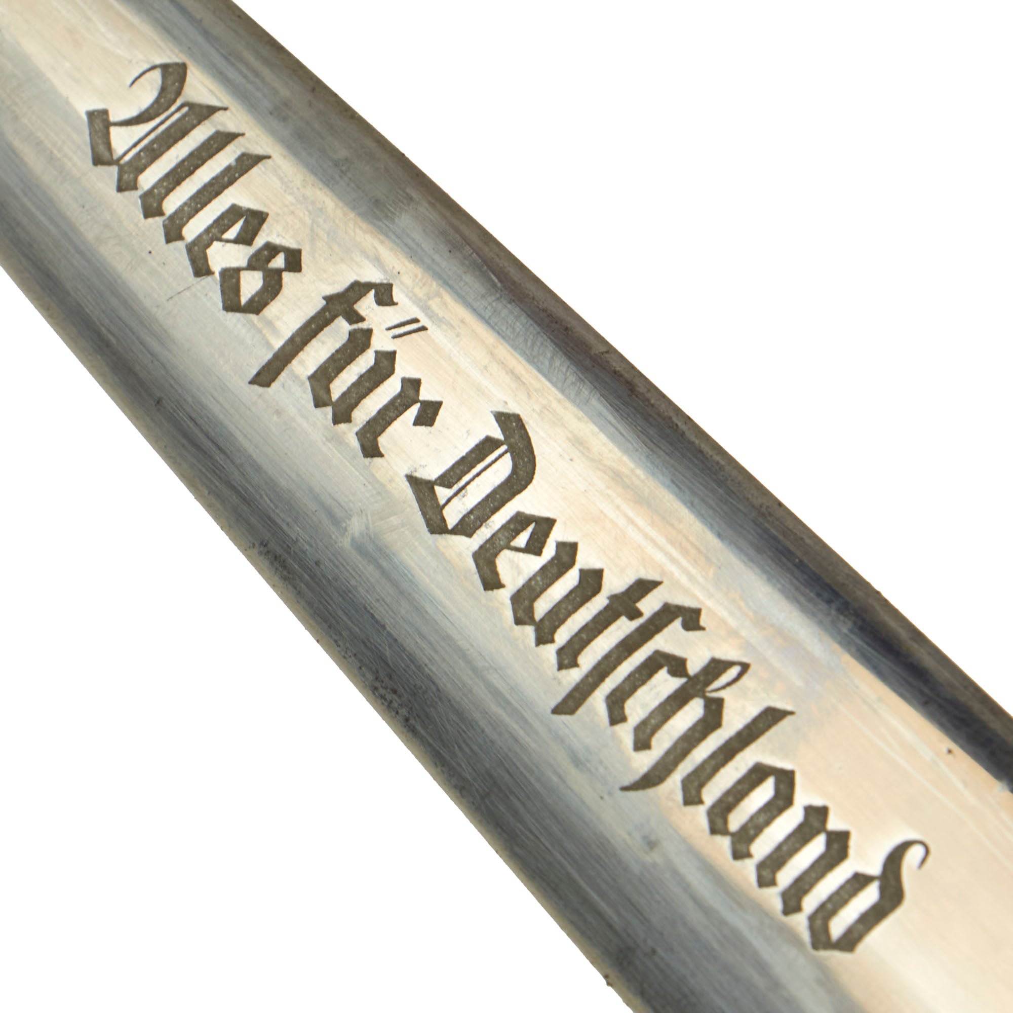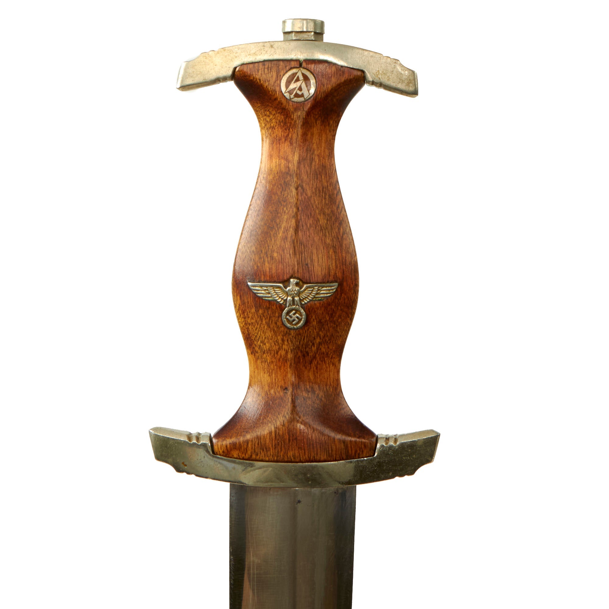 The blade was etched with the SA motto, Alles für Deutschland. Examples produced prior to 1935 were stamped with the German sector of the SA group on reverse lower crossguard. Later examples underwent standardization through the RZM ministry. These pieces were produced of cheaper plated zinc-base fittings and scabbards were simply painted brown.