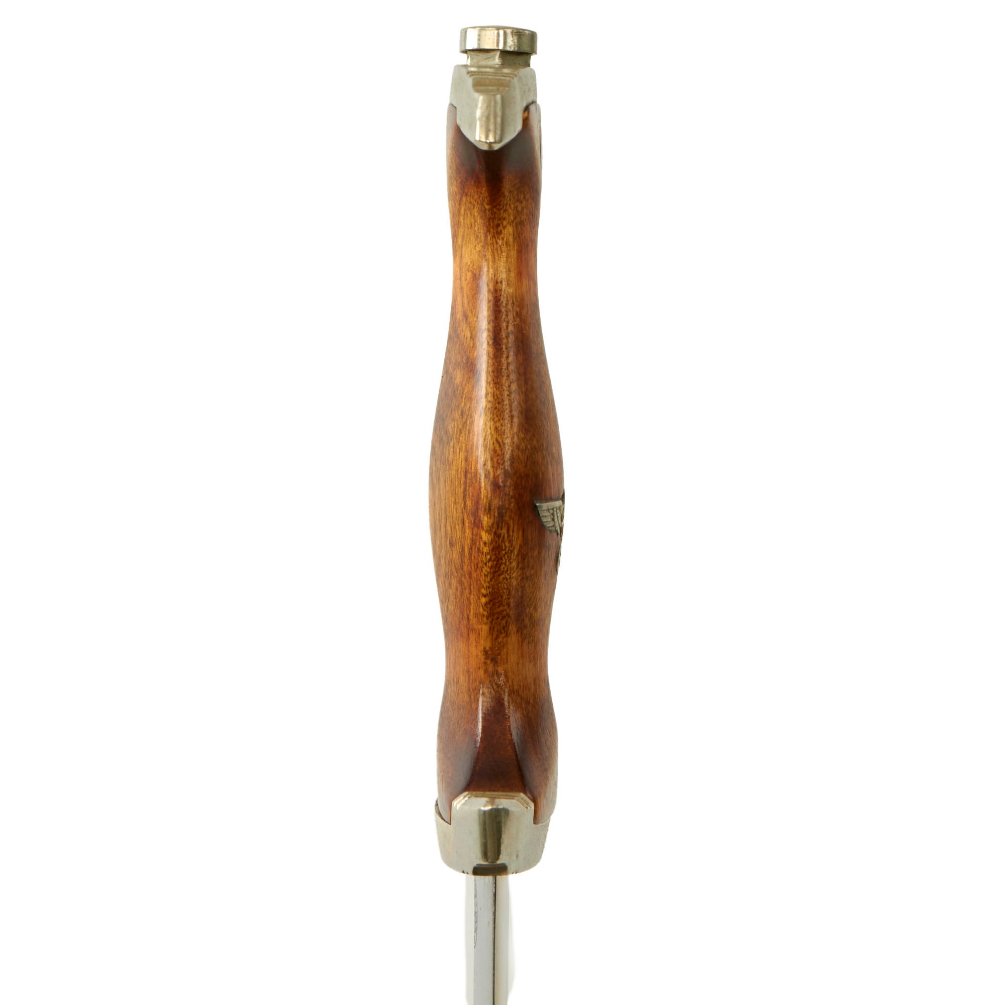 The hardwood grip has a great color, with medium center ridge construction. It does show a good amount of wear, and looks to probably have been refinished / oiled at some point, as it now displays a lovely golden color, with the grain quite dark. We can still see trades of the original red dye used, which did make the wood a bit brittle, making cracking common. There is no cracking by the cross guard, but the grip is cracked on both sides by the pommel guard. The solid nickel-silver eagle is crisp with a perfect fit, and just a bit of oxidation, showing that is is solid nickel alloy. The SA roundel also has a good fit and retains most of the translucent enamel, with intact plating.