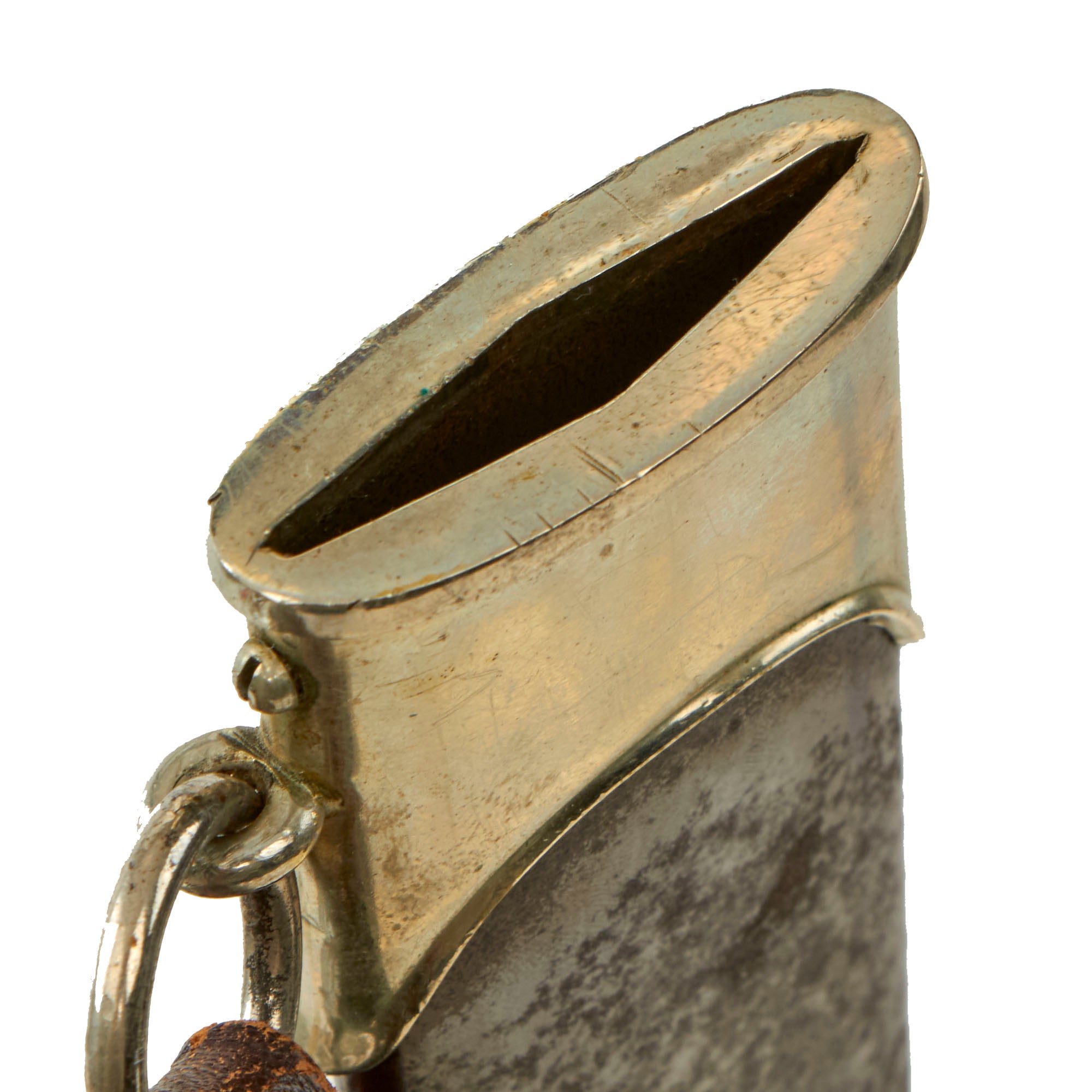 The steel scabbard shell is the correct early-war style, originally made with a brown "anodized" finish on the steel, protected by a lacquer coating. This example has lost virtually all of the lacquer, with just a bit still retained next to the fittings, however it is still dent free, and a good amount of the anodizing is present on the obverse. The reverse shows less of the finish, and also has surface oxidation present in many areas. The upper and lower fittings are solid nickel silver, and are really in very nice shape, showing only light oxidation and wear. The bottom ball is dented in just a bit, when they are often completely crushed. All four dome-headed securing screws are present and in good condition. The top mount and throat throat nicely matches the crossguards.
