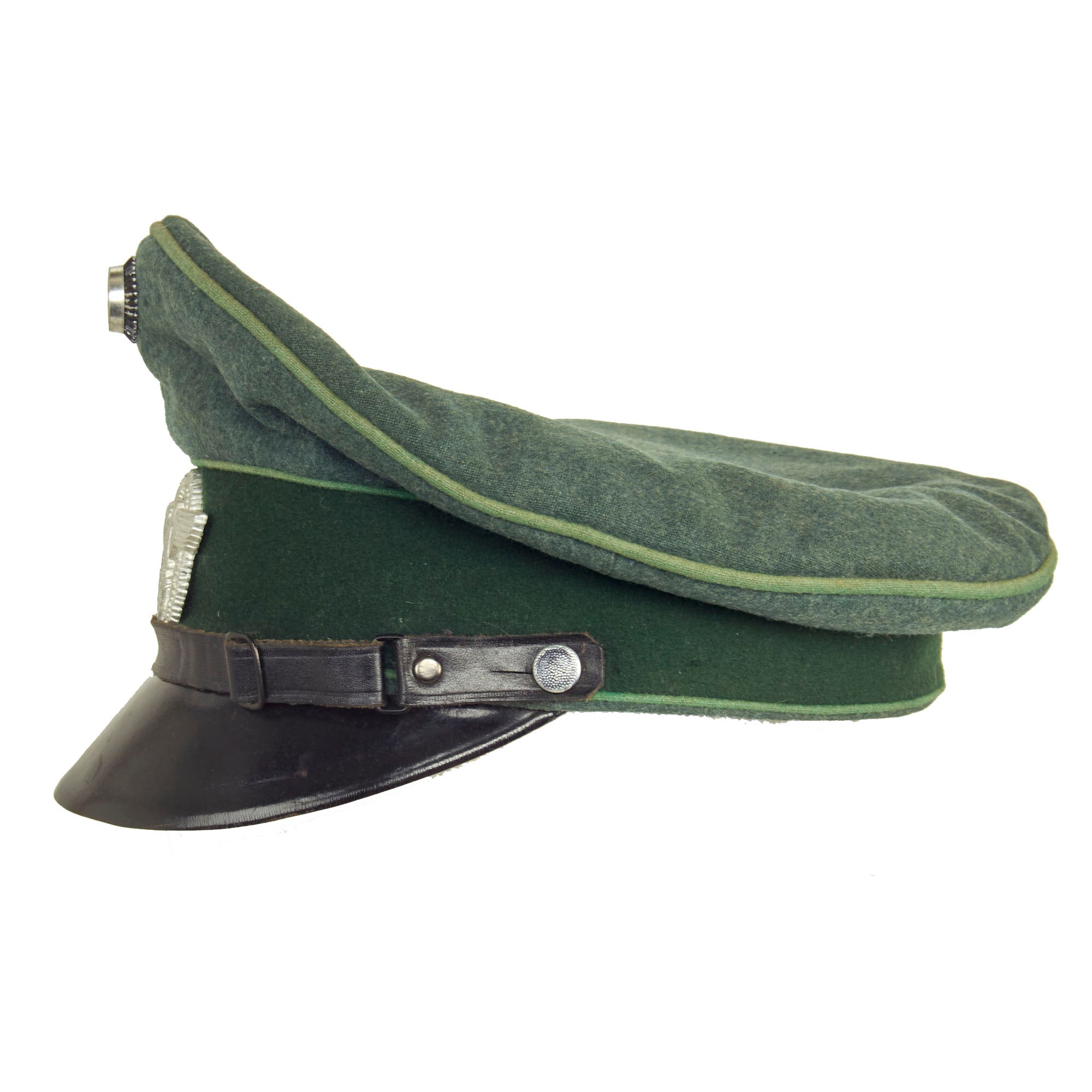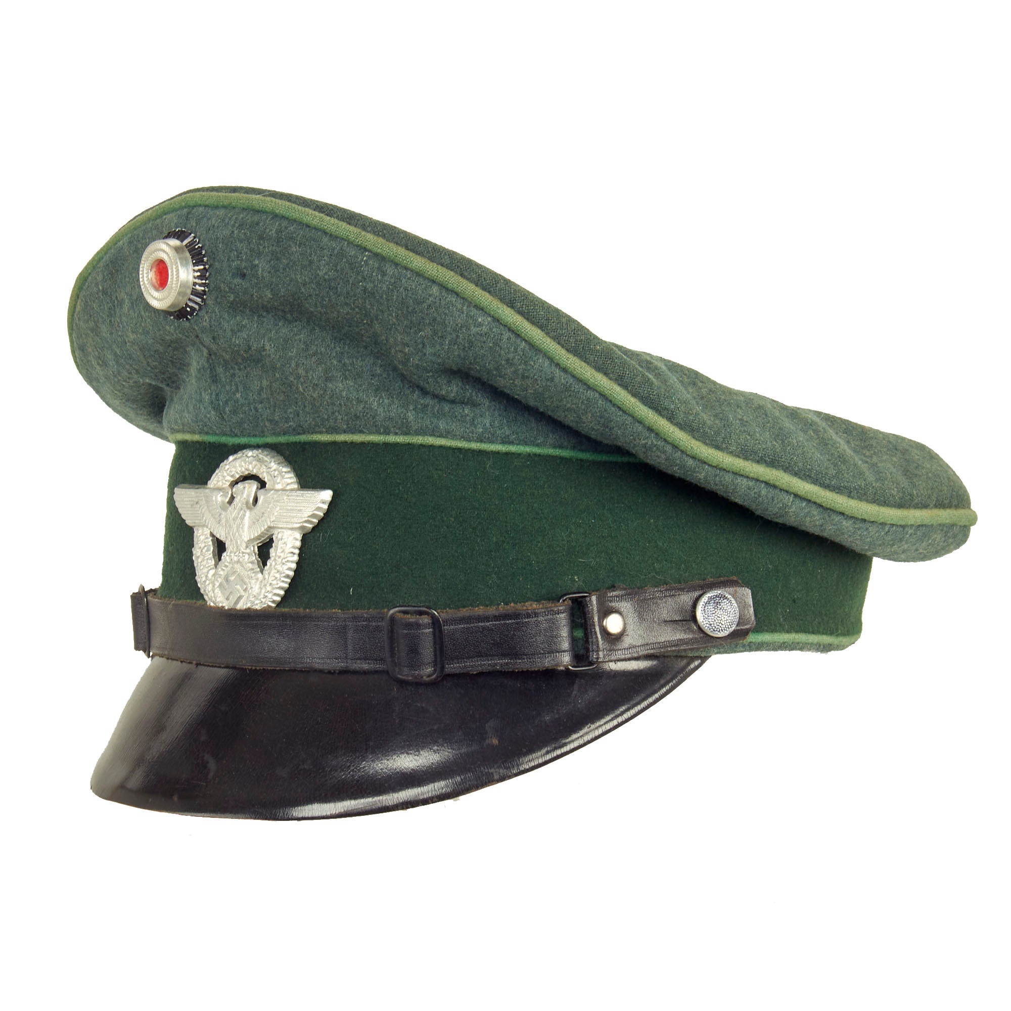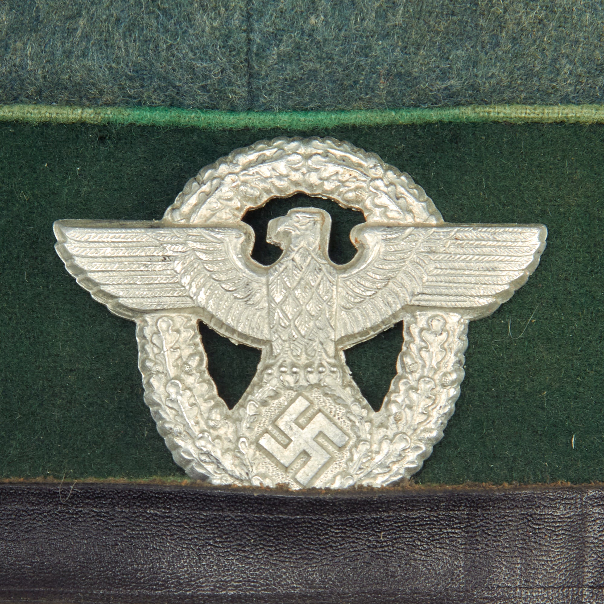 This is a very good condition condition German WWII Schutzpolizei Schirmmütze Visor Cap, with a lovely sloped "Saddle Form" shape. This was done by removing the crown stiffener ring, just as done on military visor caps. It is fabricated from the correct police blue green wool gabardine with the traditional high front, however the "badge cloth" cap band is green, so this looks to be an early version, before the change to brown. The visor cap has matching Hellgrün (Light Green) piping along the top edge and flanking either side of the band, which is the Truppenfarbe (troop colors) for the Schutzpolizei (Protection Police).