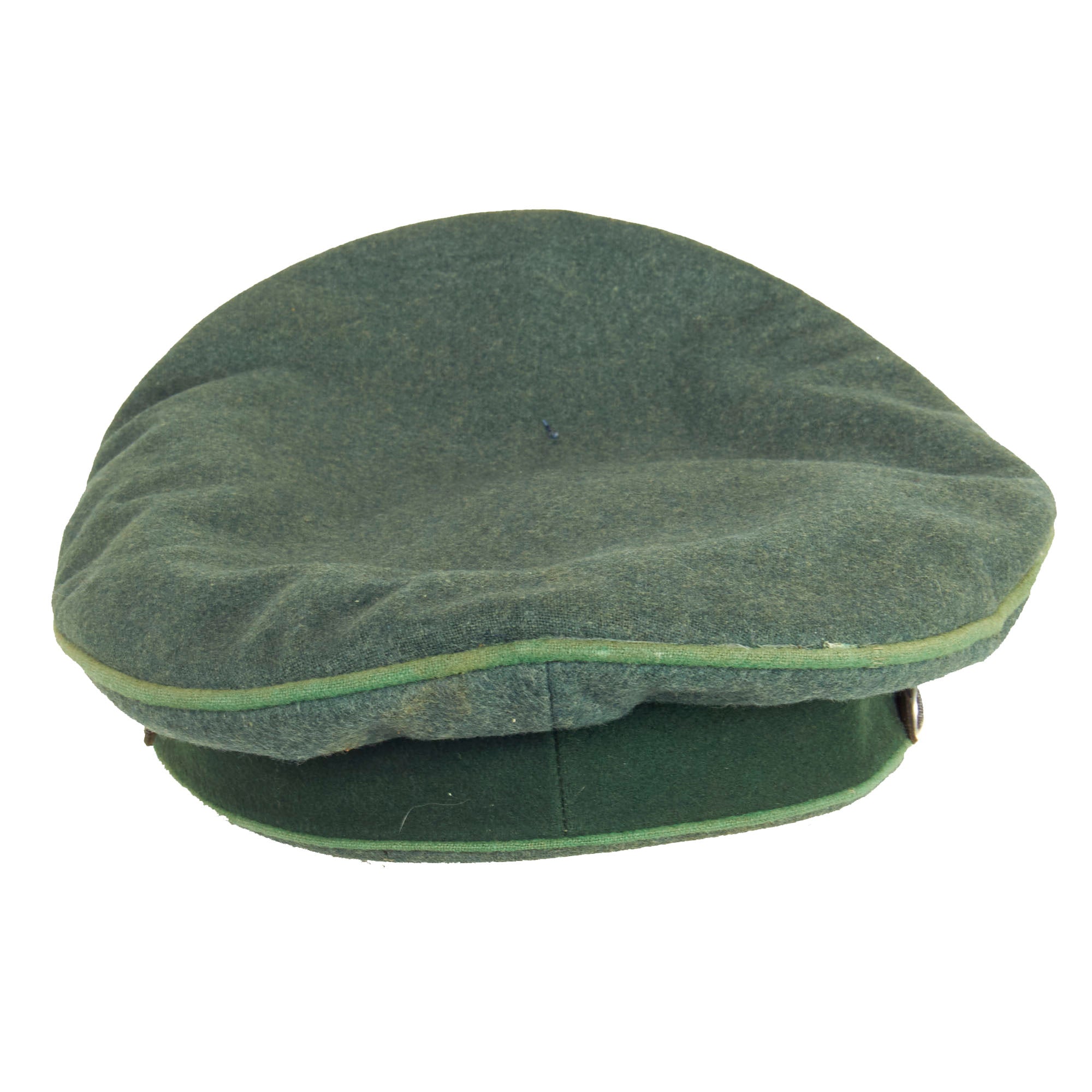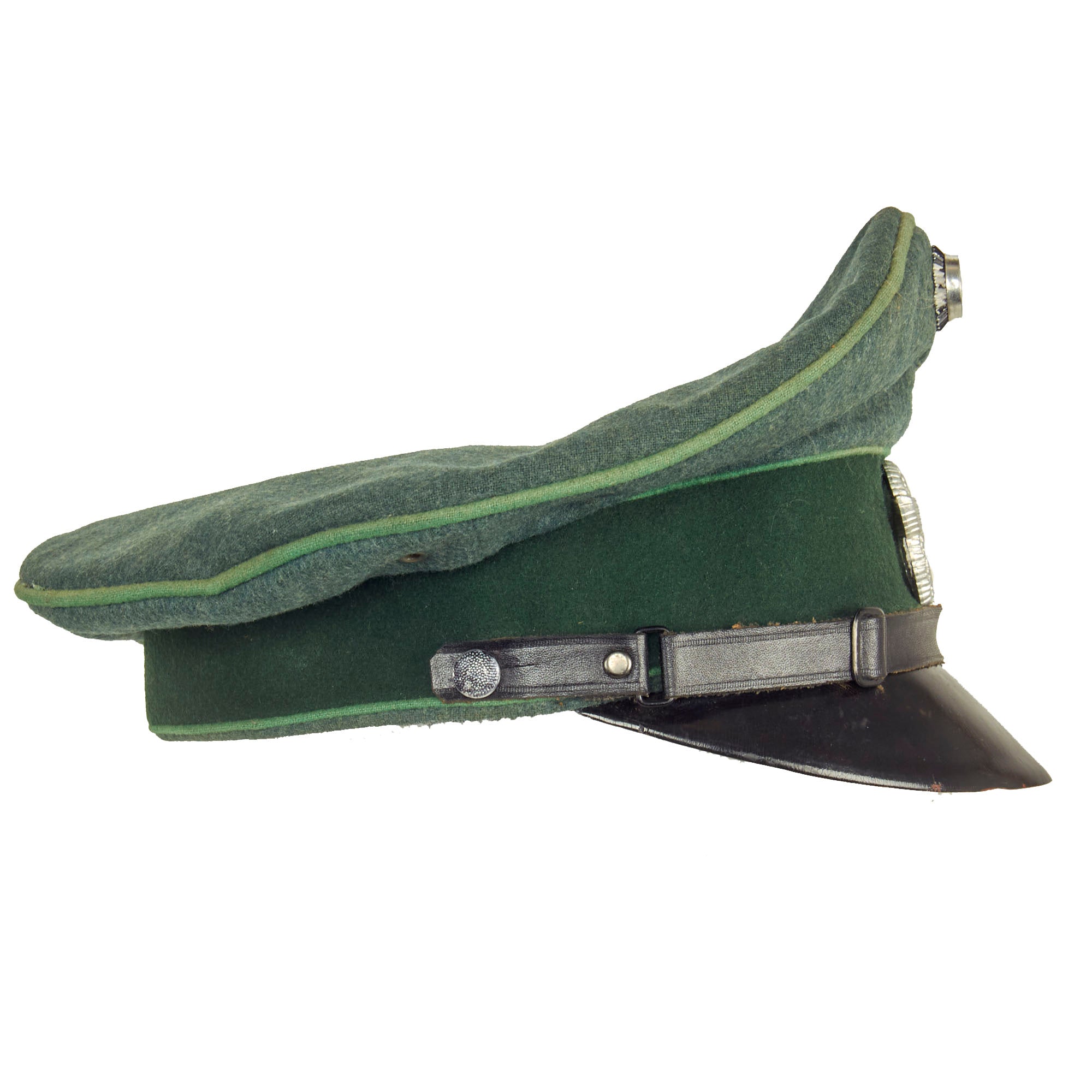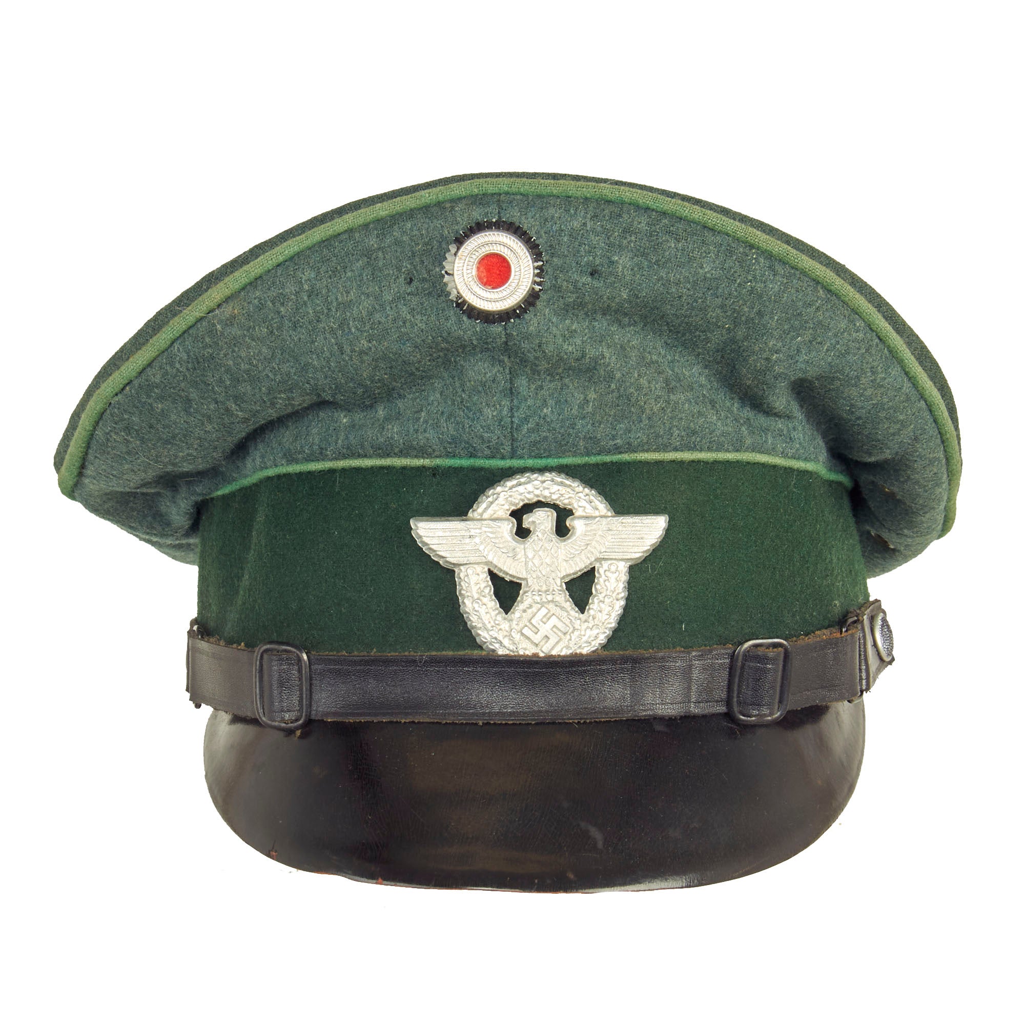 This is a very good condition condition German WWII Schutzpolizei Schirmmütze Visor Cap, with a lovely sloped "Saddle Form" shape. This was done by removing the crown stiffener ring, just as done on military visor caps. It is fabricated from the correct police blue green wool gabardine with the traditional high front, however the "badge cloth" cap band is green, so this looks to be an early version, before the change to brown. The visor cap has matching Hellgrün (Light Green) piping along the top edge and flanking either side of the band, which is the Truppenfarbe (troop colors) for the Schutzpolizei (Protection Police).
