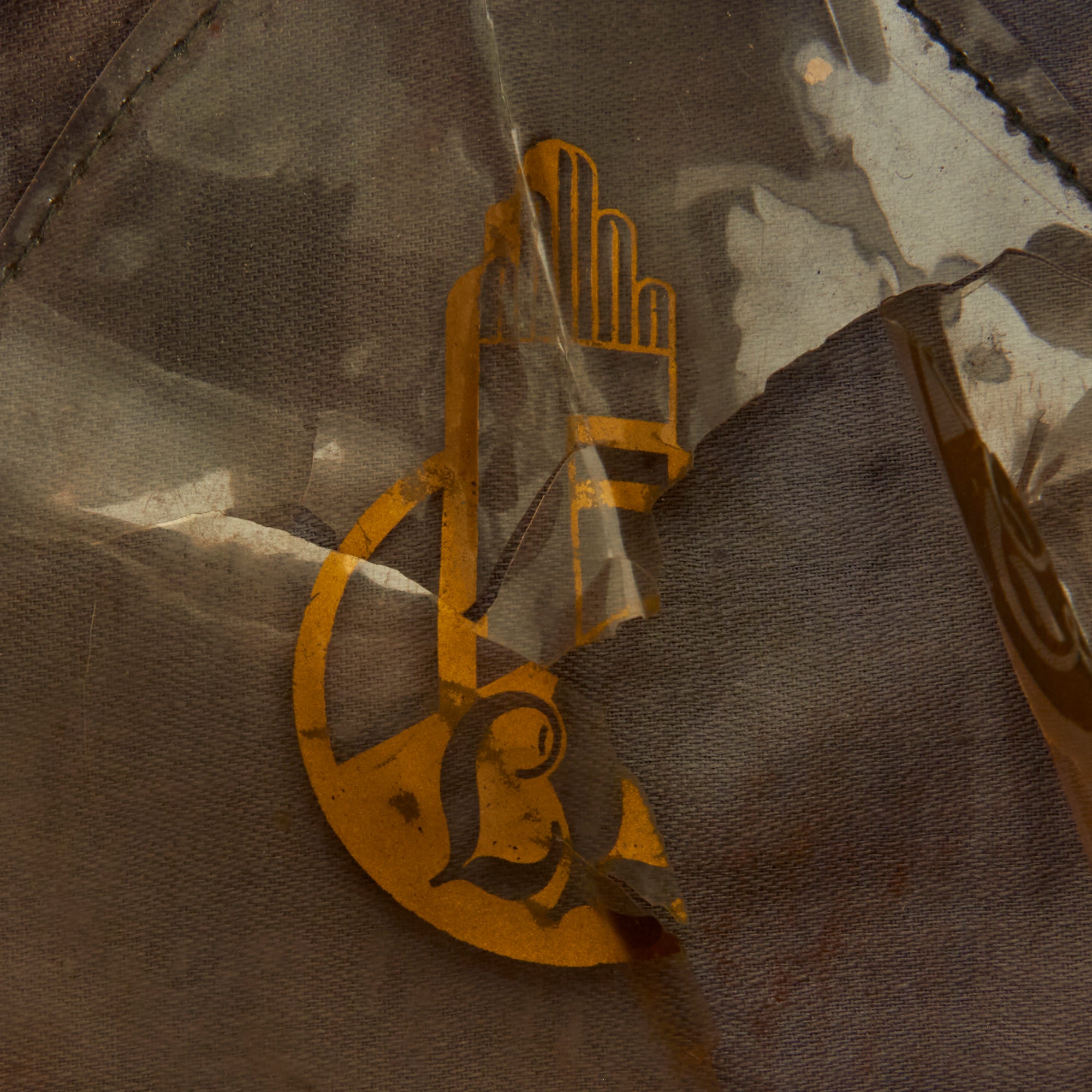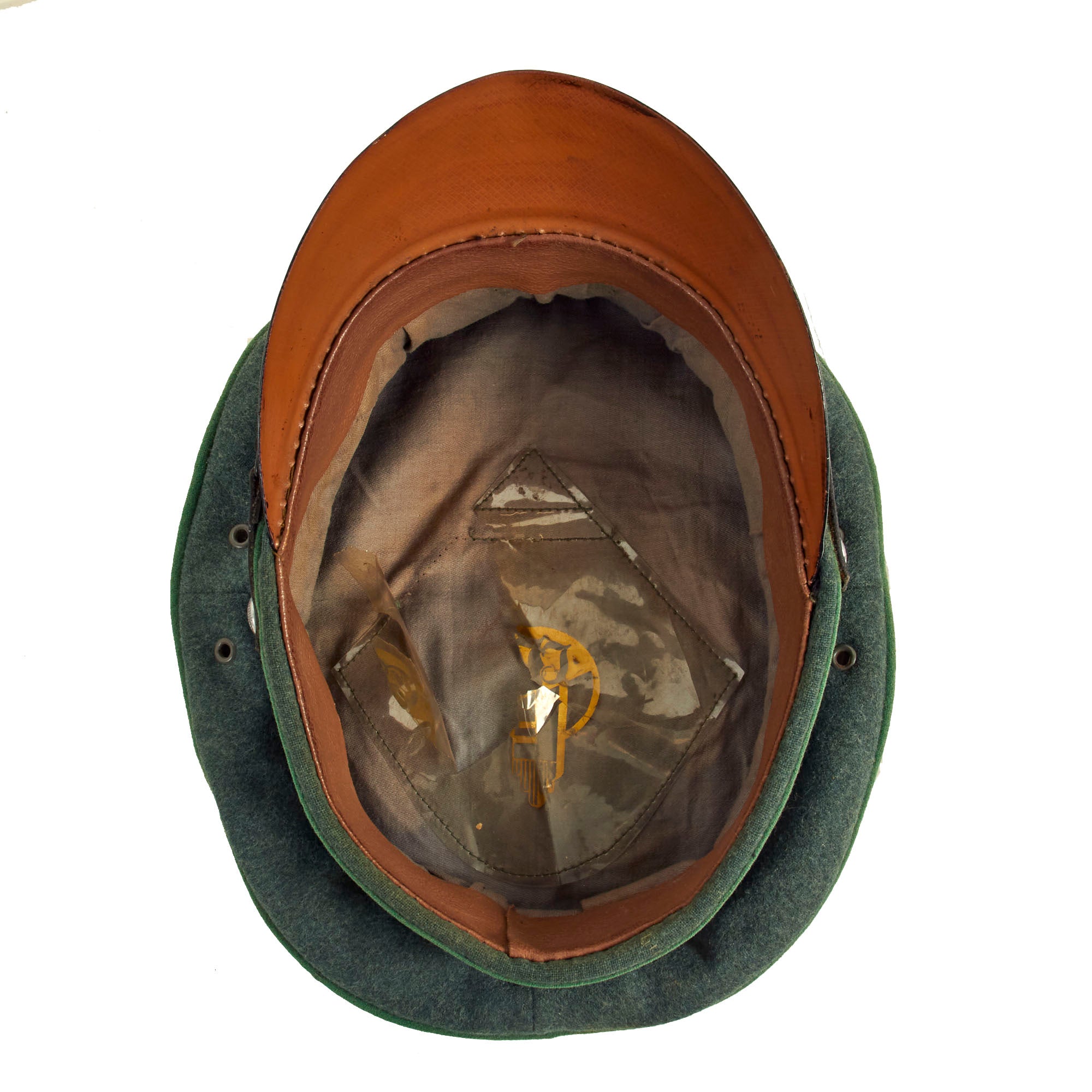 The inside of the cap is light with light gray cotton material, and has a celluloid sweat shield diamond stitched to the top. This is still partly intact, with the stitching well retained, but the celluloid itself cracked and torn in many places, as shown. It is marked with a maker's logo that we unfortunately were not able to identify. The brown leather sweatband is in very good condition, with a lovely pebble grain appearance.