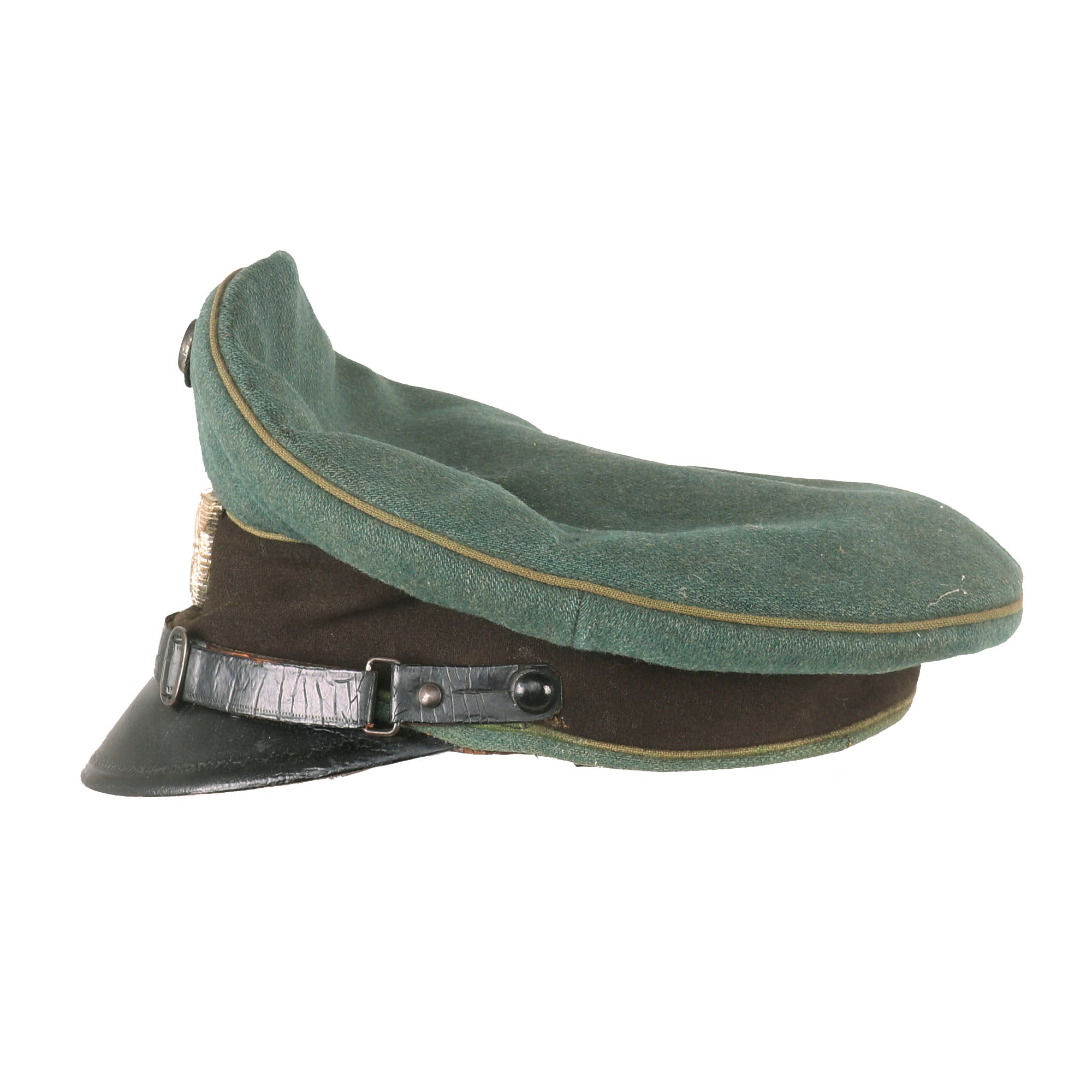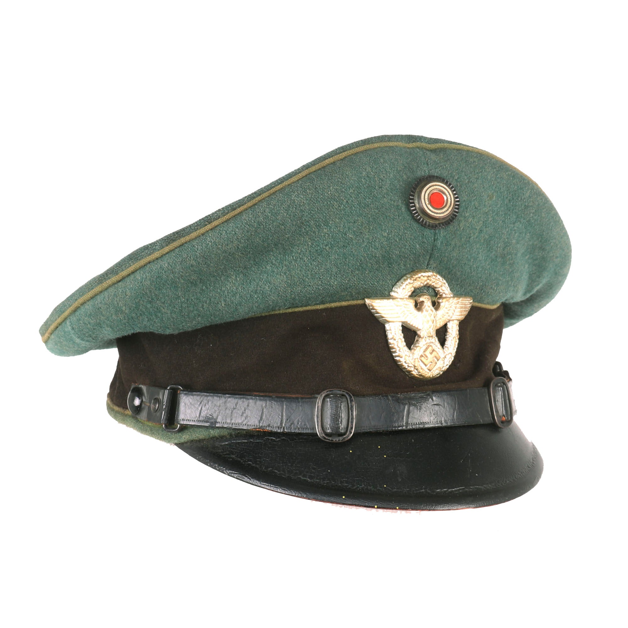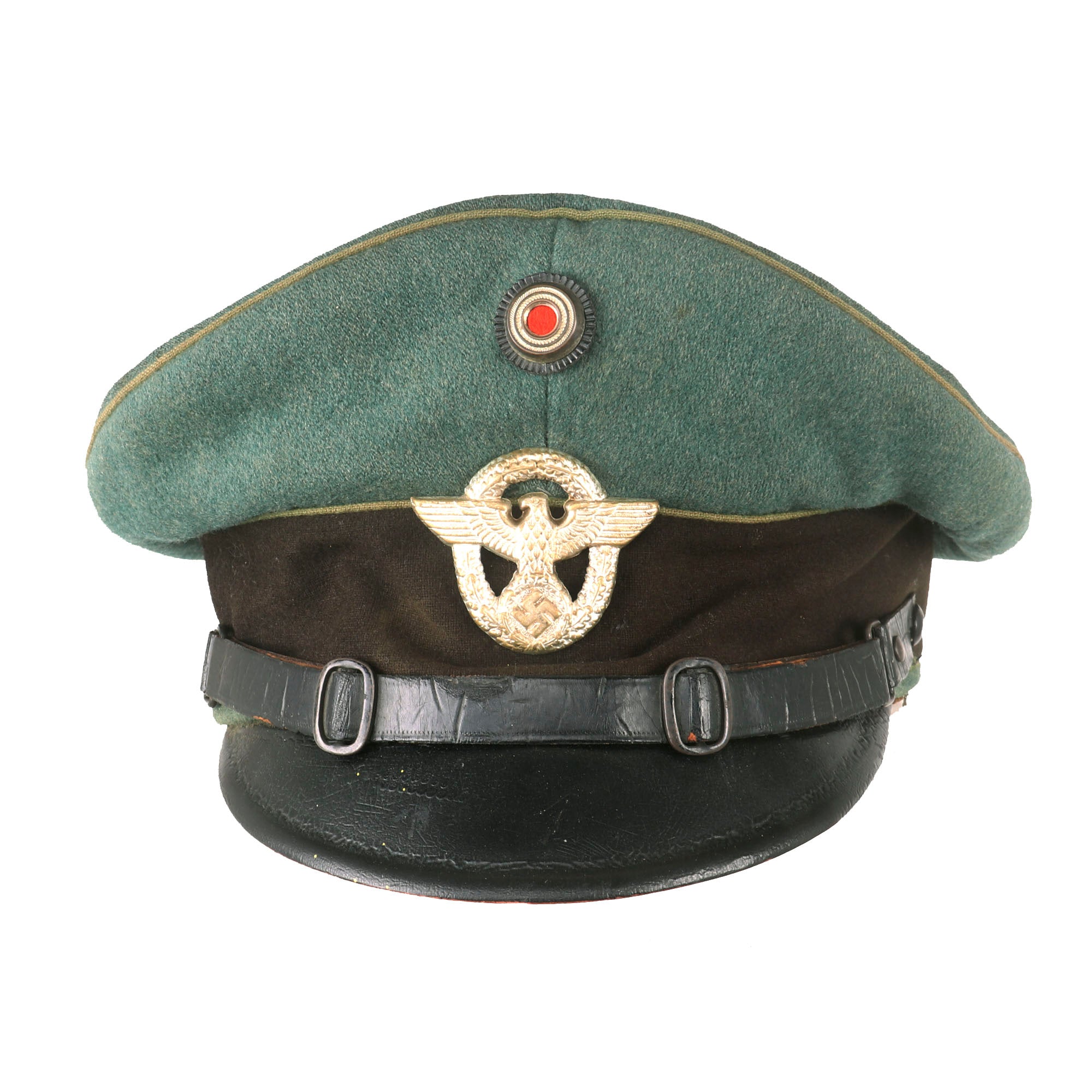 This is a very good service used condition condition German WWII Schutzpolizei Schirmmütze Visor Cap, with a lovely sloped "Saddle Form" shape. This was done by removing the crown stiffener ring, just as done on military visor caps. It is fabricated from the correct police blue green wool gabardine, with a brown "badge cloth" band and a traditional high front. The visor cap has matching Hellgrün (Light Green) piping along the top edge and flanking either side of the band, which is the Truppenfarbe (troop colors) for the Schutzpolizei (Protection Police).
