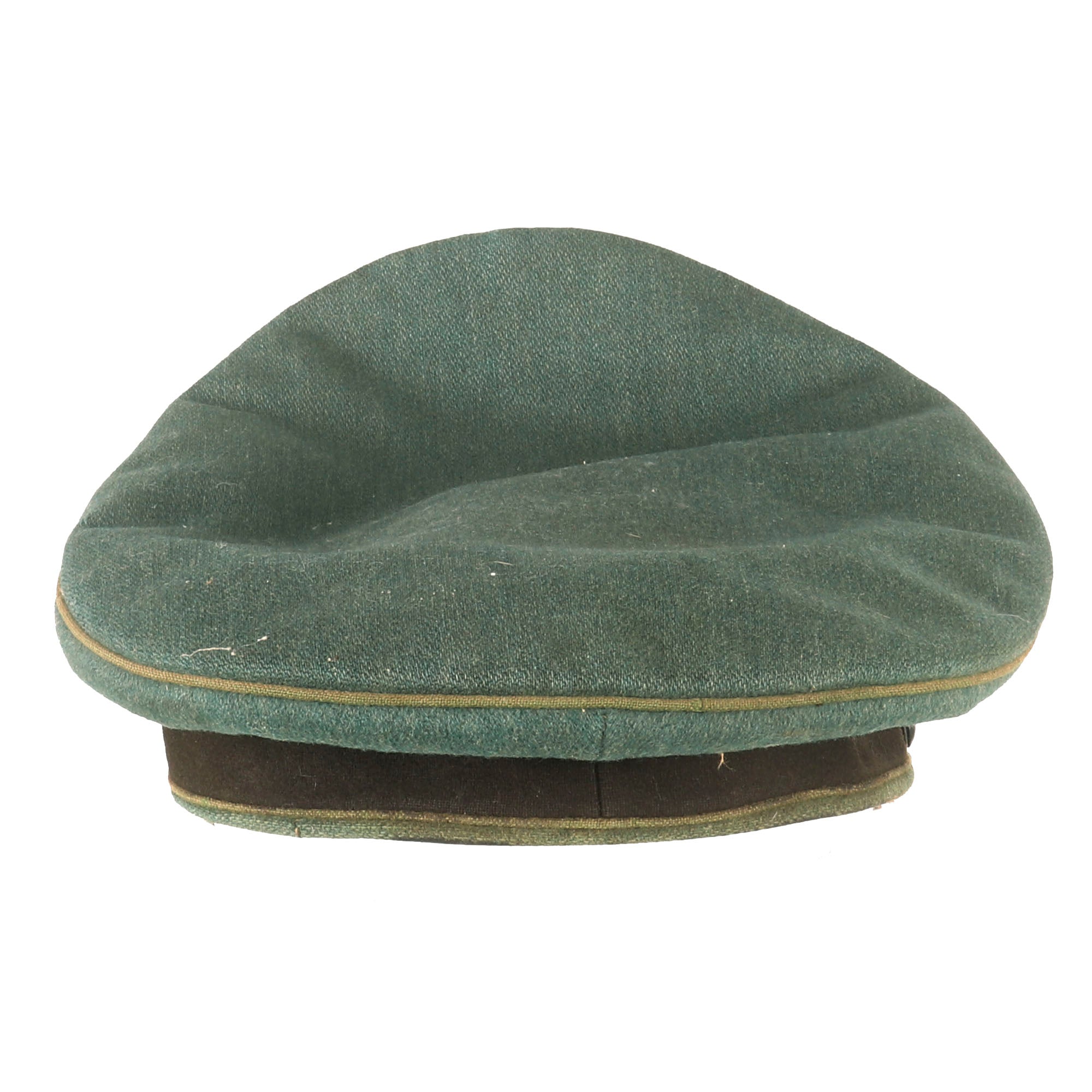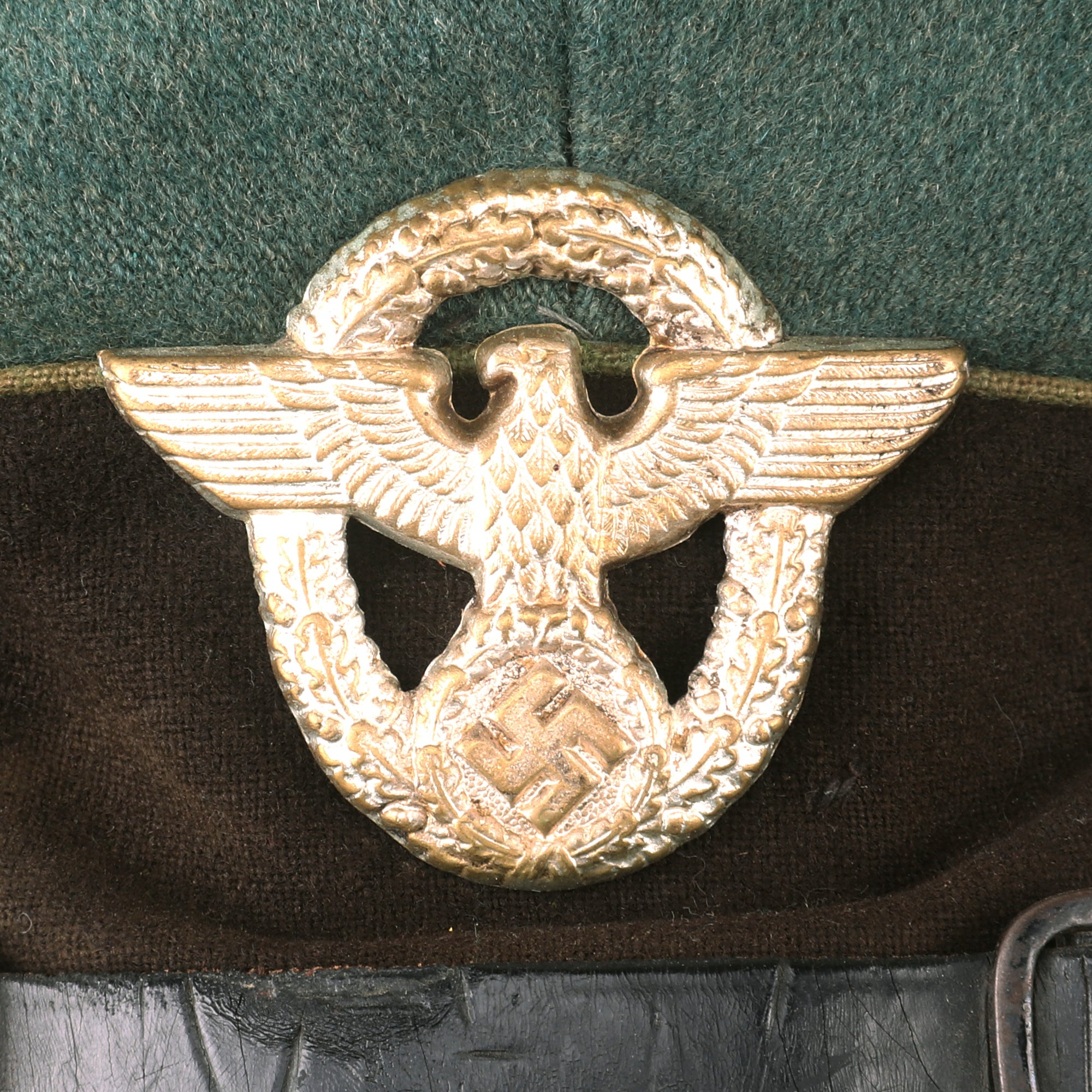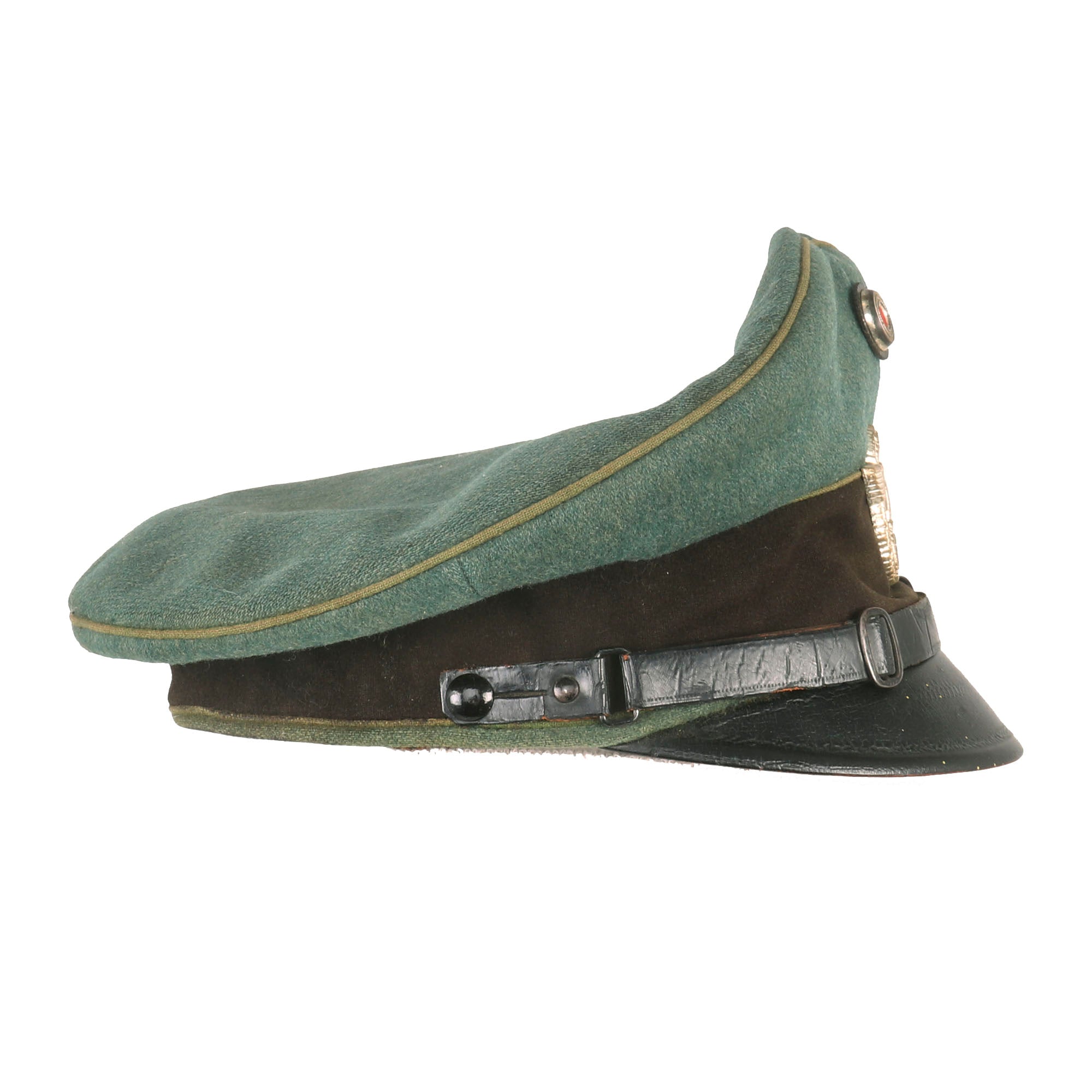 This is a very good service used condition condition German WWII Schutzpolizei Schirmmütze Visor Cap, with a lovely sloped "Saddle Form" shape. This was done by removing the crown stiffener ring, just as done on military visor caps. It is fabricated from the correct police blue green wool gabardine, with a brown "badge cloth" band and a traditional high front. The visor cap has matching Hellgrün (Light Green) piping along the top edge and flanking either side of the band, which is the Truppenfarbe (troop colors) for the Schutzpolizei (Protection Police).