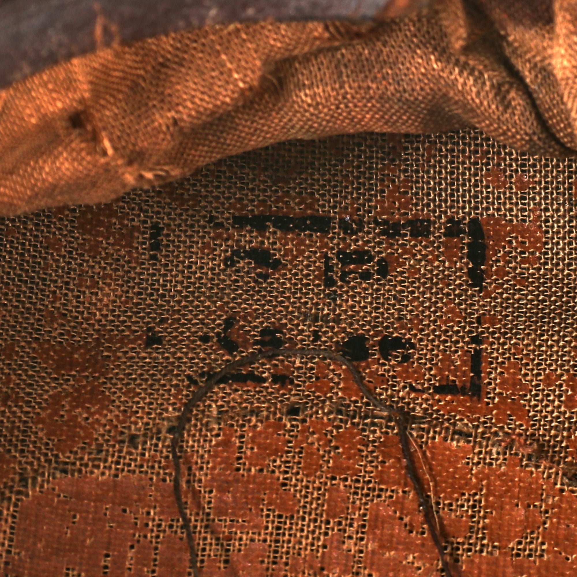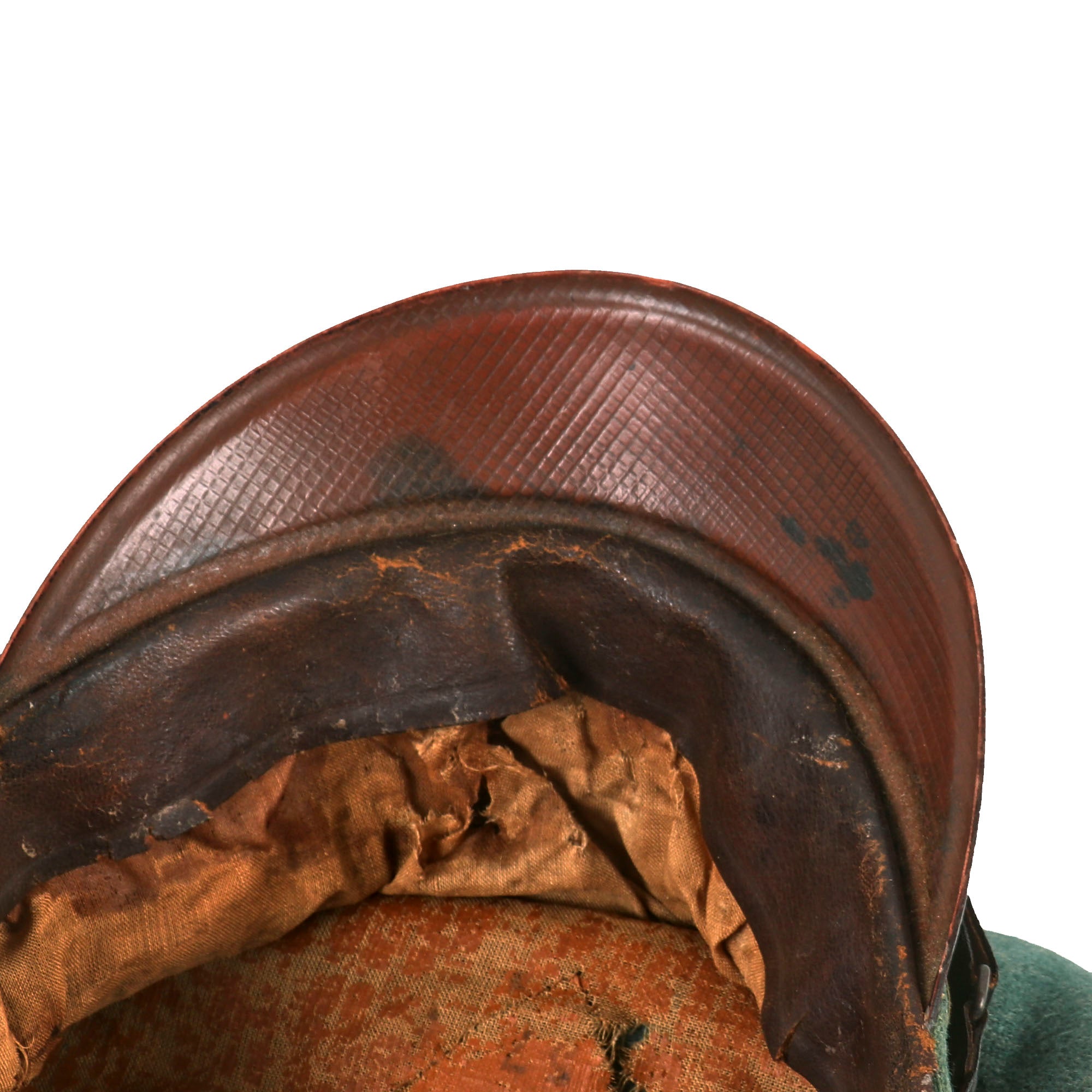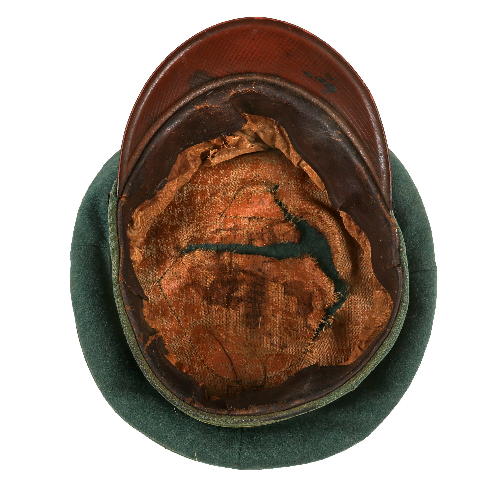 The inside of the cap is lined with orange "service cloth" type oil cloth, which shows that it saw extensive use during the WWII period. It is stained and torn, with much of the original coating on the fabric having flaked away. The celluloid sweat shield diamond is completely missing, along with the stitching, and there are remnants of markings that we can see, including a faint size 57 stamp at the very bottom. There also looks to possibly be an issue depot stamp, now mostly worn away. The brown leather sweatband is stained and torn from long use.