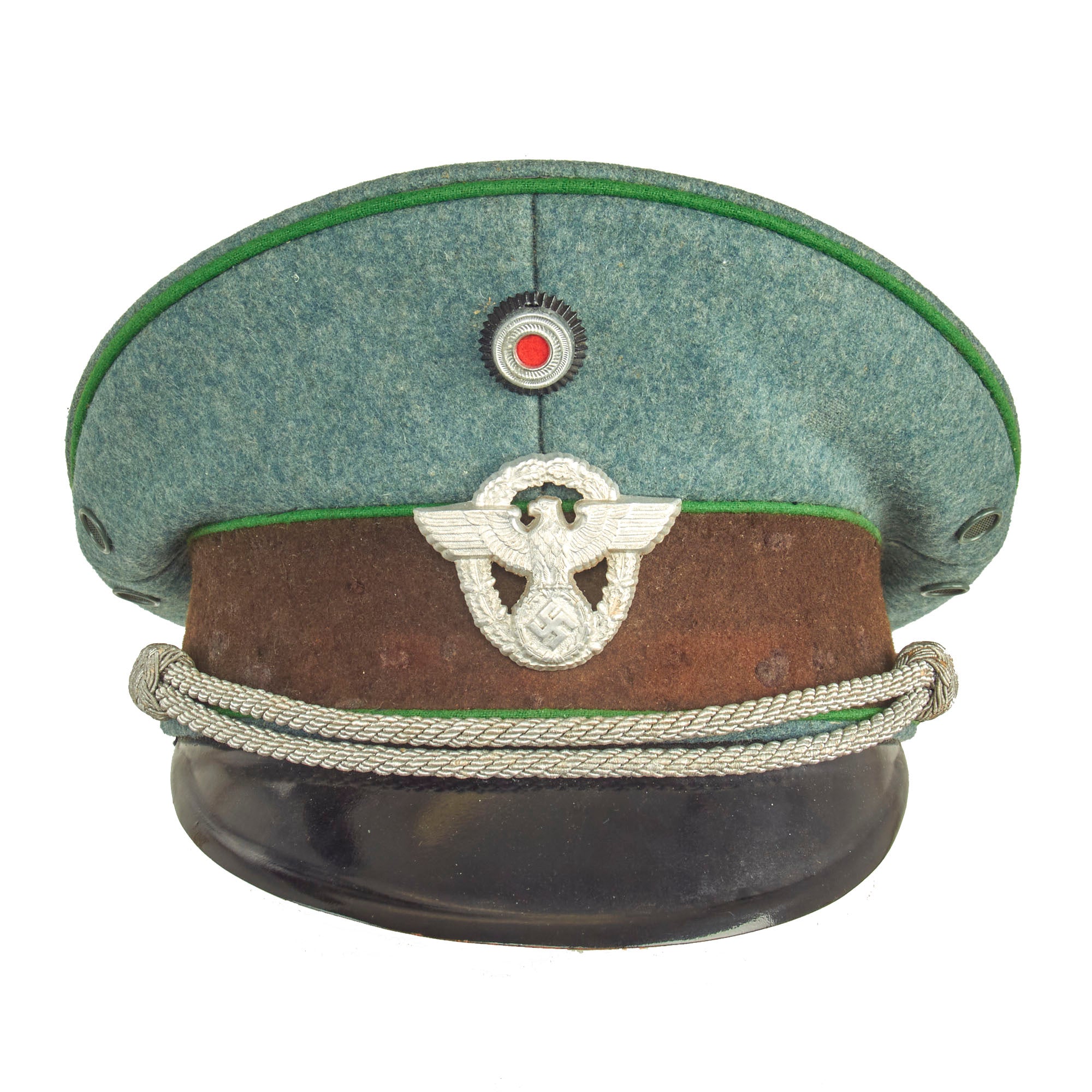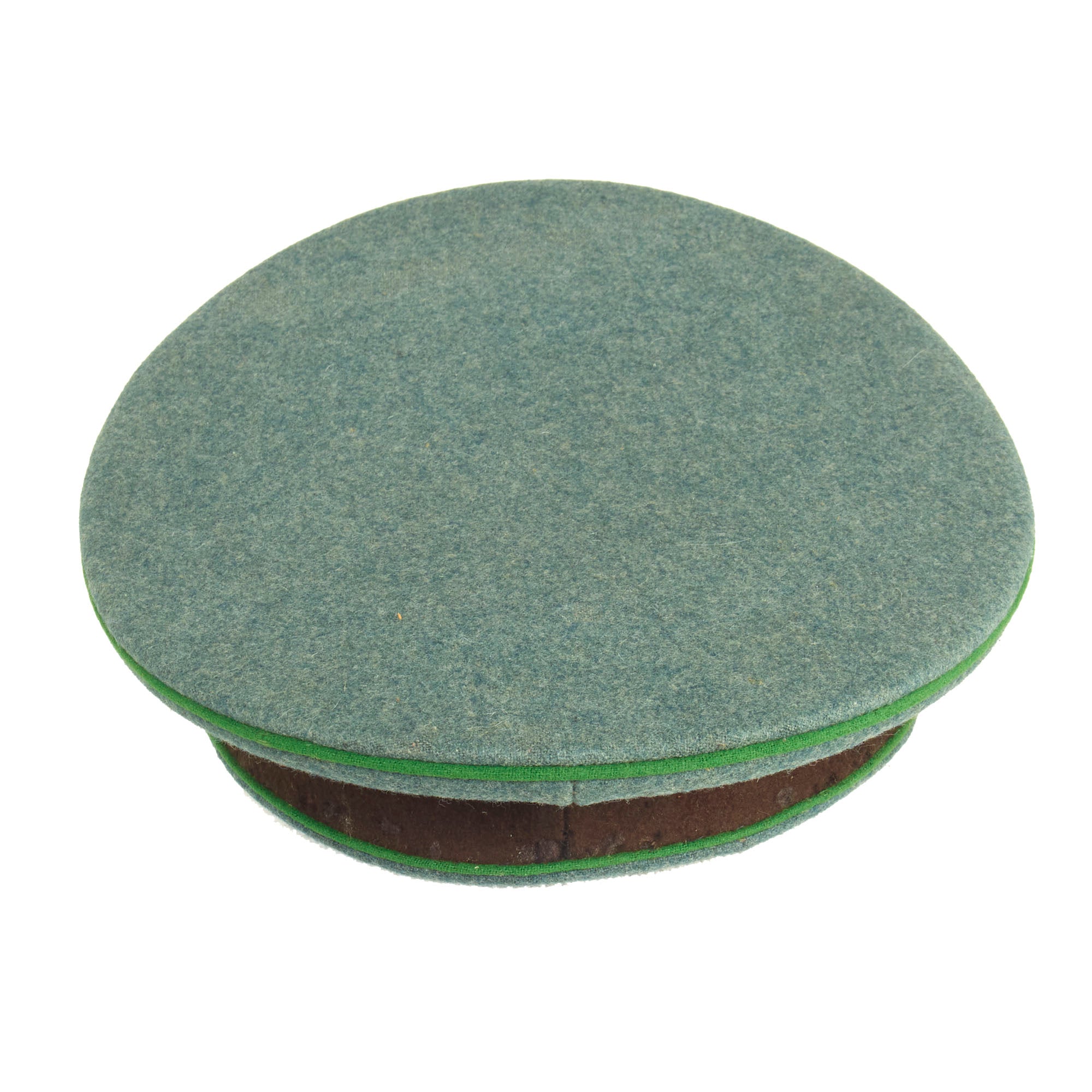 This is a very good condition condition German WWII Schutzpolizei Schirmmütze Visor Cap, with a lovely sloped "Saddle Form" shape. It looks to originally have been constructed this way, as it has this shape even though the crown stiffener is still present. The front peak of the cap is also quite high, especially when compared to other visor caps we usually see. It is fabricated from the correct police blue green wool gabardine, with a brown "badge cloth" band and a traditional high front. The visor cap has matching Hellgrün (Light Green) piping along the top edge and flanking either side of the band, which is the Truppenfarbe (troop colors) for the Schutzpolizei (Protection Police).