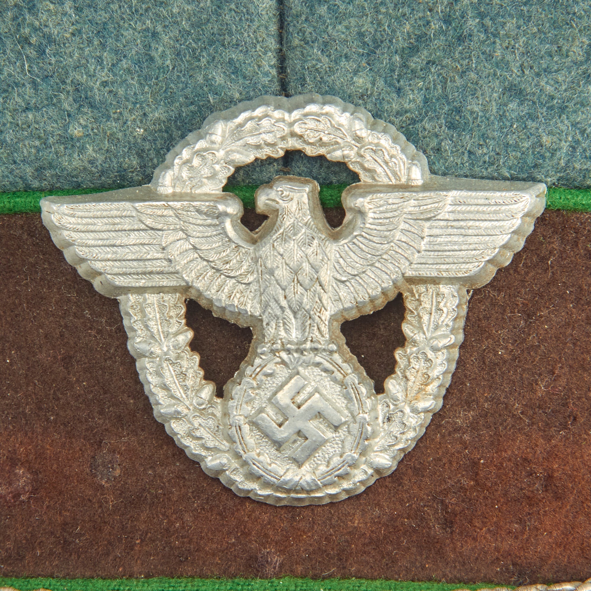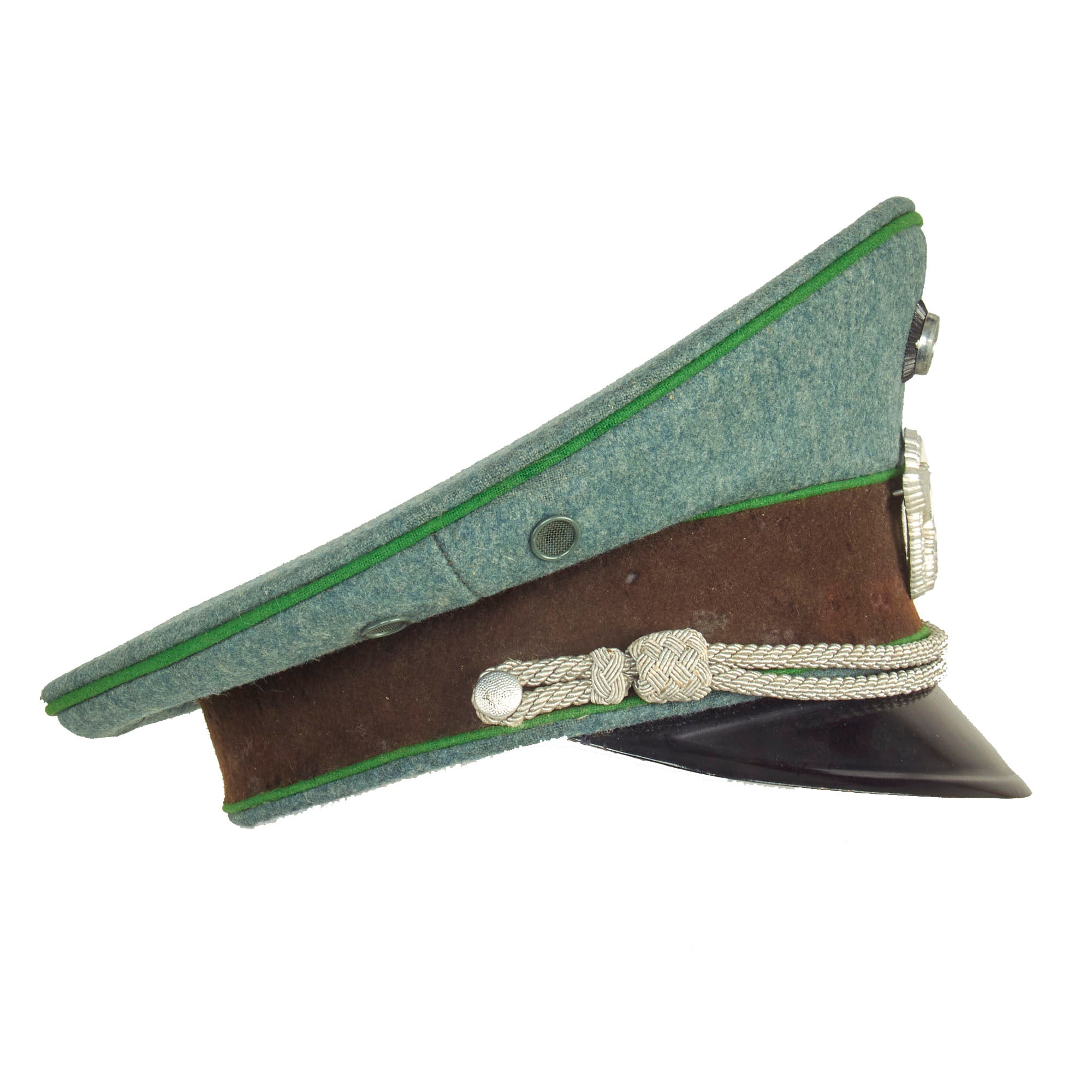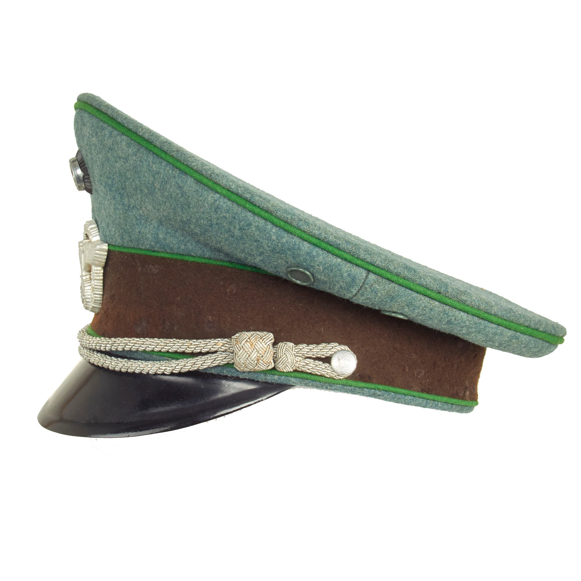 The visor cap (Schirmmütze) was an important part of the headgear worn by German uniformed military, civil, paramilitary and political organizations during the Third Reich. This was the standard cloth headgear worn as a part of the service uniform. Visor caps were worn outdoors as well as indoors, and were often required to be worn by all personnel on duty. Visor caps were made in versions specific to each organization and were often further differentiated through the use of insignia, colored piping, or style of chin cord, to indicate rank, role or branch. The insignia used on these caps ranged from simple stamped metal emblems, to elaborate hand embroidery. Visor caps were issued to enlisted soldiers and NCOs in the military and in some other organizations. Officers had to purchase their own hats, and lower ranks could choose to purchase caps that were of a higher quality than the rather basic, issue examples. The private purchase caps were generally made in very high quality, with fine materials. A wide variety of fabrics were used, from Trikot and doeskin, to heavy wool, or even lightweight white fabric for summer wear. In the military, issue of these caps was generally suspended shortly after the outbreak of the war, but they continued to be worn by some troops until the end of the war.