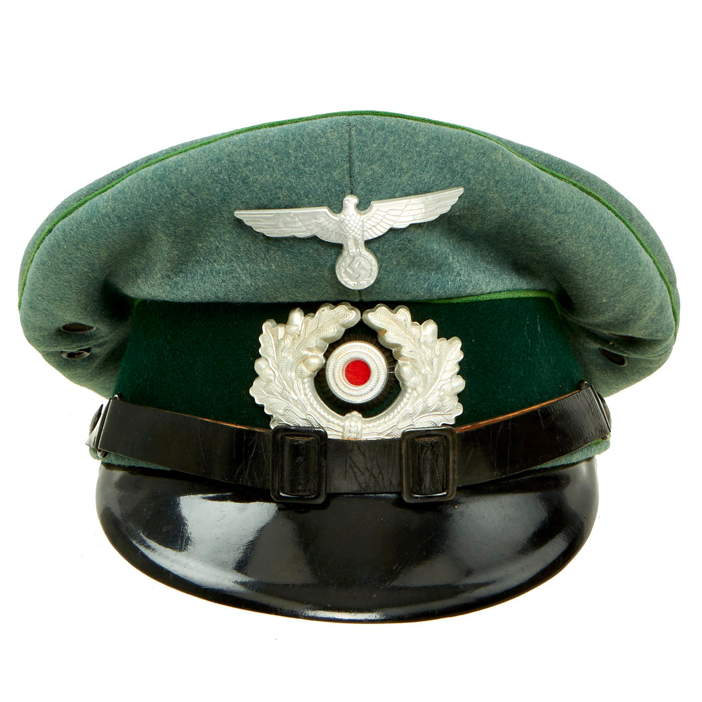 Original Item: Only One Available. This is a great condition German WWII Heer Army EM/NCO Schirmmütze Visor Cap, with a lovely "Crushed" shape, and a very interesting history! During WWII, caps and other uniform components were often "converted" to be used for another branch, if the color was suitable. This was especially true for the Schutzpolizei, as the blue/green wool they used was very similar in color to the Heer Army field gray, and converted examples of Visor caps and M43 field caps have been seen. The police insignia would be removed, and the Heer / Wehrmacht insignia installed in its place. At this time damaged or worn out components of the caps might also be replaced.