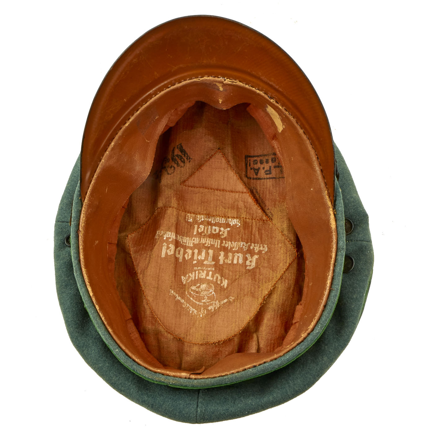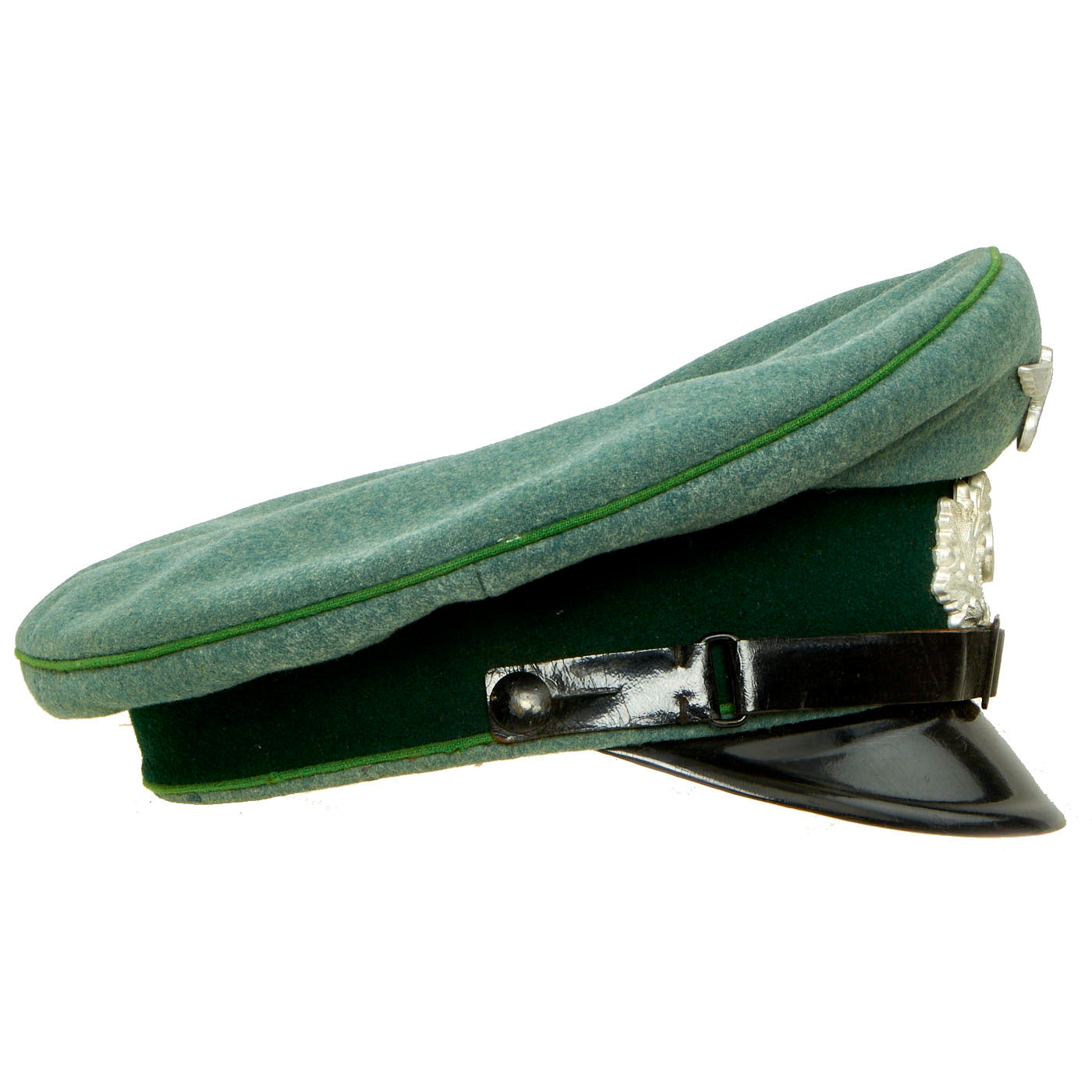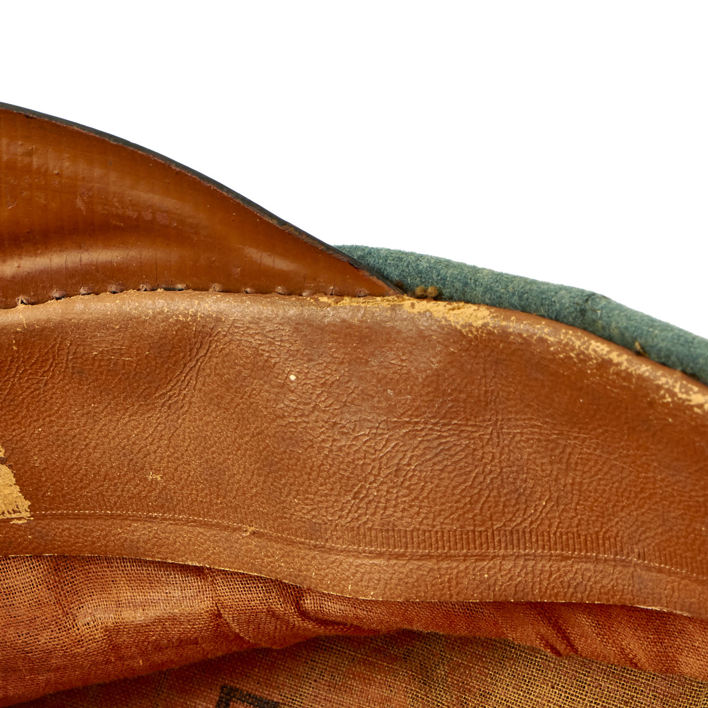 The "saddle-form" shape of this visor cap is highly desirable, and later in the war caps were made without stiffeners, so they would have this shape from the start. The cap shows high quality fabrication, made with police blue green wool gabardine, with a forest green "badge cloth" band and a traditional high front. The visor cap has matching Hellgrün (Light Green) piping along the top edge and flanking either side of the band, which originally was the Truppenfarbe (troop colors) for the Schutzpolizei (Protection Police). However as a heer cap, this is the Corps Color (Waffenfarbe) for Gebirgsjäger (mountain troops ), Skijäger (ski troops), and Jäger (light infantry troops). We assume this is the function it served after conversion.