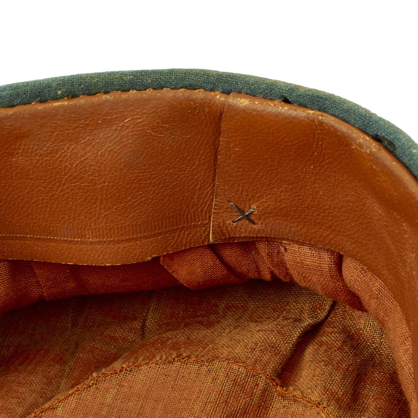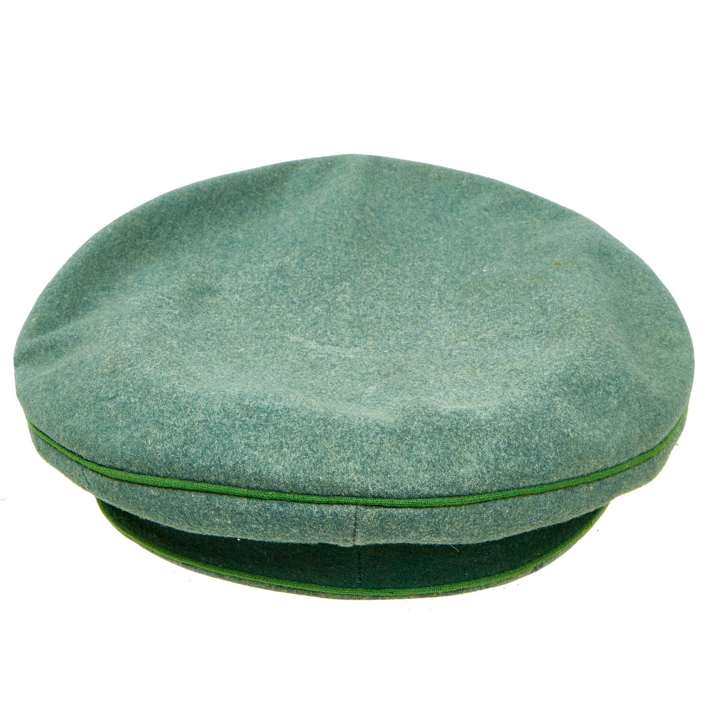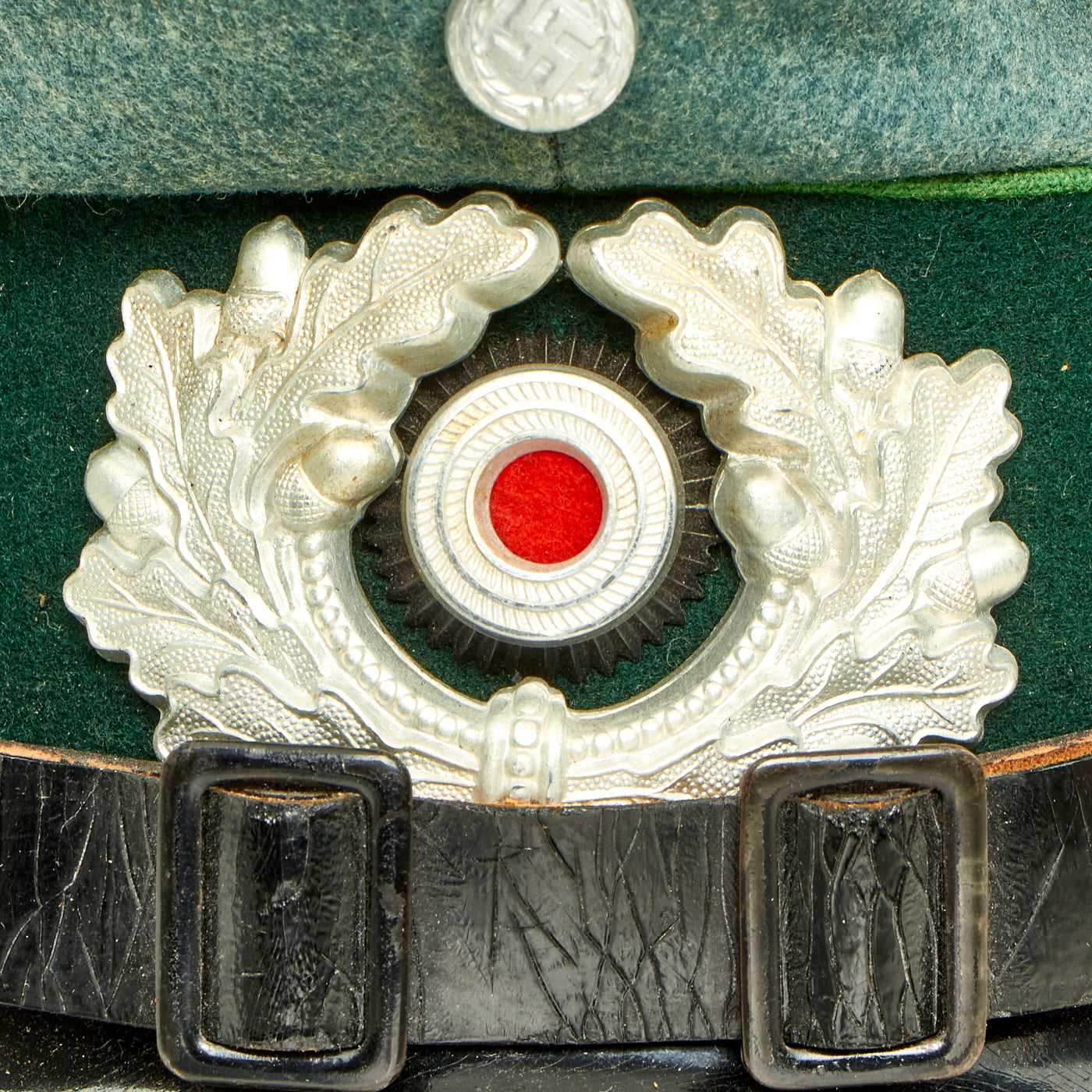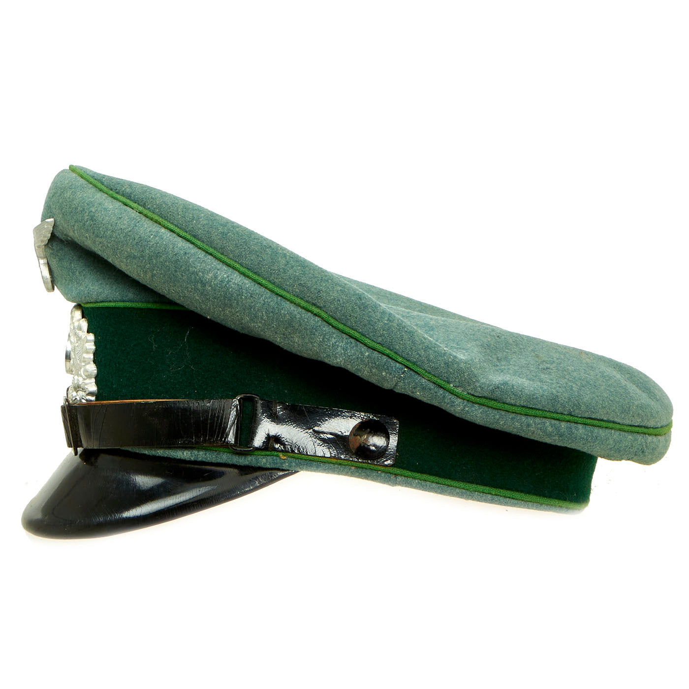 The "saddle-form" shape of this visor cap is highly desirable, and later in the war caps were made without stiffeners, so they would have this shape from the start. The cap shows high quality fabrication, made with police blue green wool gabardine, with a forest green "badge cloth" band and a traditional high front. The visor cap has matching Hellgrün (Light Green) piping along the top edge and flanking either side of the band, which originally was the Truppenfarbe (troop colors) for the Schutzpolizei (Protection Police). However as a heer cap, this is the Corps Color (Waffenfarbe) for Gebirgsjäger (mountain troops ), Skijäger (ski troops), and Jäger (light infantry troops). We assume this is the function it served after conversion.
