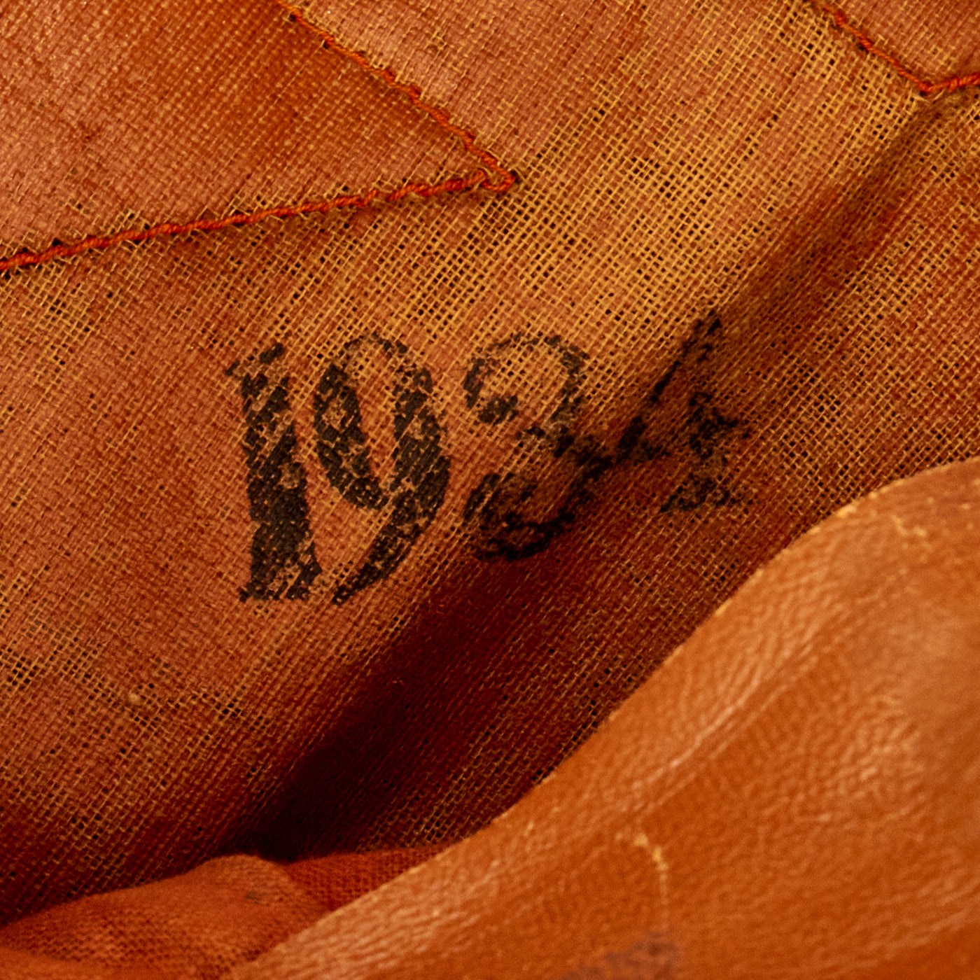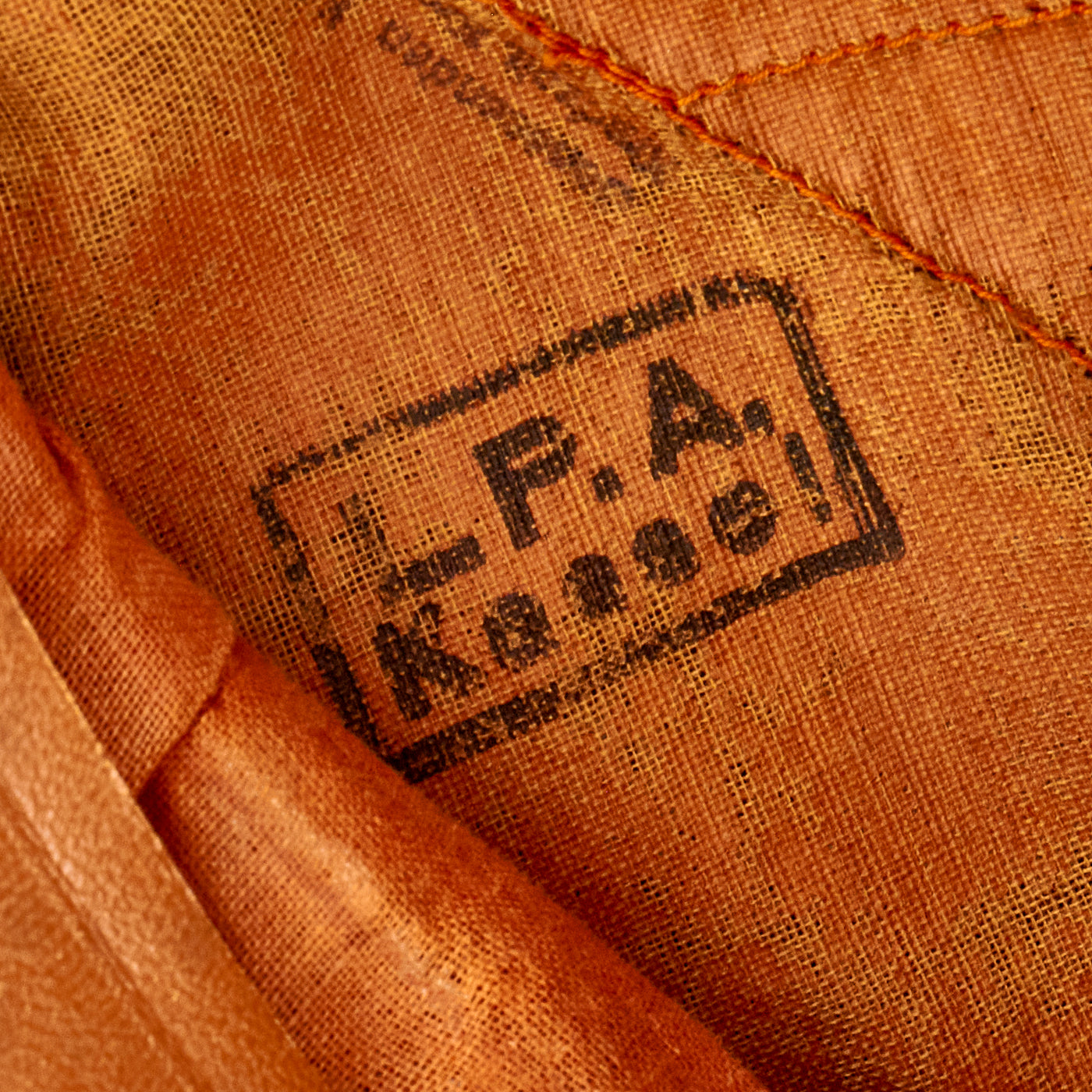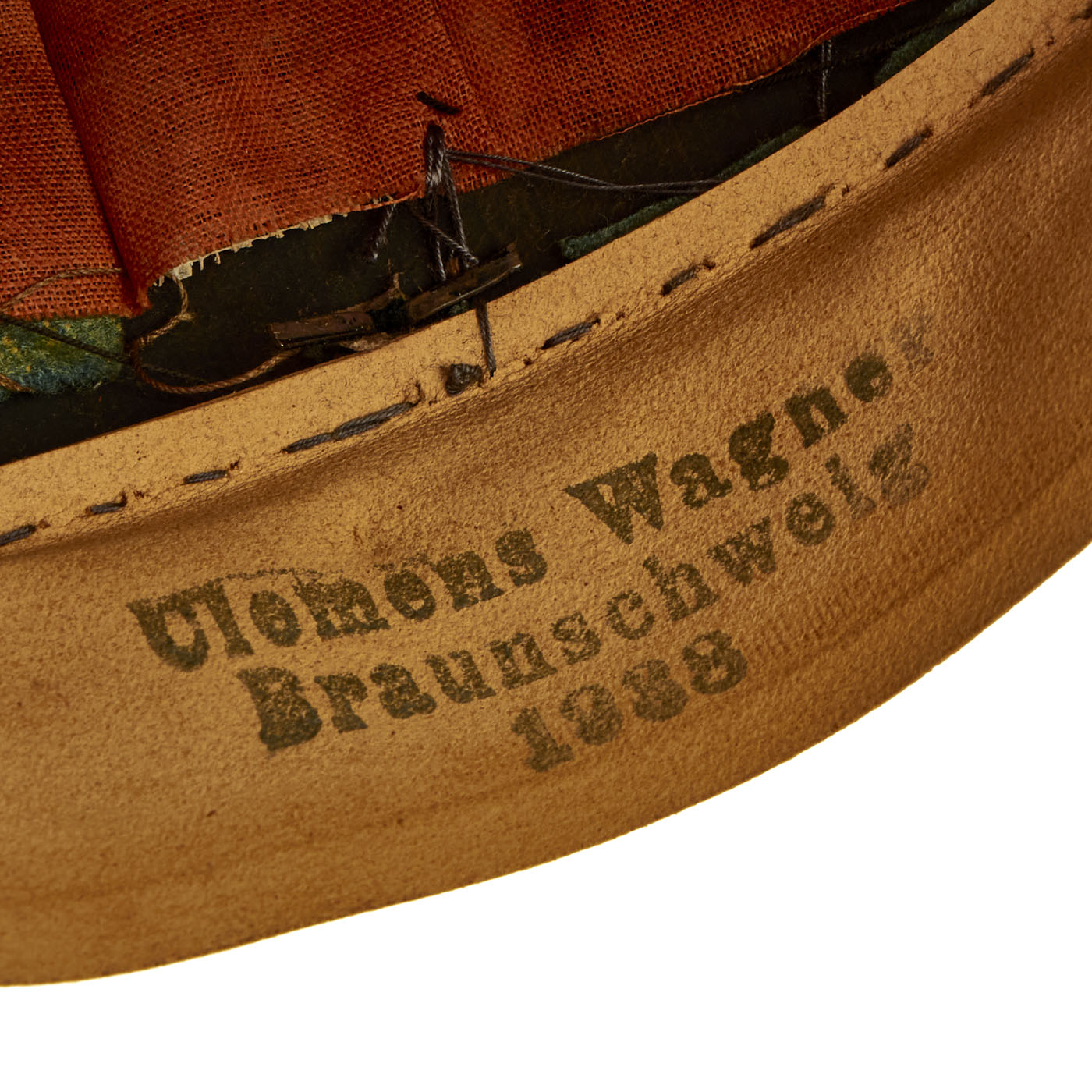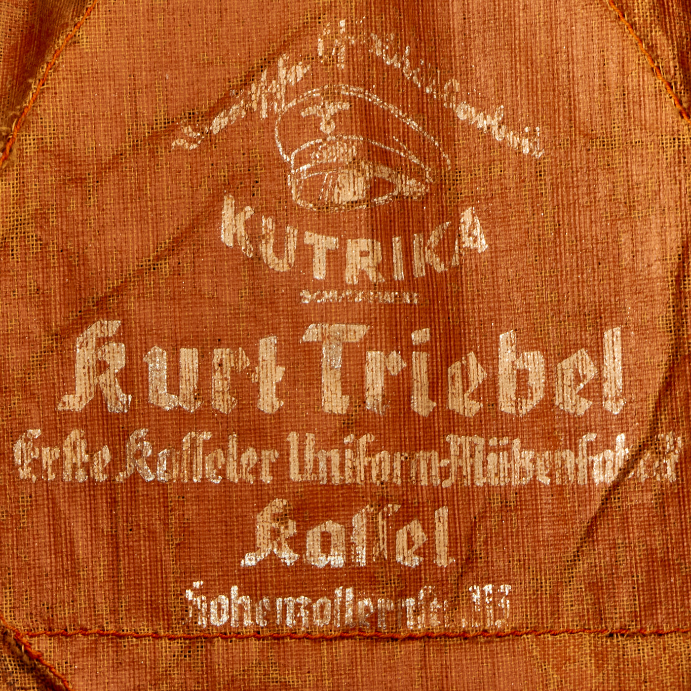 The inside of the cap is lined with lightweight light brown oil cloth, and the top has the maker logo of Kurt Triebel of Kassel. The top sweat shield diamond is completely missing, but the stitching remains. and there are very interesting markings stamped as well, including 1934 and L.P.A. / Kassel. This would seem to indicate that it is a very early cap, however that would also make it predate the official Schutzpolizei uniform standards, so we believe that it is a unit marking for the "Land Police" in Kassel. The underside of the sweatband however is marked Clemens Wagner / Braunschweig / 1938, suggesting it had the sweatband replaced and possibly converted to a Heer Visor cap at that location in 1938. Definitely some great research potential!