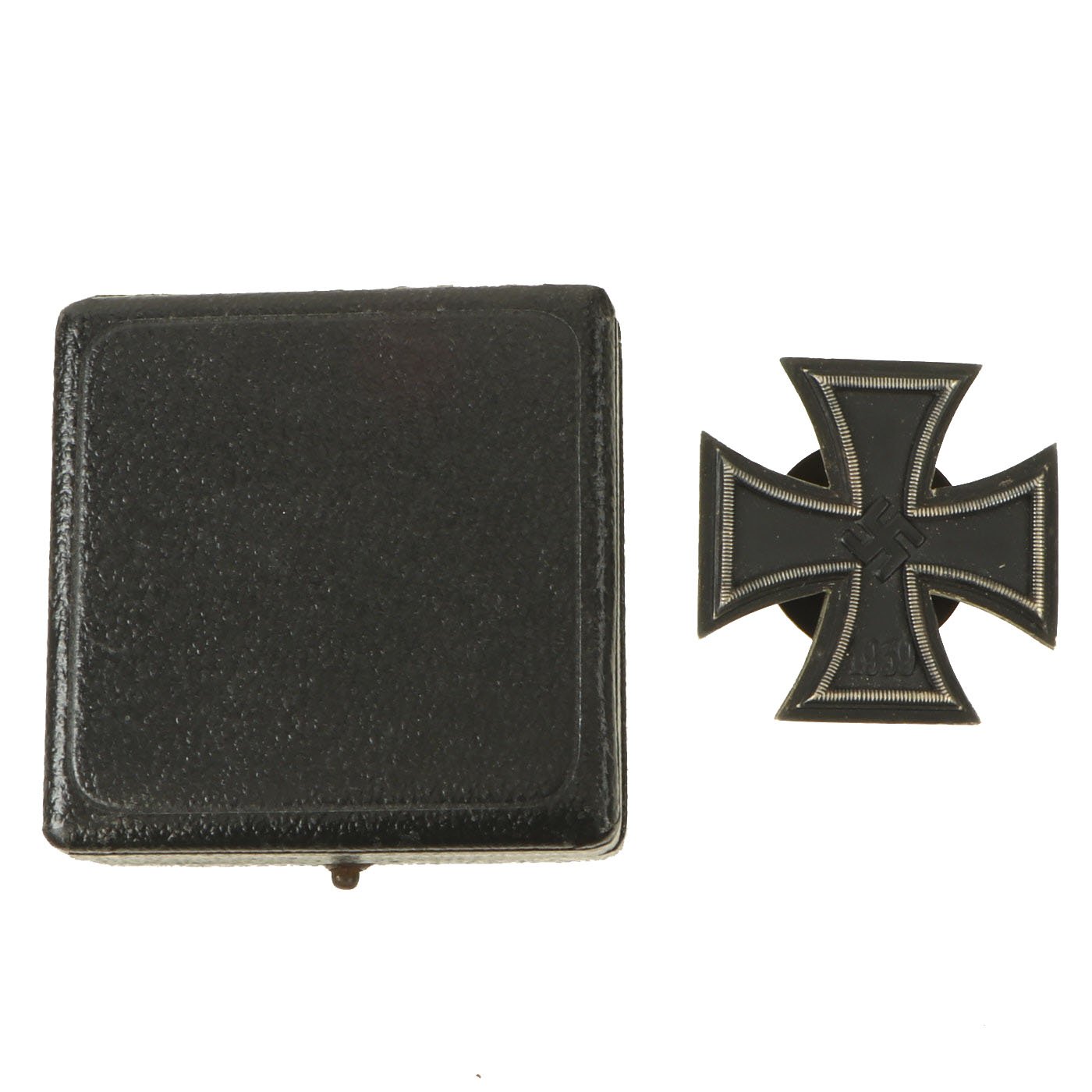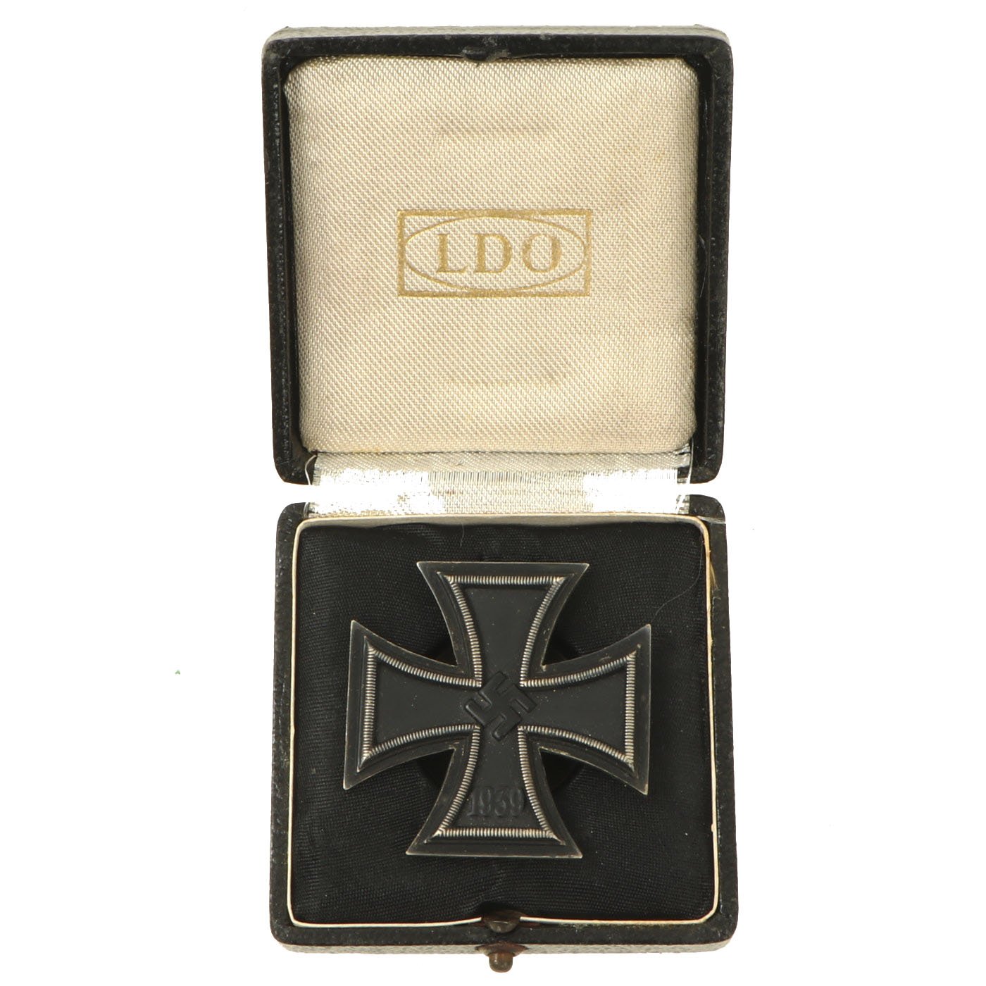 Original Items: Only One Available. This is a very rare and sought after "Screw Back" version of the 1939 Eisernes Kreuz (Iron Cross) 1st Class, in its original LDO box. No Iron Cross collection is complete without the rare LDO box. This one shows only minor wear, with a lovely black exterior. Thankfully, the original hinge is still intact and works nicely, as does the original closure clip. The typical black artificial leather covering has traces of handling and age. The interior of the case is also very nice with minor wear. The cross sits on a black rayon covered insert, with an inlet for the screw back. The inside lid is marked with a faced gold LDO logo, which stands for Leistungsgemeinschaft Deutscher Ordenhersteller (Guild of German awards manufacturers).