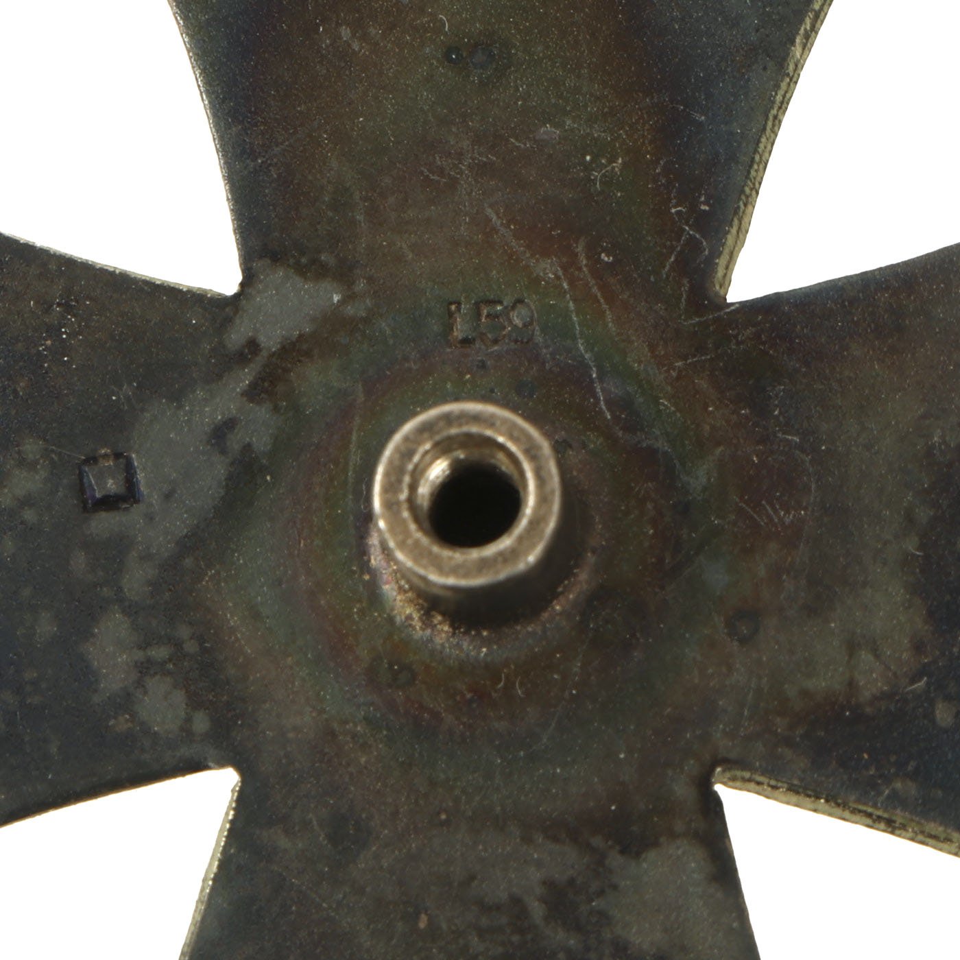 Inside the rare case is an excellent condition example of a WWII Iron Cross First Class 1939, with a Magnetic core, flat design, and rare screw back attachment. It is maker marked with LDO number L59 on the back under the screw back, which represents Alois Rettenmaier of Schwäbisch-Gmünd. The LDO, was a self-governing organization formed in 1941 which regulated the manufacturing of all German awards. The firm Alois Rettenmaier was a partially licensed in the organization, entry number 59.