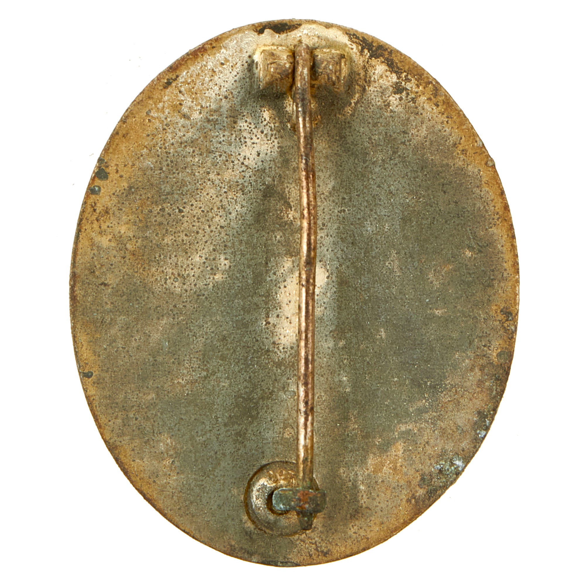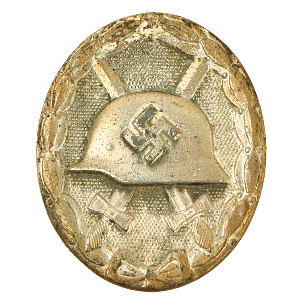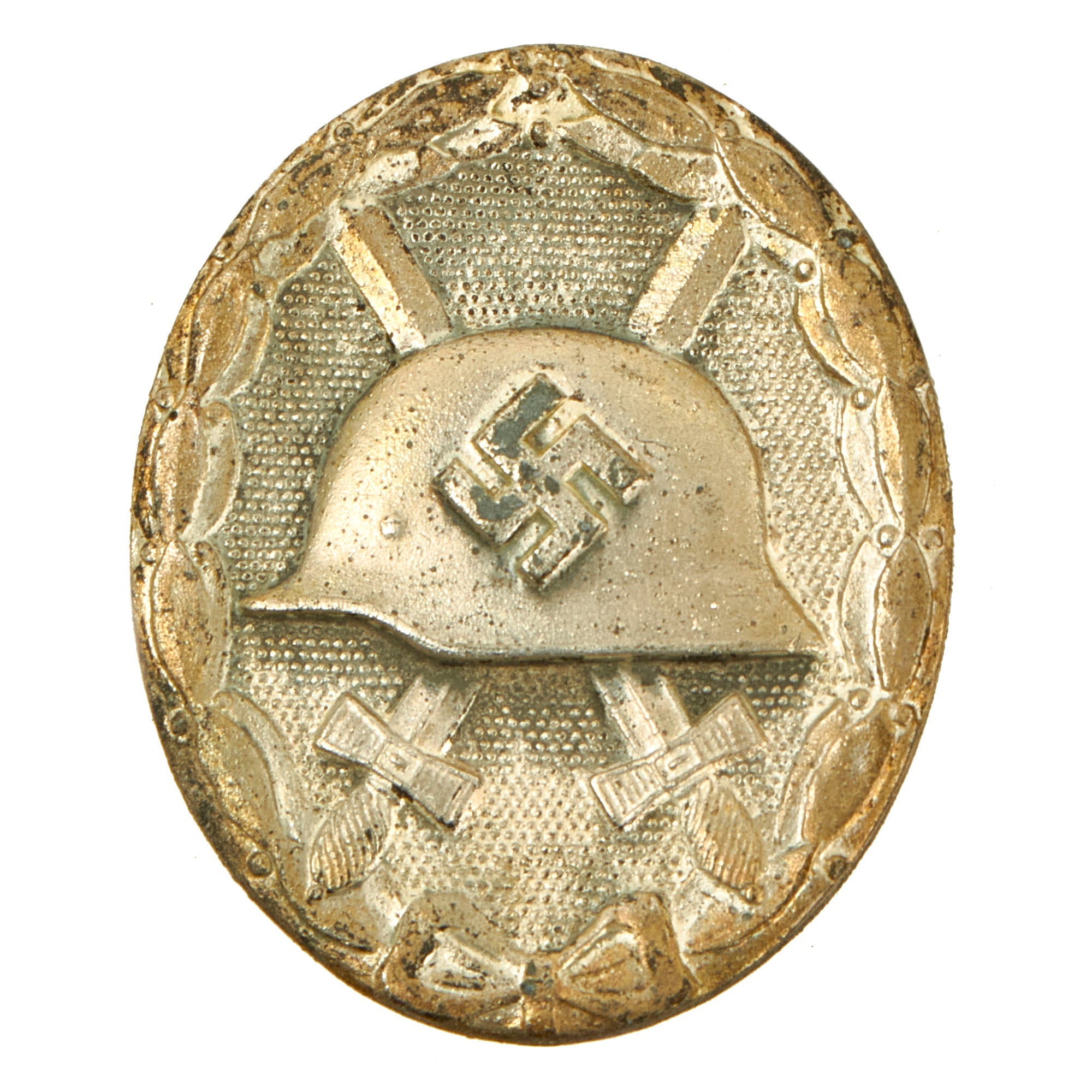 Original Item: Only One Available. This is very nice service used condition German WWII Second Class Silver grade Wound Badge (Verwundetenabzeichen 2. Klasse in Silber). It is constructed out of a die struck, zinc-alloy base that has been silver washed. The oval badge depicts an embossed profile of a mobile swas (hook cross), above an M35 pattern helmet, which is above two crossed broad swords. This then lies on a pebbled field and is surrounded by a laurel leaf and berry wreath which is tied together at the bottom with a bow tie.