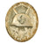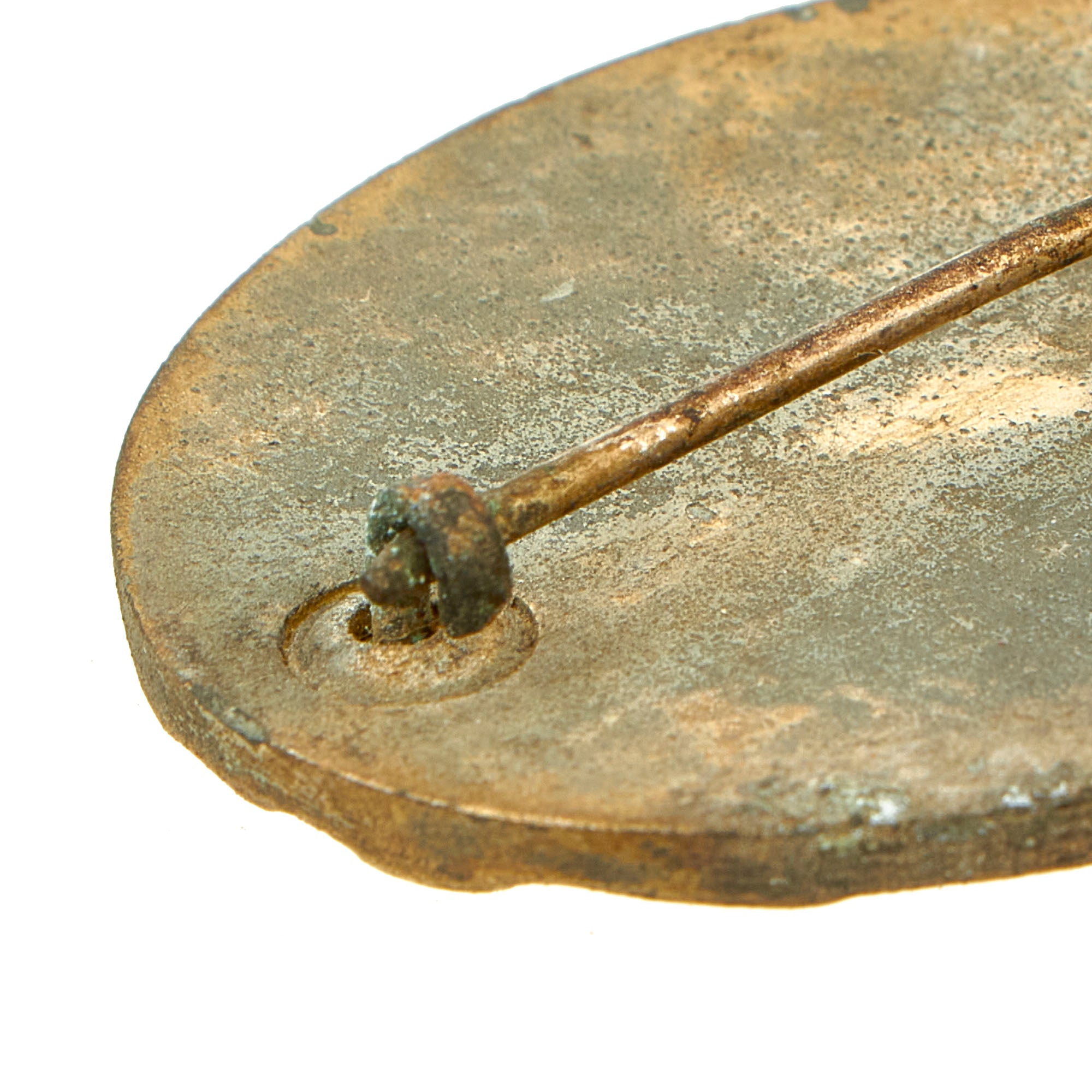 The steel pin, stamped hinge and stamped catch are all intact and in working condition. The silver wash remains in very good condition on the obverse, showing some flaking and oxidation on the obverse, particularly on the swas. The rear shows a bit more oxidation. The badge measures 1.75 inches high by 1.5 inches wide.