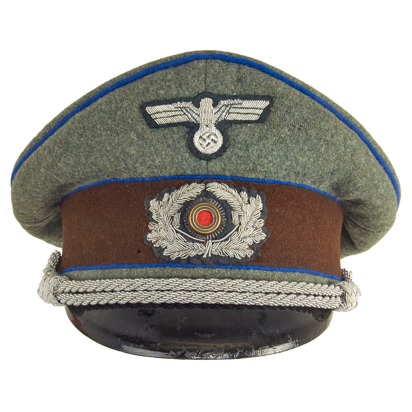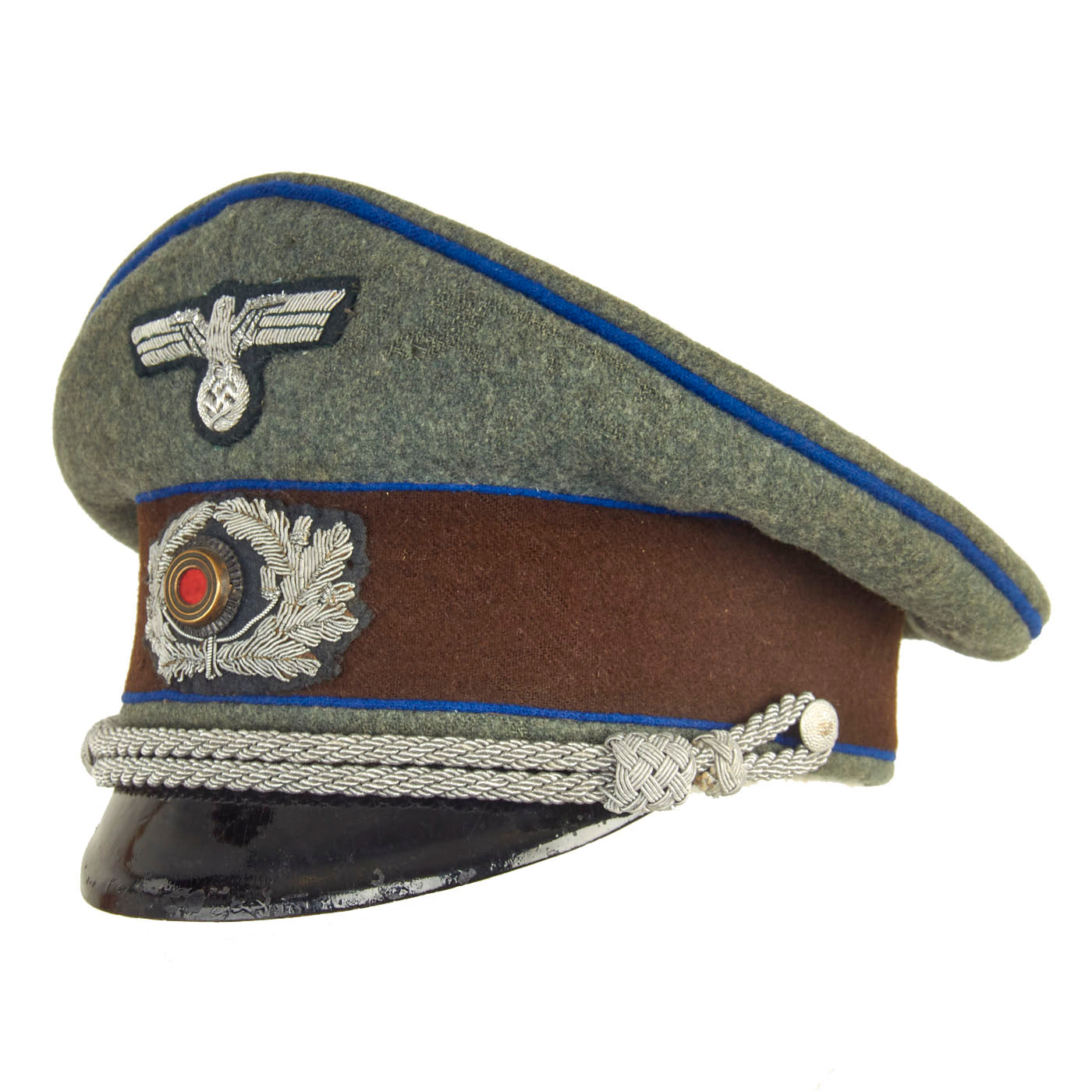 The visor cap (Schirmmütze) was an important part of the headgear worn by German uniformed military, civil, paramilitary and political organizations during the Third Reich. This was the standard cloth headgear worn as a part of the service uniform. Visor caps were worn outdoors as well as indoors, and were often required to be worn by all personnel on duty. Visor caps were made in versions specific to each organization and were often further differentiated through the use of insignia, colored piping, or style of chin cord, to indicate rank, role or branch. The insignia used on these caps ranged from simple stamped metal emblems, to elaborate hand embroidery. Visor caps were issued to enlisted soldiers and NCOs in the military and in some other organizations. Officers had to purchase their own hats, and lower ranks could choose to purchase caps that were of a higher quality than the rather basic, issue examples. The private purchase caps were generally made in very high quality, with fine materials. A wide variety of fabrics were used, from Trikot and doeskin, to heavy wool, or even lightweight white fabric for summer wear. In the military, issue of these caps was generally suspended shortly after the outbreak of the war, but they continued to be worn by some troops until the end of the war.