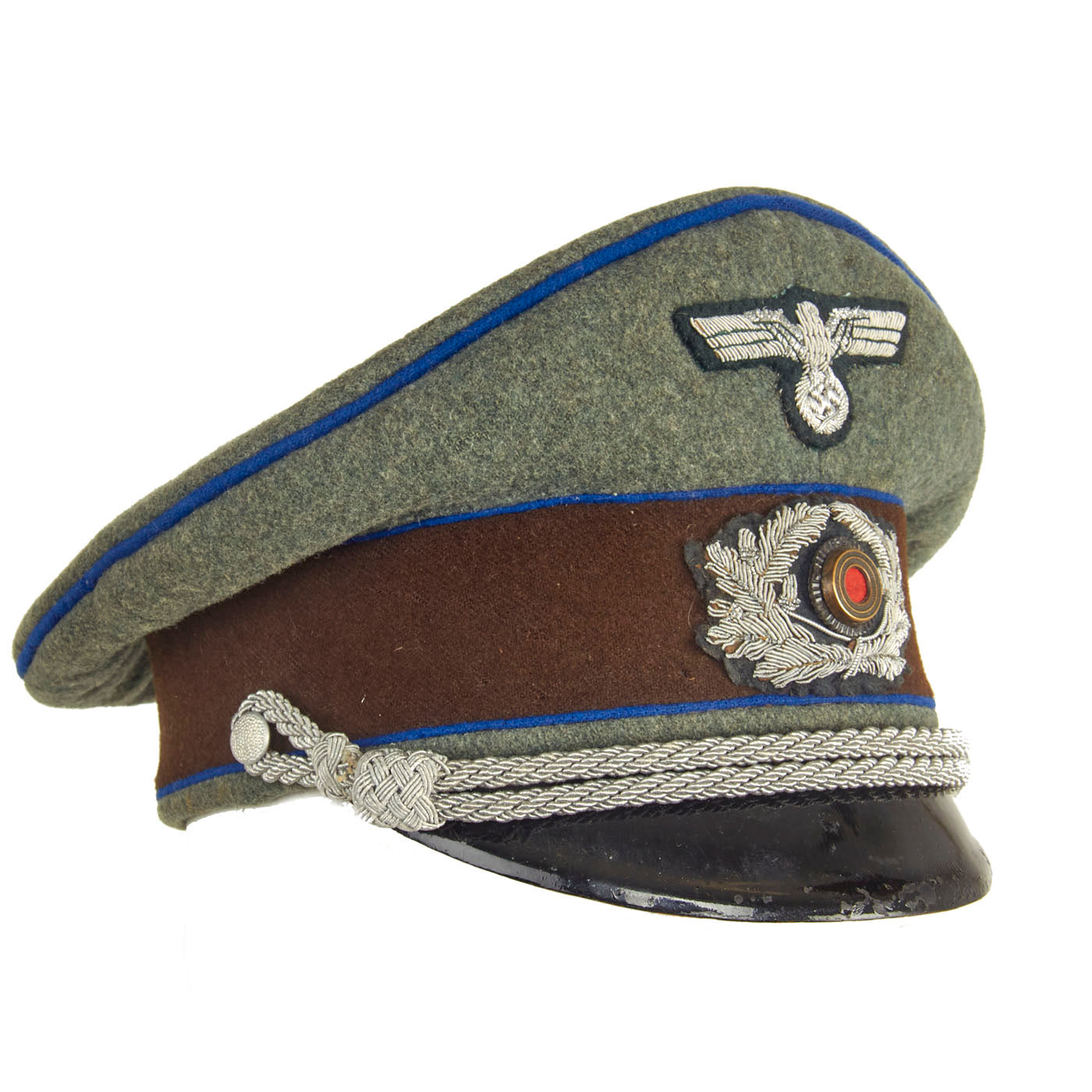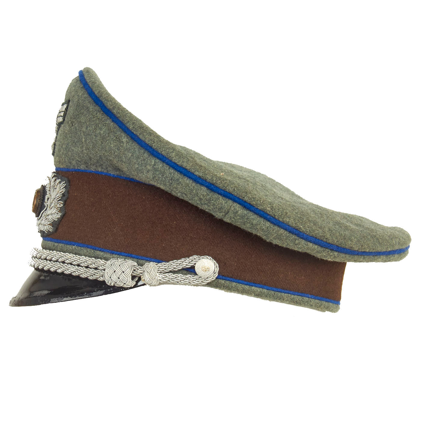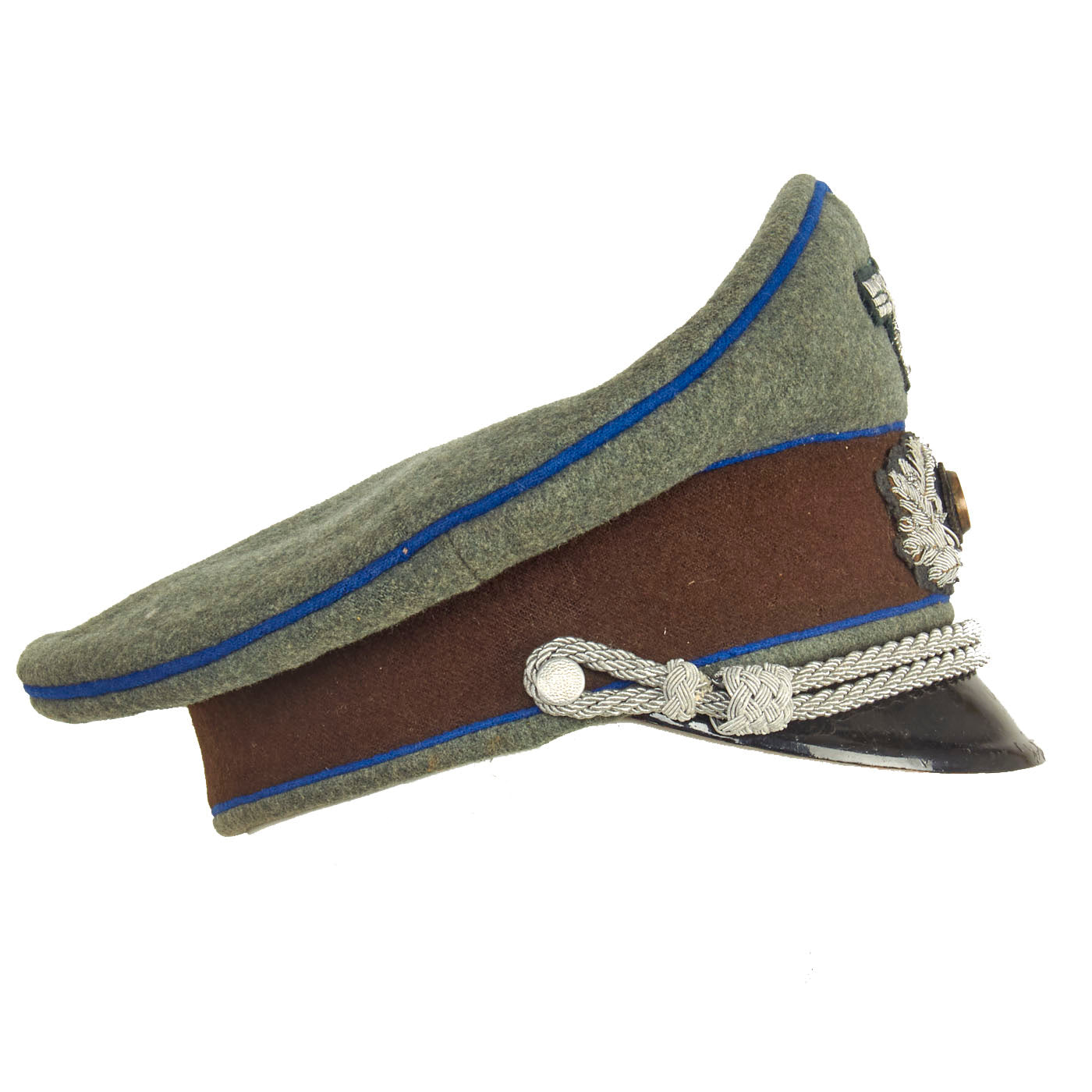 This is a very nice example of a German WWII Secret Field Police Officer Schirmmütze visor cap, and it really looks the business. It features the typical green wool gabardine construction with a mid-brown badge cloth center band and a traditional high forward crown. The also has matching blue piping along the top edge and flanking either side of the band, the Corps Color (Truppenfarbe) for the Secret Field Police. The regular field police used an orange corps color. It has the correct silver bullion chin strap, indicating that it is for an officer.