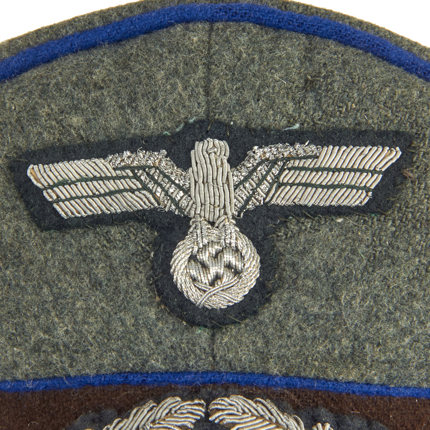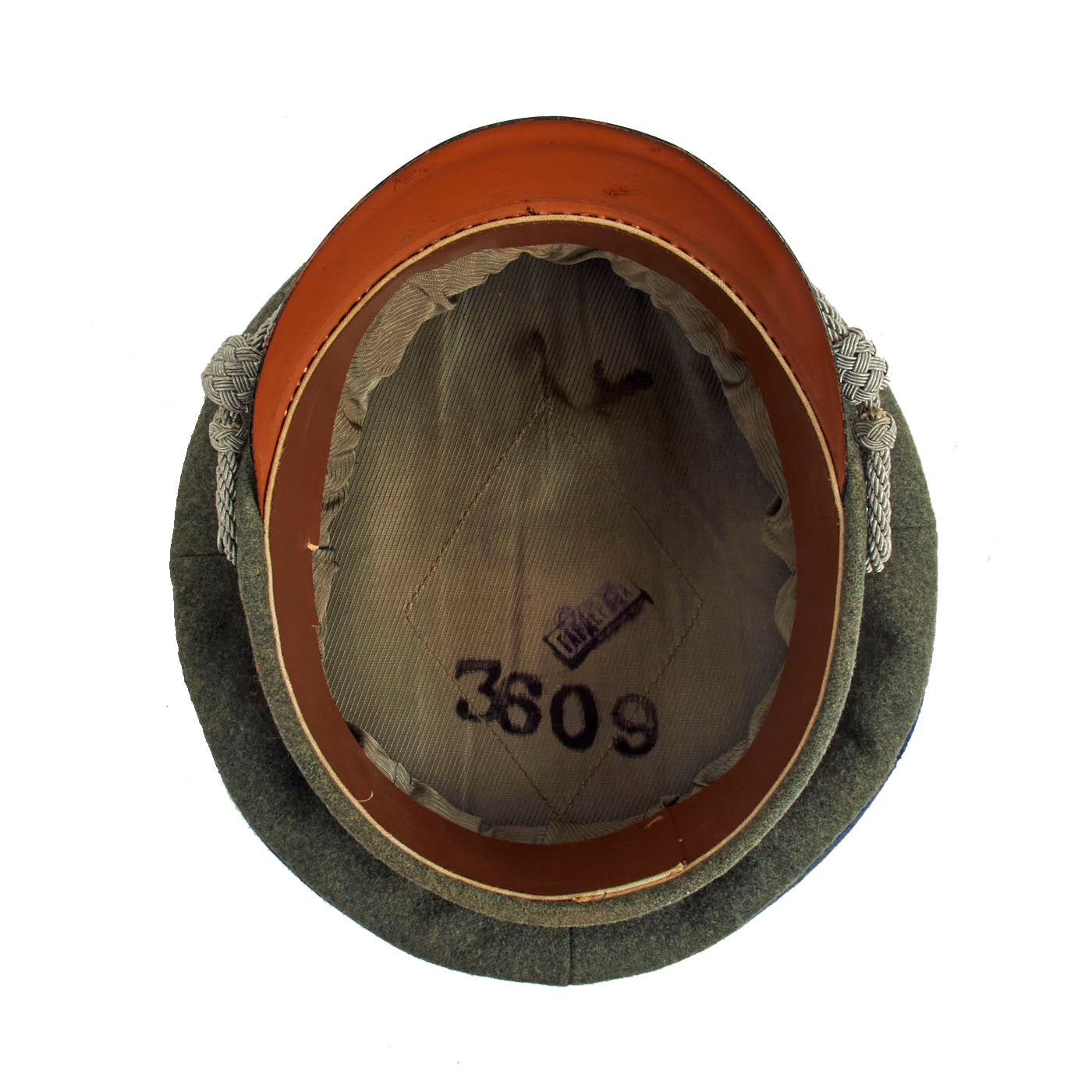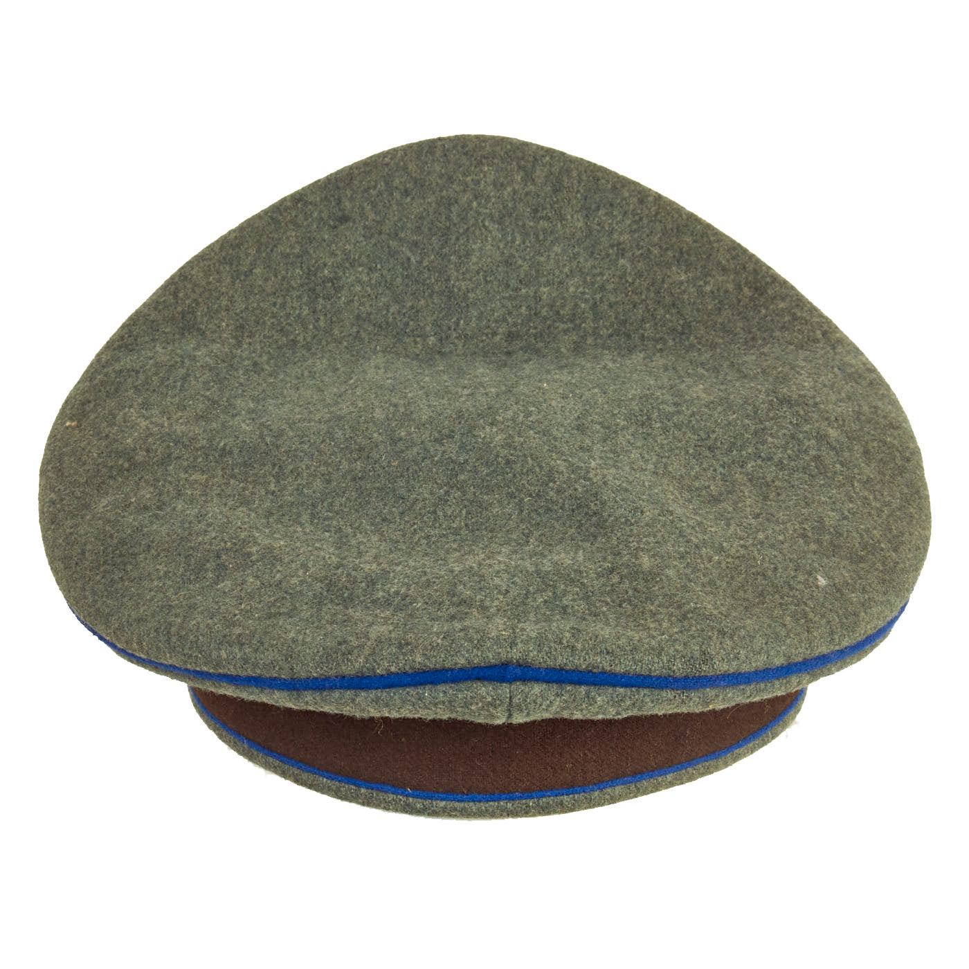 This is a very nice example of a German WWII Secret Field Police Officer Schirmmütze visor cap, and it really looks the business. It features the typical green wool gabardine construction with a mid-brown badge cloth center band and a traditional high forward crown. The also has matching blue piping along the top edge and flanking either side of the band, the Corps Color (Truppenfarbe) for the Secret Field Police. The regular field police used an orange corps color. It has the correct silver bullion chin strap, indicating that it is for an officer.
