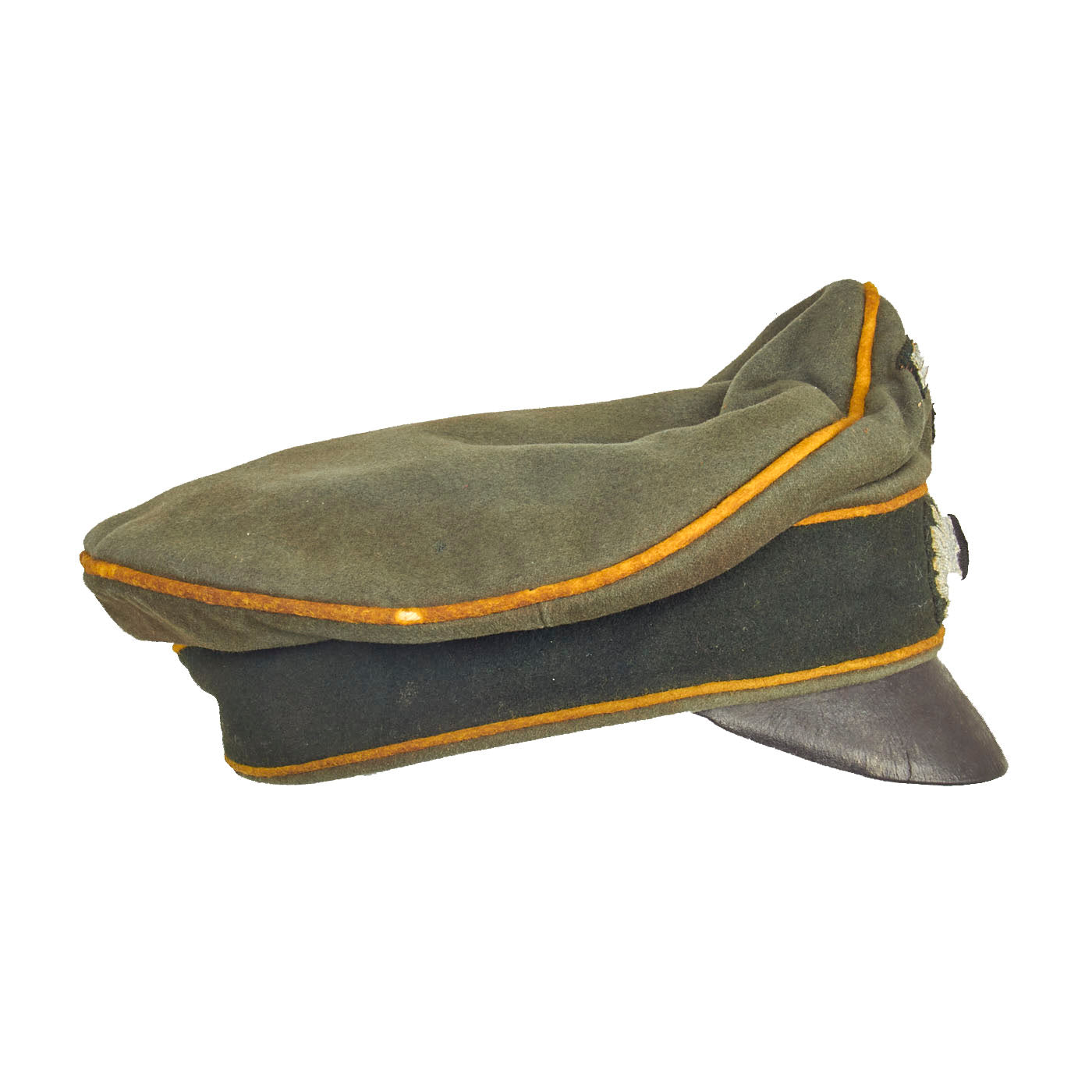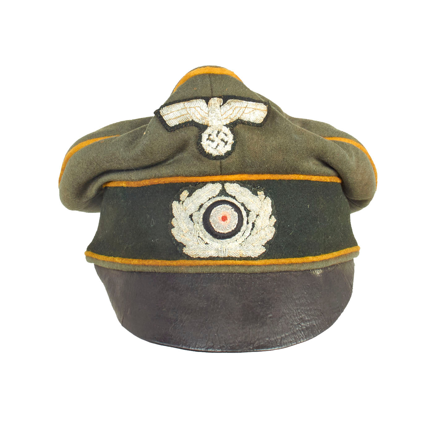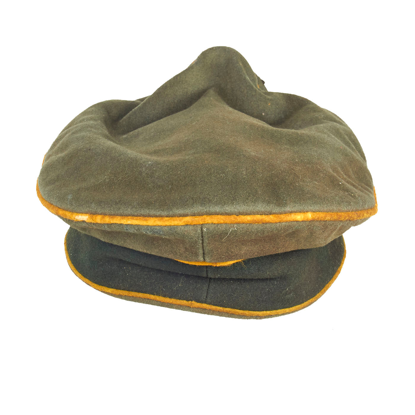 Original Item: Only One Available. This cap is a very nice service used example of a German WWII Wehrmacht Heer Army Officer's Schirmmütze (visor cap), with a lovely "Crushed" shape. This "saddle-form" shape is highly desirable, and accomplished by removing the crown support stiffener ring. It features the typical feldgrau (field gray) "whipcord" weave wool construction with a forest green "badge cloth" band and a traditional high forward crown.