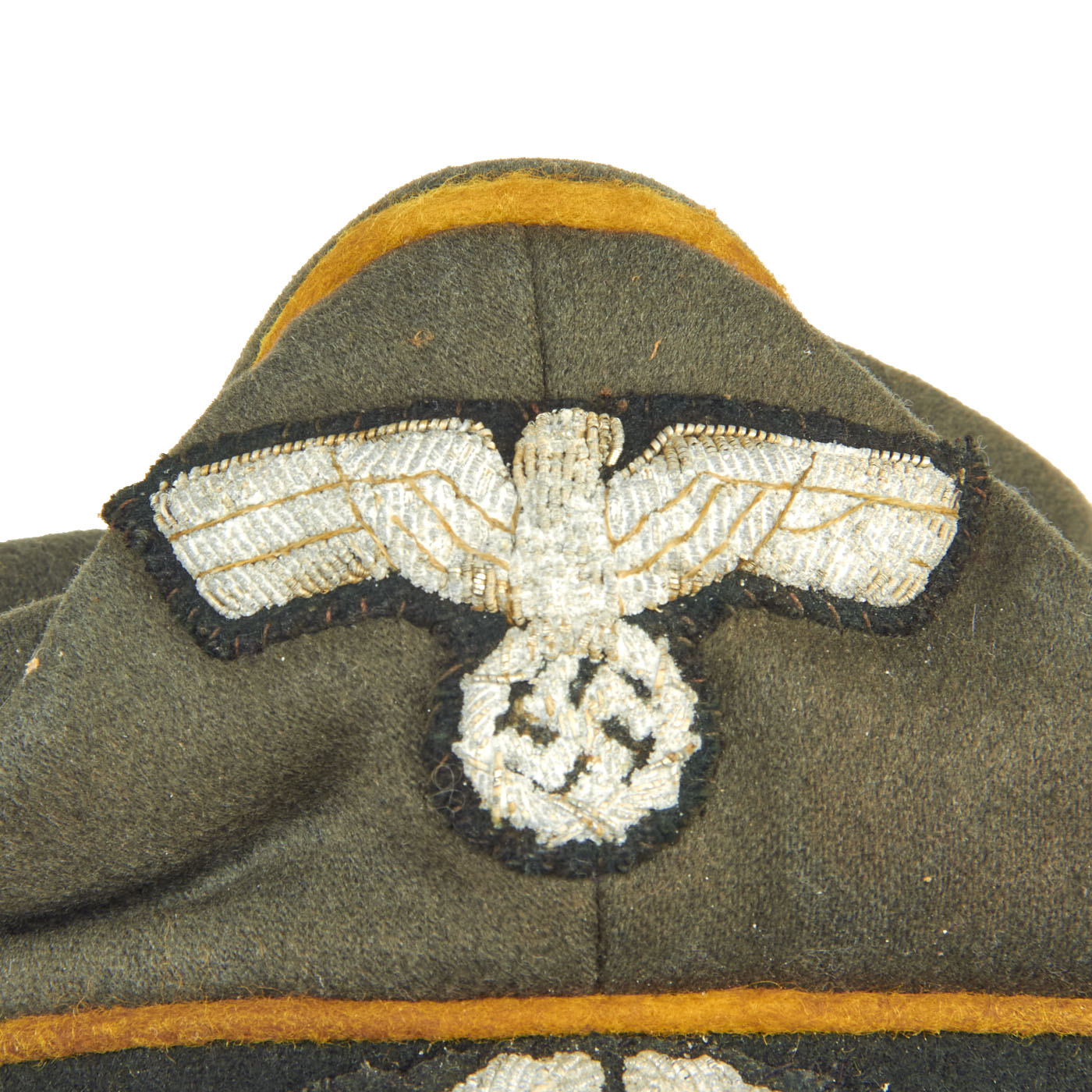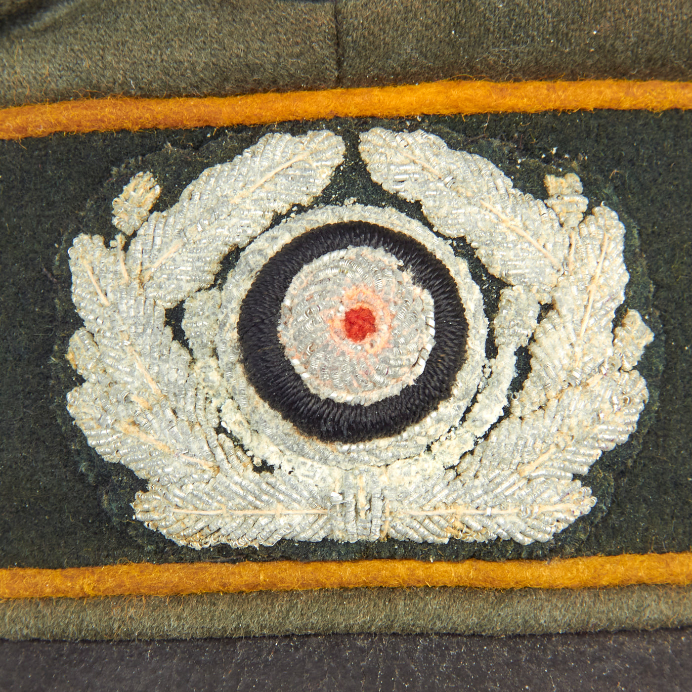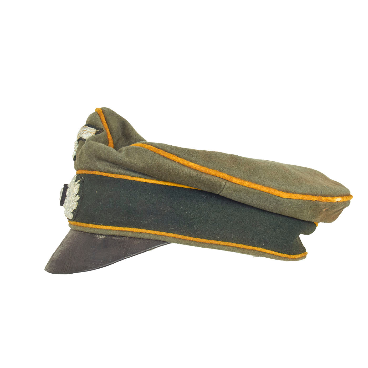 Original Item: Only One Available. This cap is a very nice service used example of a German WWII Wehrmacht Heer Army Officer's Schirmmütze (visor cap), with a lovely "Crushed" shape. This "saddle-form" shape is highly desirable, and accomplished by removing the crown support stiffener ring. It features the typical feldgrau (field gray) "whipcord" weave wool construction with a forest green "badge cloth" band and a traditional high forward crown.