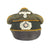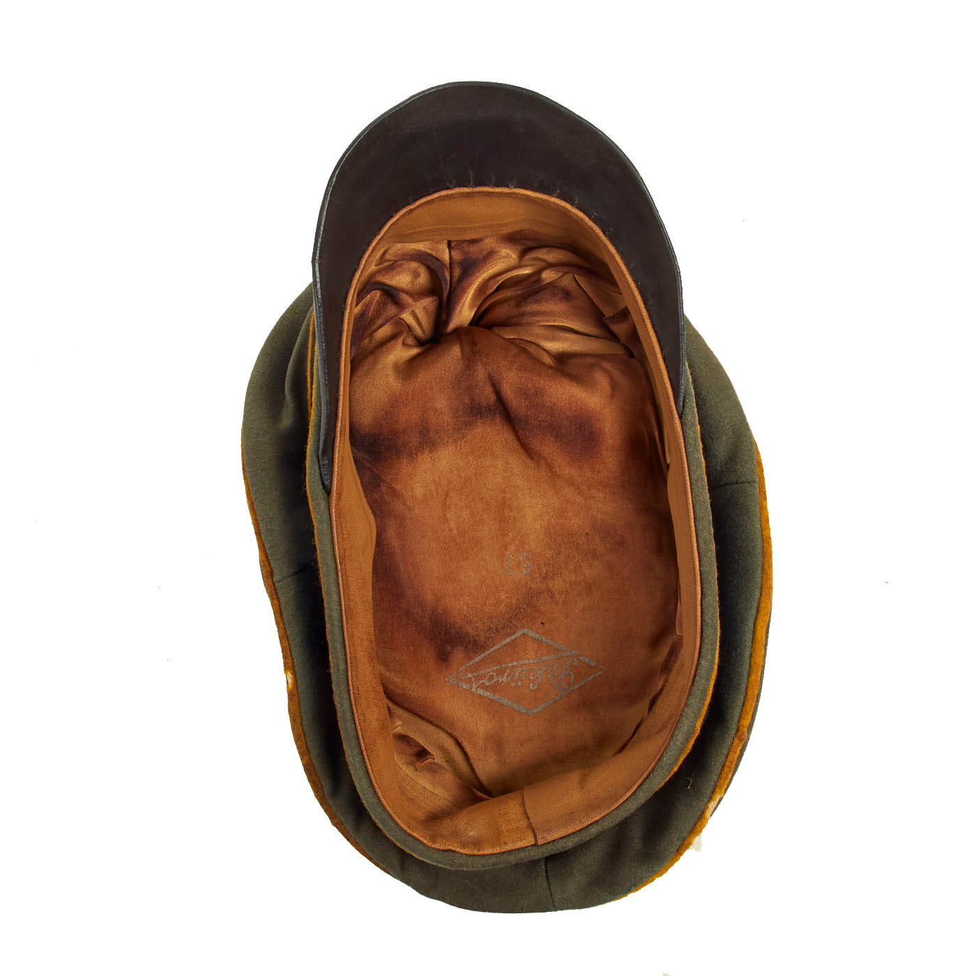 It features the typical green wool gabardine construction with a forest green band and a traditional high forward crown. The cap also has matching Goldgelb (Golden Yellow) piping along the top edge and flanking either side of the band, the Corps Color (Waffenfarbe) for Cavalry, as well as reconnaissance and armored reconnaissance units with cavalry traditions.