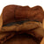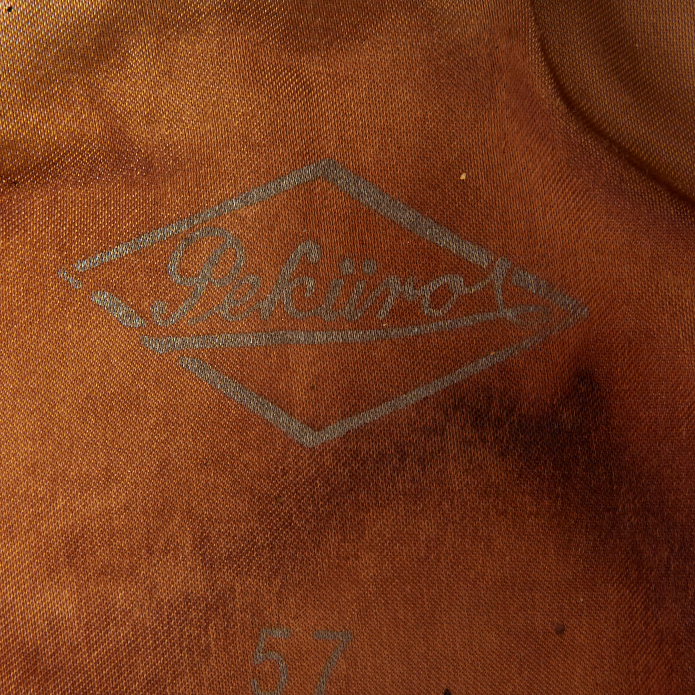 The cap is lined with cream rayon faux silk, much of which is now more of a brown color in areas due to sweat and oil staining, as well as age. There is no sweatshield on this cap, and it does not have any stitch markings indicating that it had one previously. It still has a clear maker name inside a diamond and a size, which are fully legible: