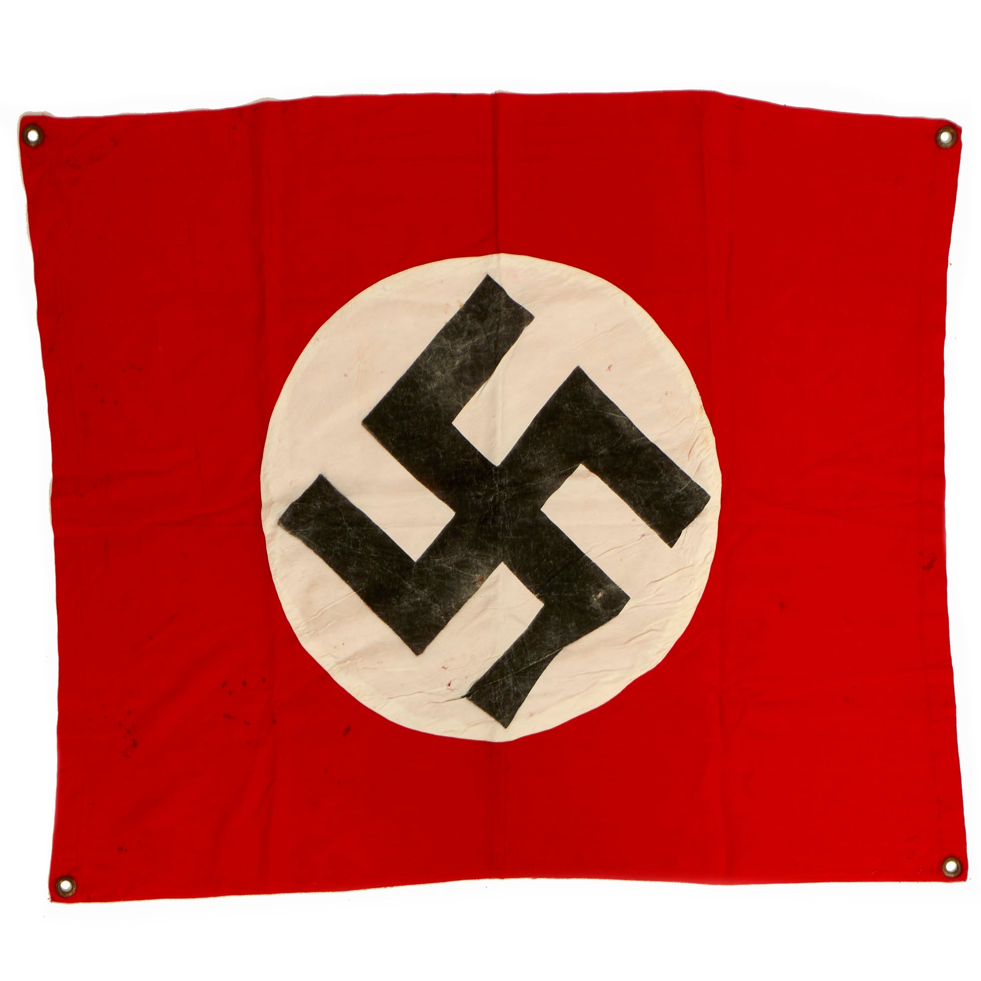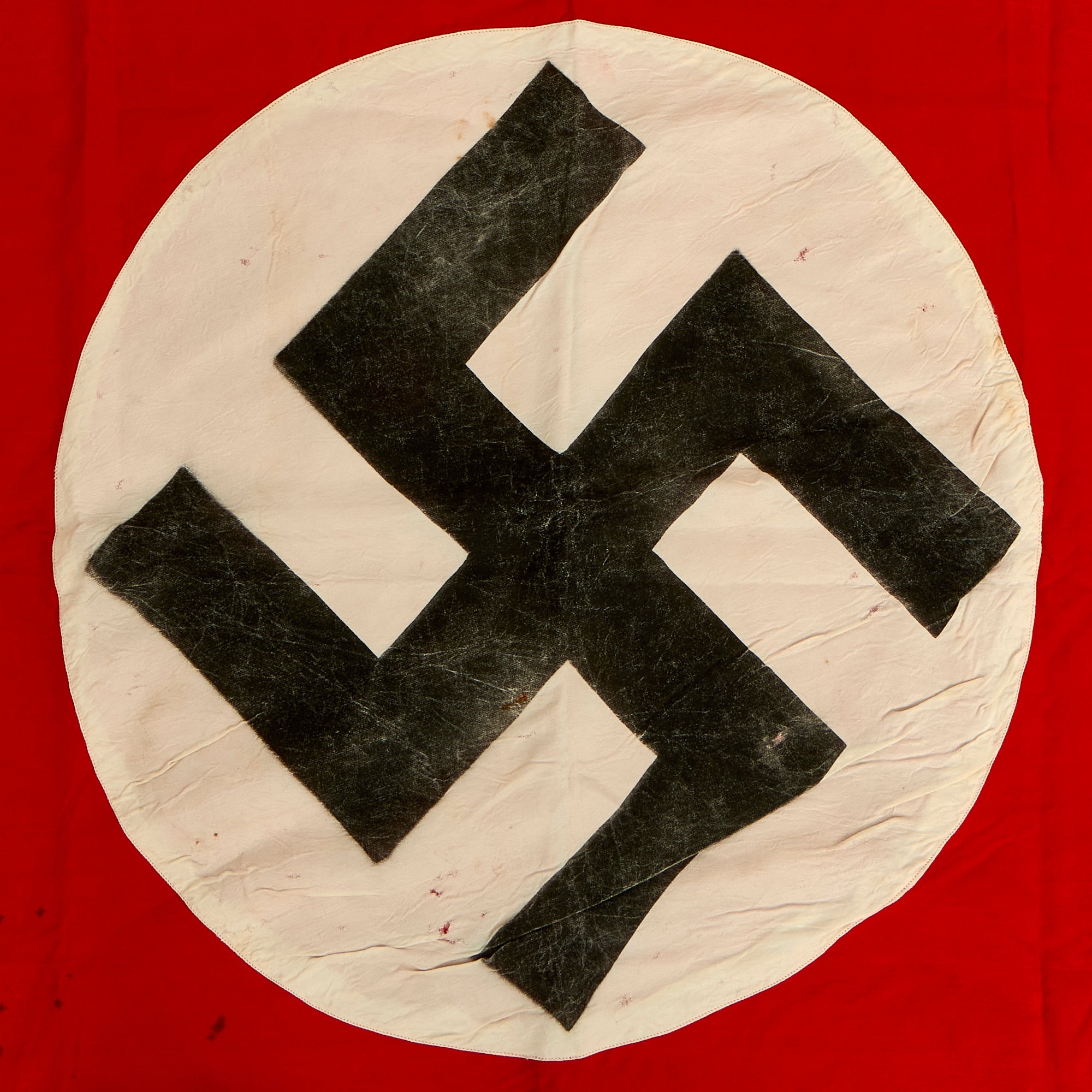 Condition of the flag shows use and wear, with some light staining and tears on the flag. The rayon central circle shows age related deterioration, and there is some wear to the swas insignia as well.