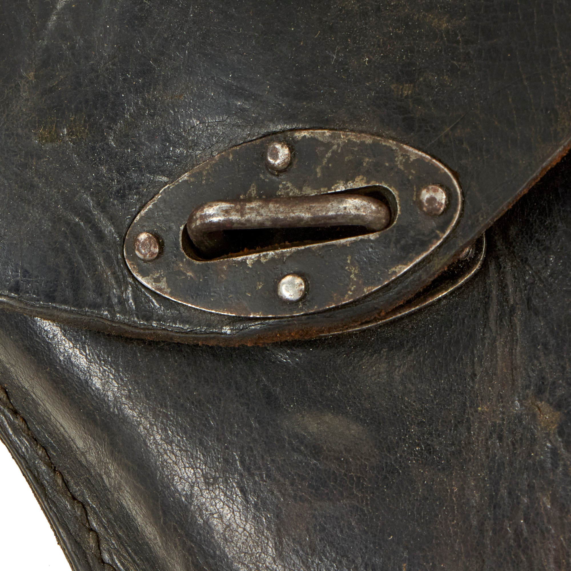 The holster is complete and in very good service-used condition, showing the expected wear from long service. The black exterior finish is worn to look brown in many areas, and the stitching shows wear and staining. The stitching in some areas is a bit loose, but we do not see any major popped stitches.The metal hardware shows light oxidation. The leather has gotten somewhat stiff and there is some cracking on the securing strap finish. The pistol ejection strap is still present and looks to be functional. There is a US Soldier’s laundry number on the back, D-2657, likely belonging to the soldier who captured it.