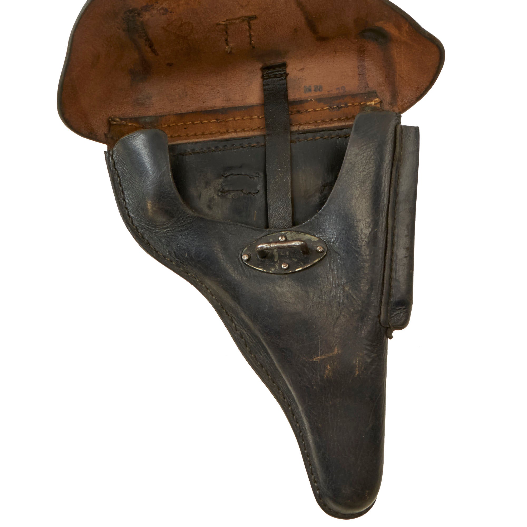 Original Item: Only One Available. Just purchased from a private collector, this is a very nice WWII issue Black Hardshell holster for the standard issue Walther P38 pistol, complete with correct period markings. It has definitely seen a lot of service, and appears somewhat brown in color, but the interior definitely shows that it was originally black.
