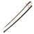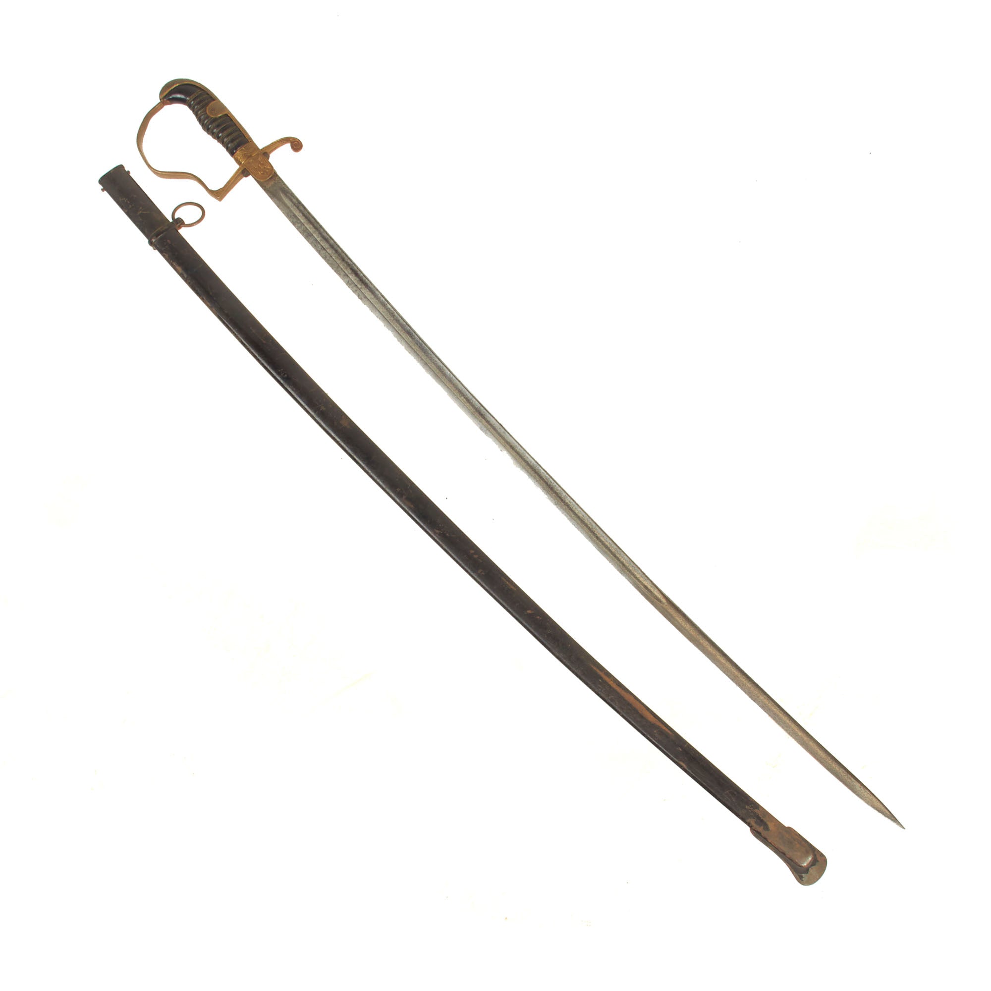 The blade is 31 1/2 inches long, showing a worn oxidized patina. As mentioned previously, we cannot tell if this blade was originally plated and that degraded, or whether it was made as bright steel. It is still correctly unsharpened. The original leather blade buffer is still present, showing some wear from age.