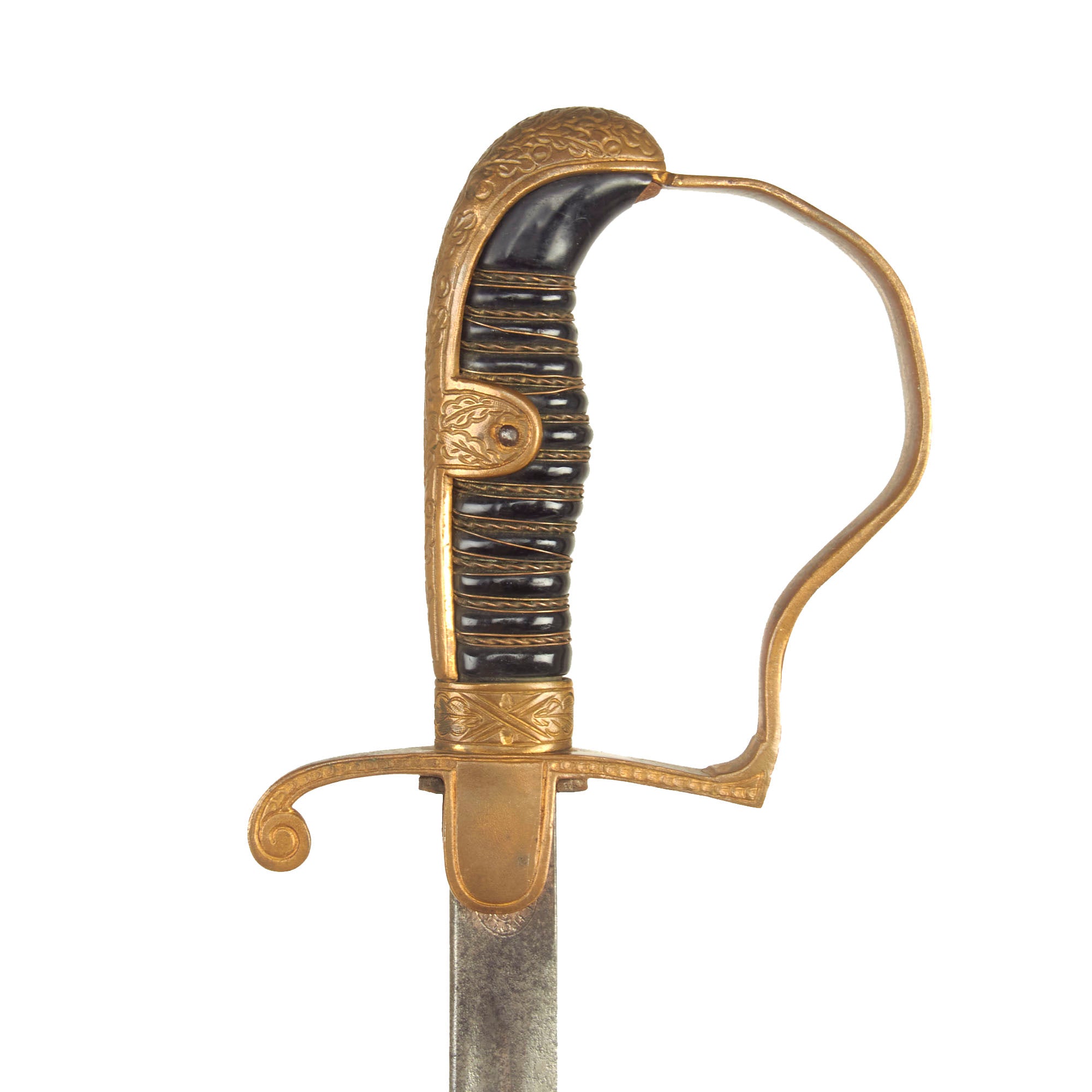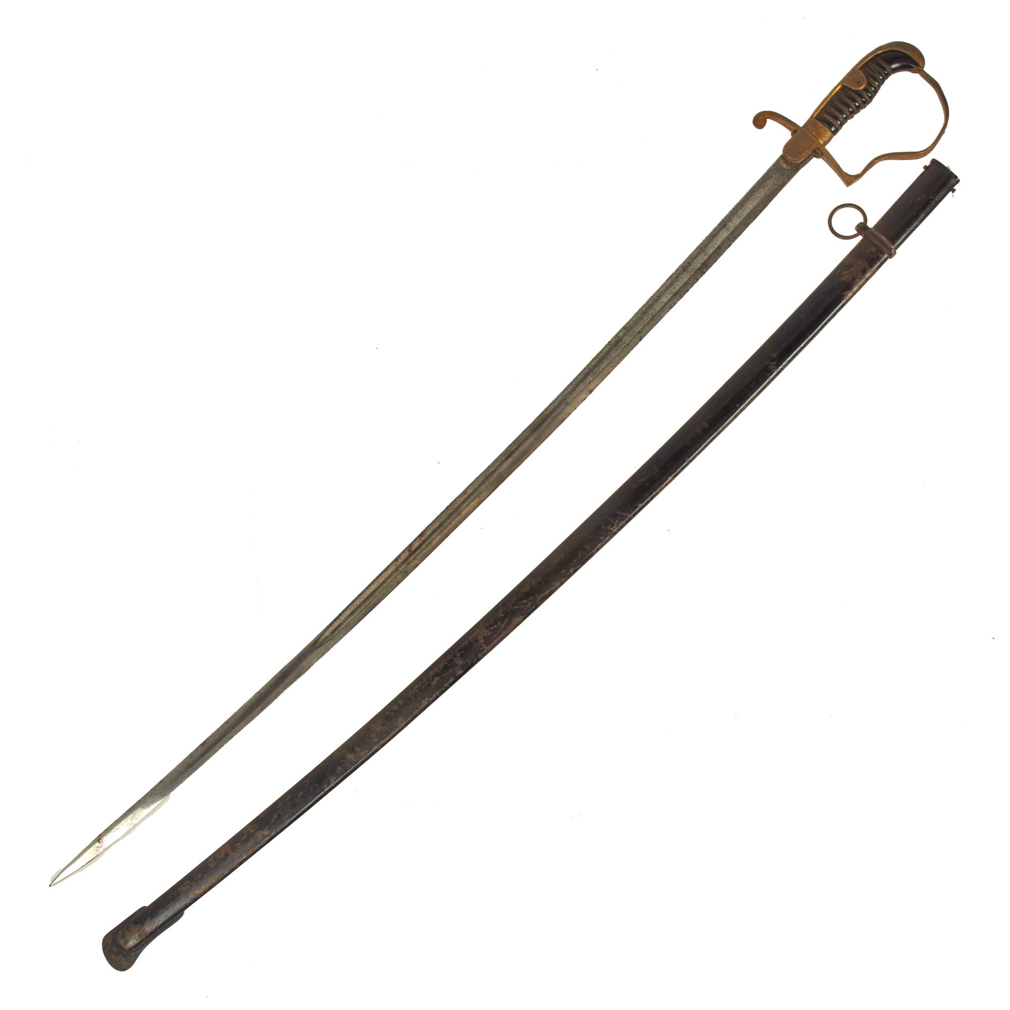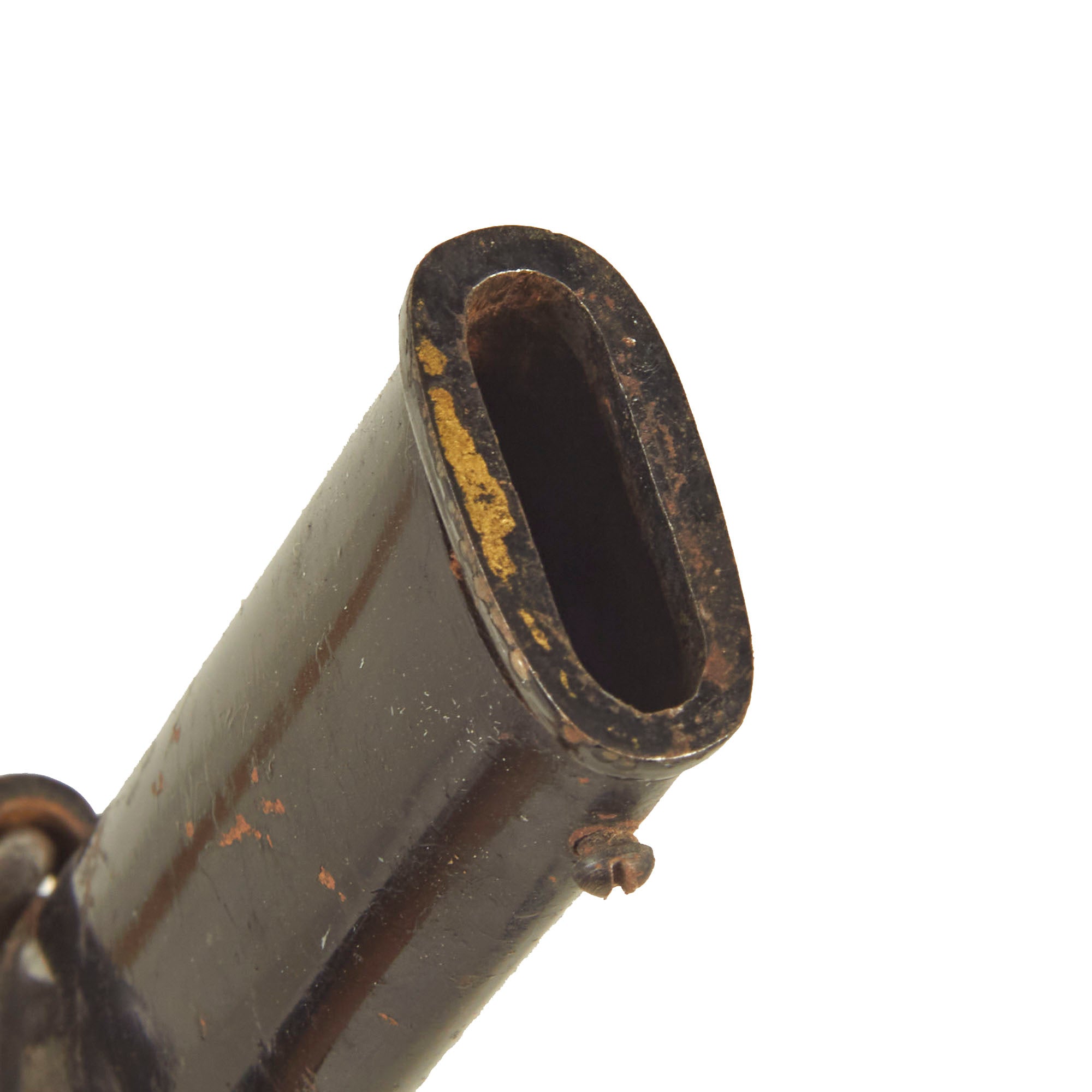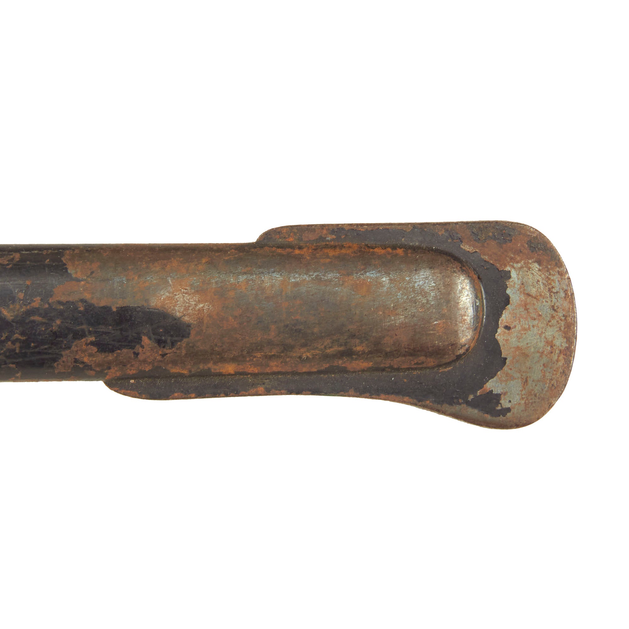 The black paint of this scabbard is still in good shape, though it definitely does show some wear and oxidation from age. There is checking and crazing throughout, only possible due to years of age. There is a slight bend to the scabbard body, and there are definitely areas where the finish has chipped and worn away on both sides of the scabbard. The finish is probably retained at about 75%. The scabbard still retains the original hanger ring and flat loop to hook on the belt hanger.
