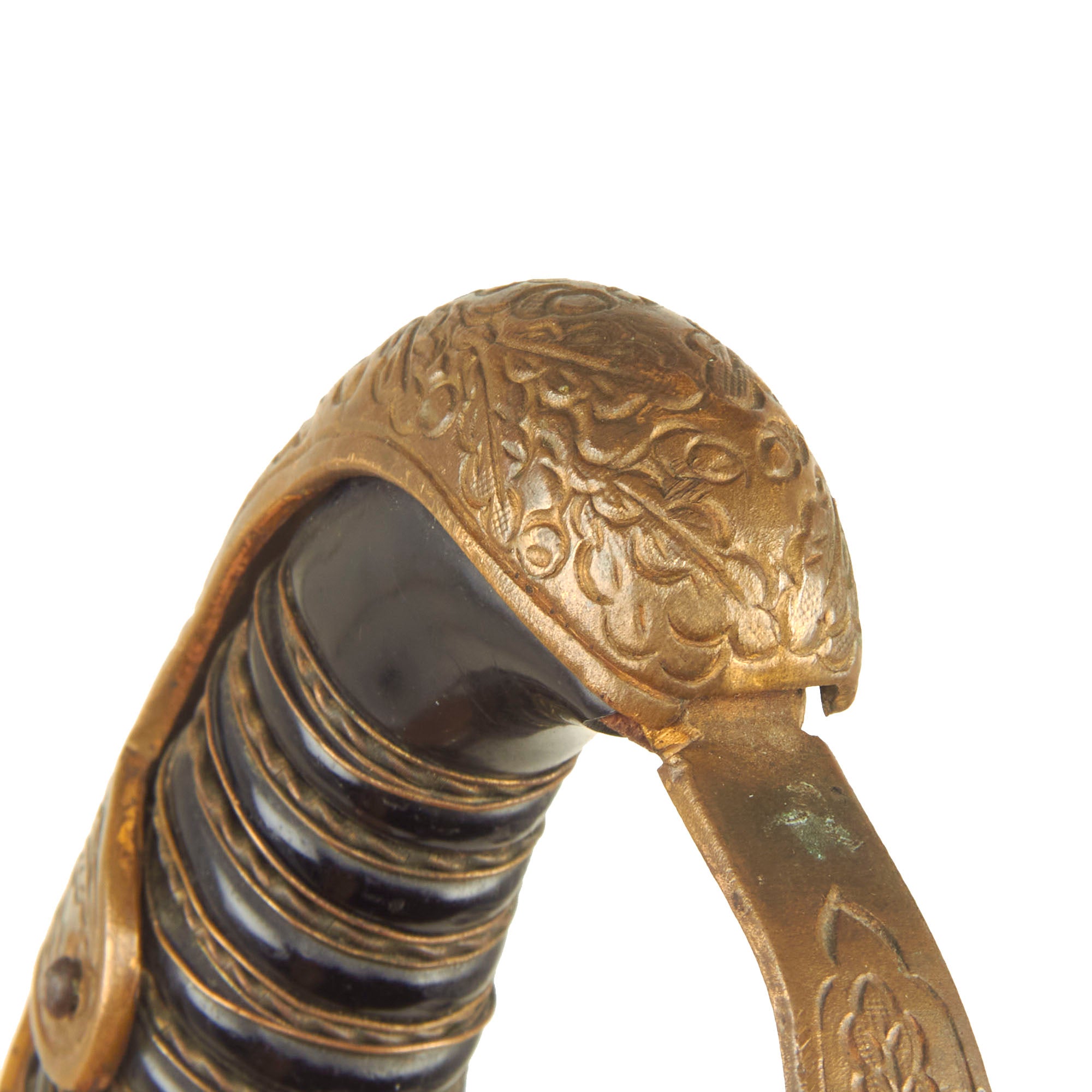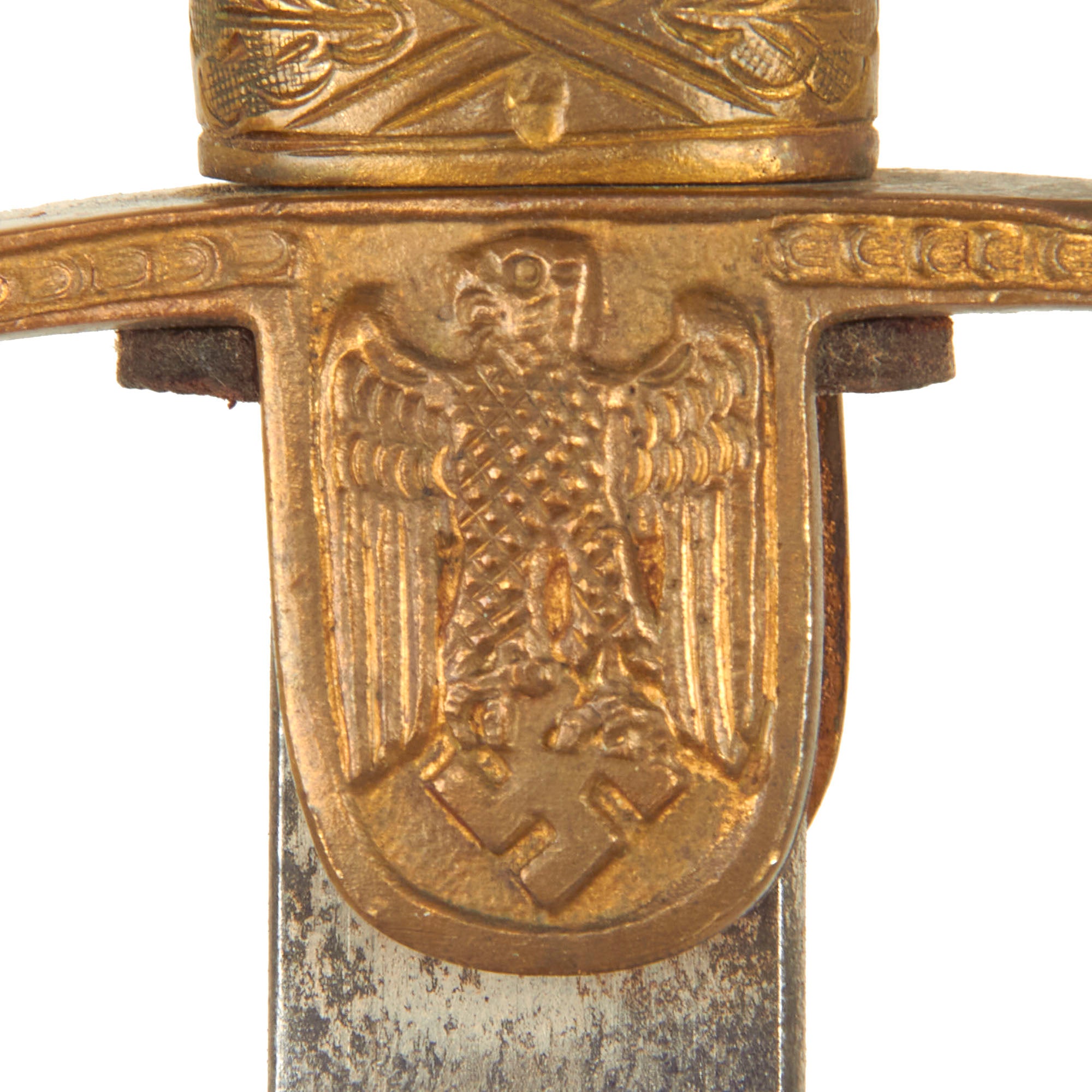 The hilt on this example is the classic gilt brass alloy, not the later war plated aluminum. Like most we see, the gilding is only really retained in the recesses of the design, with the rest of the metal faded to a lovely "mustard" patina. The overall design is a bit of a departure from the other examples we have seen, which mostly take after the "Field Marshall" series of Carl Eickhorn. The dove head and backstrap are embossed with the classic German oak leaves and acorns motif, which extends onto the side tabs. The "flat" P guard has the same motif, as does the brass ferrule. There are lots of hand enhancing visible, especially on the cross guard area.