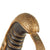 The grip of this example is a black celluloid over a carved wood base. The celluloid is still in very good condition, with only a chip on the very bottom near the guard, showing the underlying wood. The grip is wrapped with three pairs of twisted brass wire, with the center pair being larger, and the wrapping is fully intact, though definitely loose and a bit bent. There is some dirt and oxidation around the wires, and they show a dark oxidized patina. The grip and guard are still solid on the blade tang, while the back strap and ferrule have some play in them. The guard is also definitely bent and somewhat deformed, which is probably what cracked the grip. This definitely looks like an officer sword that saw long service in the field.