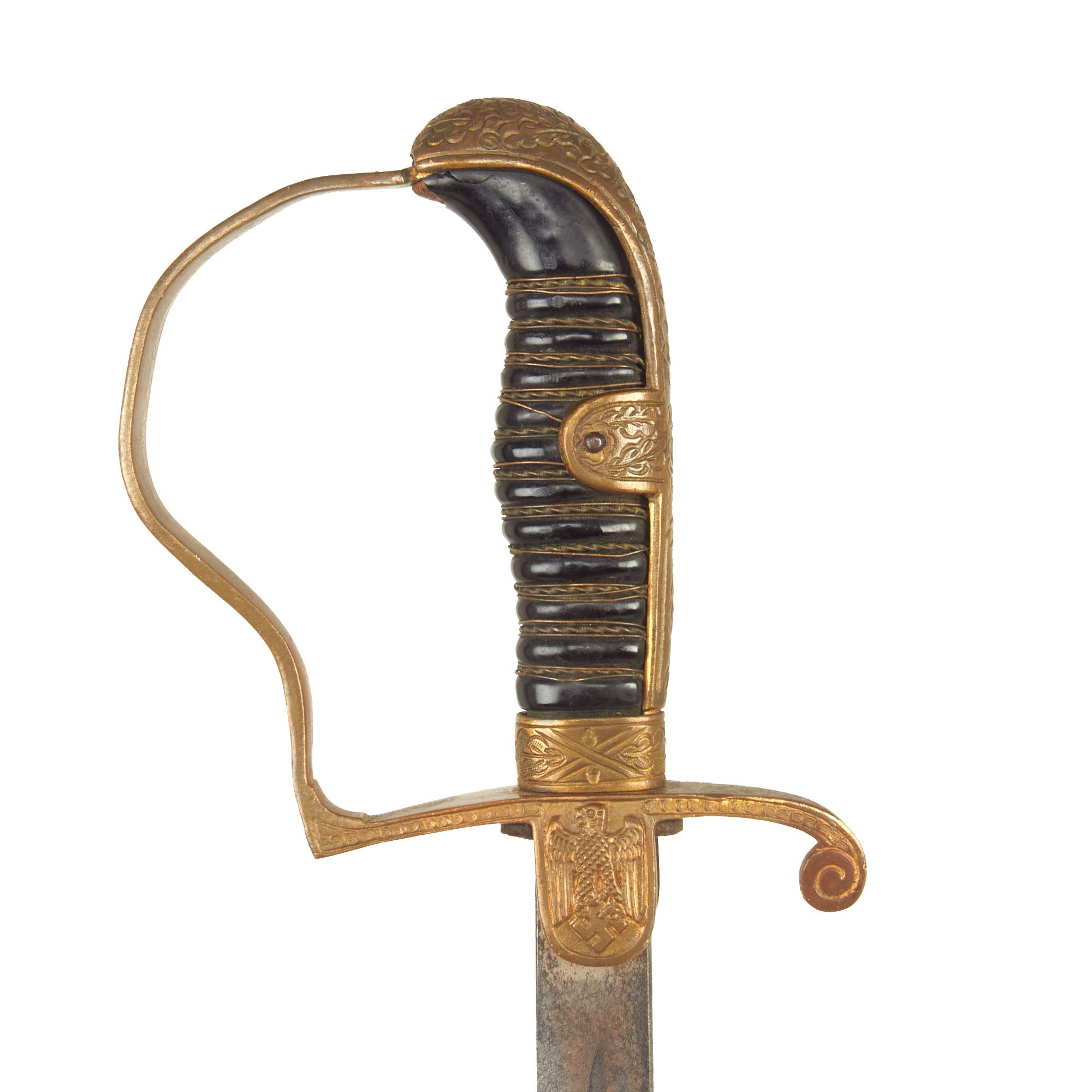 Original Item: Only One Available. This Army Dove Head Sword is a very nice service used example, made by the firm F. W. Höller of Solingen, the legendary "City of Blades" in Western Germany. It comes complete with the correct steel scabbard, and unlike most, looks to have an un-plated steel blade. Either that, or it became oxidized and was heavily cleaned, and then had additional oxidation occur.