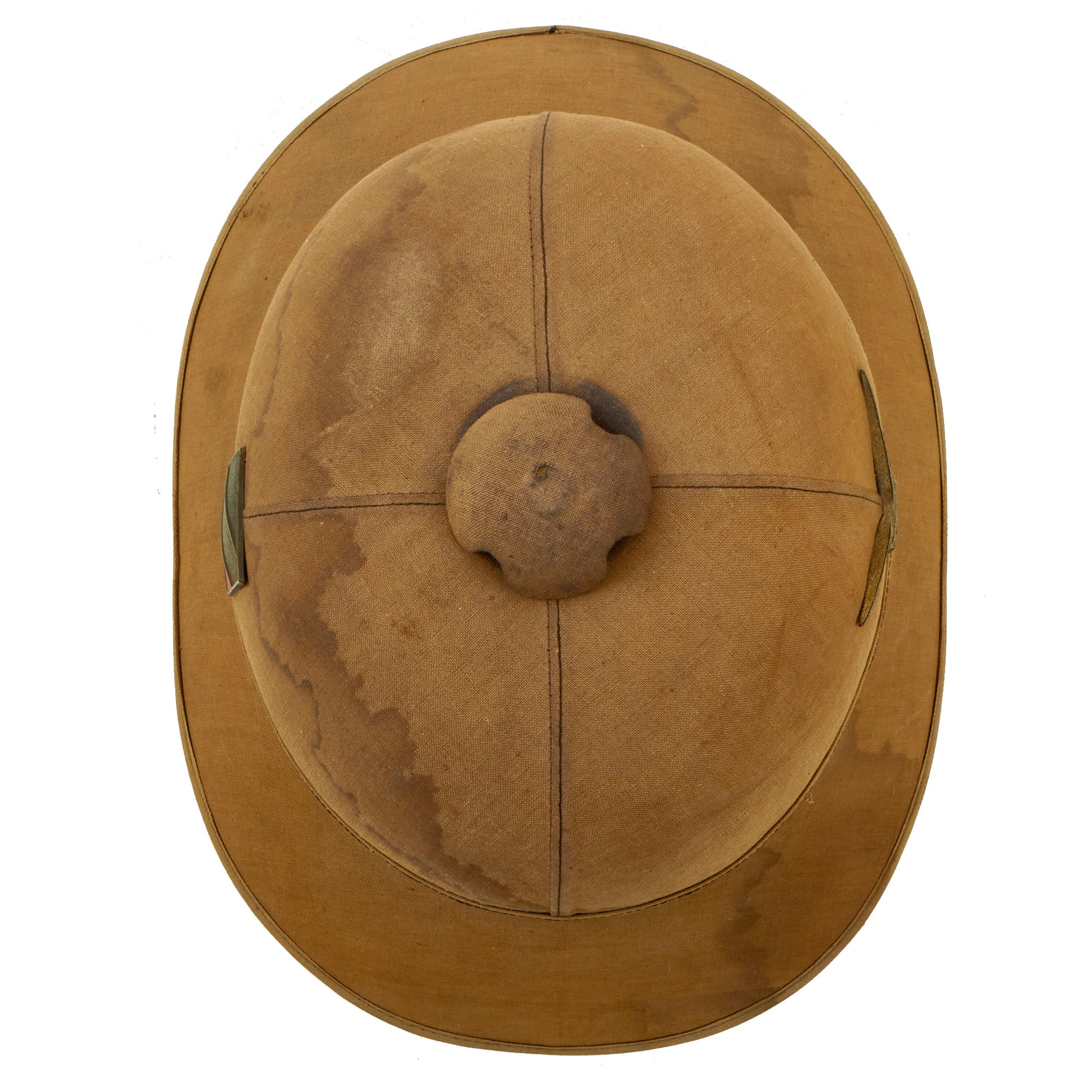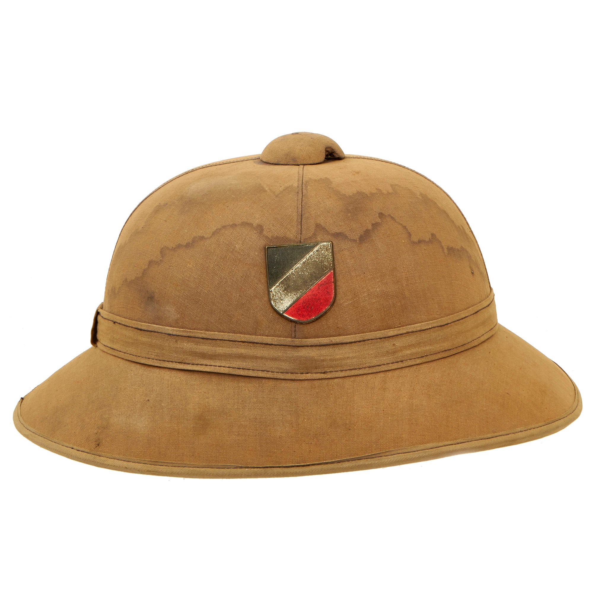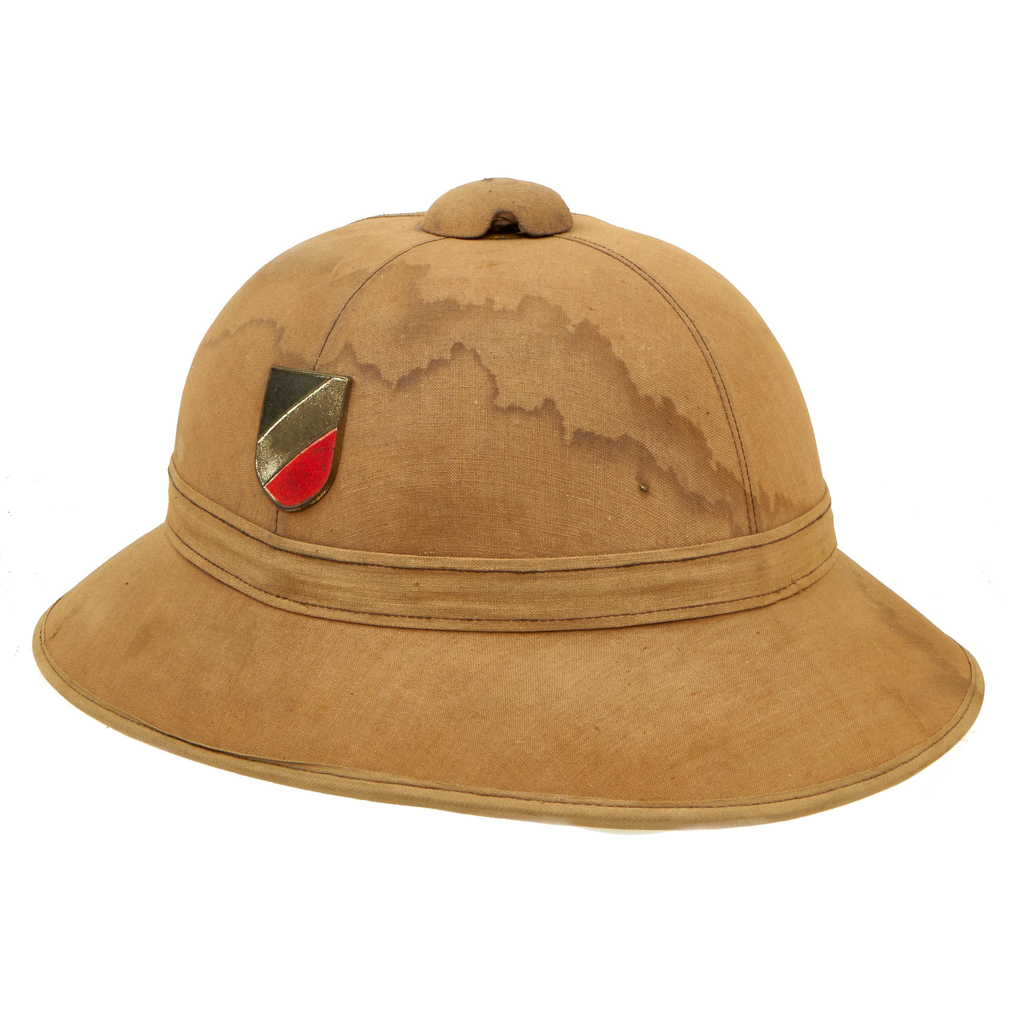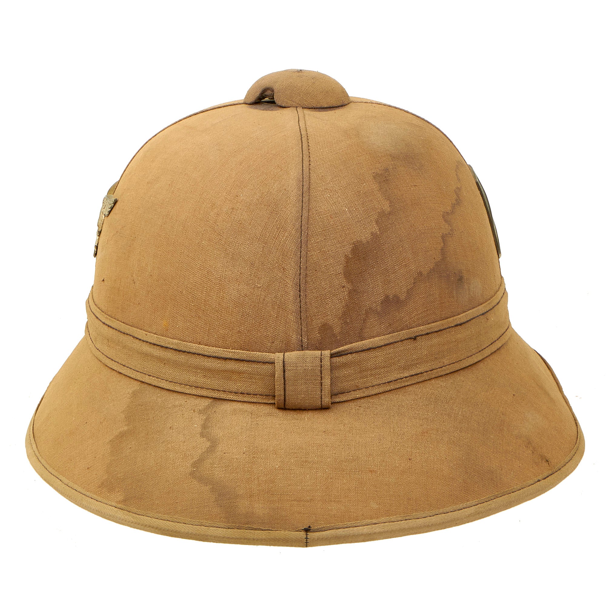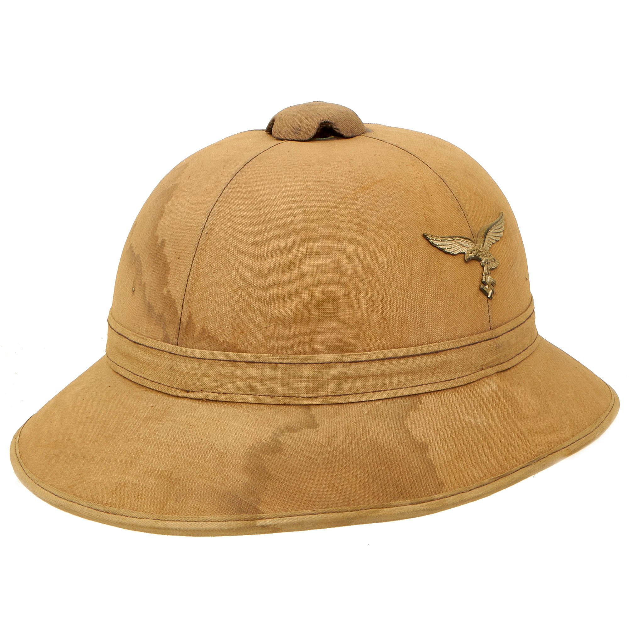 Original Item: On first deployment to North Africa in 1941, Deutsches Afrikakorps (DAK) troops were issued with the traditional European sun helmet known as Tropische Kopfbedeckung, of the type known to the British forces as the solar topi (or topee). In the German case, these were made of pith, were khaki in color and bore two metal shields; on the right the national colors and on the left the German eagle. There were several models made, with the first model having cotton outer covering made of six fabric panels sewn together.